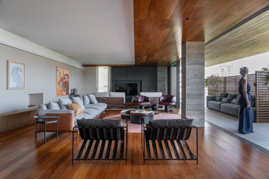 A área social, composta por salas de estar, jantar e TV, se integra à varanda gourmet por meio de amplas esquadrias de correr piso-teto, que também conectam esse espaço à cozinha, criando um ambiente fluido e contínuo. Por todos os 300m² do apartamento, elementos autorais dão o tom, como o banco angular e assimétrico em marcenaria, que acompanha a lareira e define a atmosfera do estar.