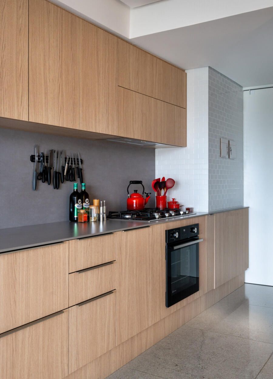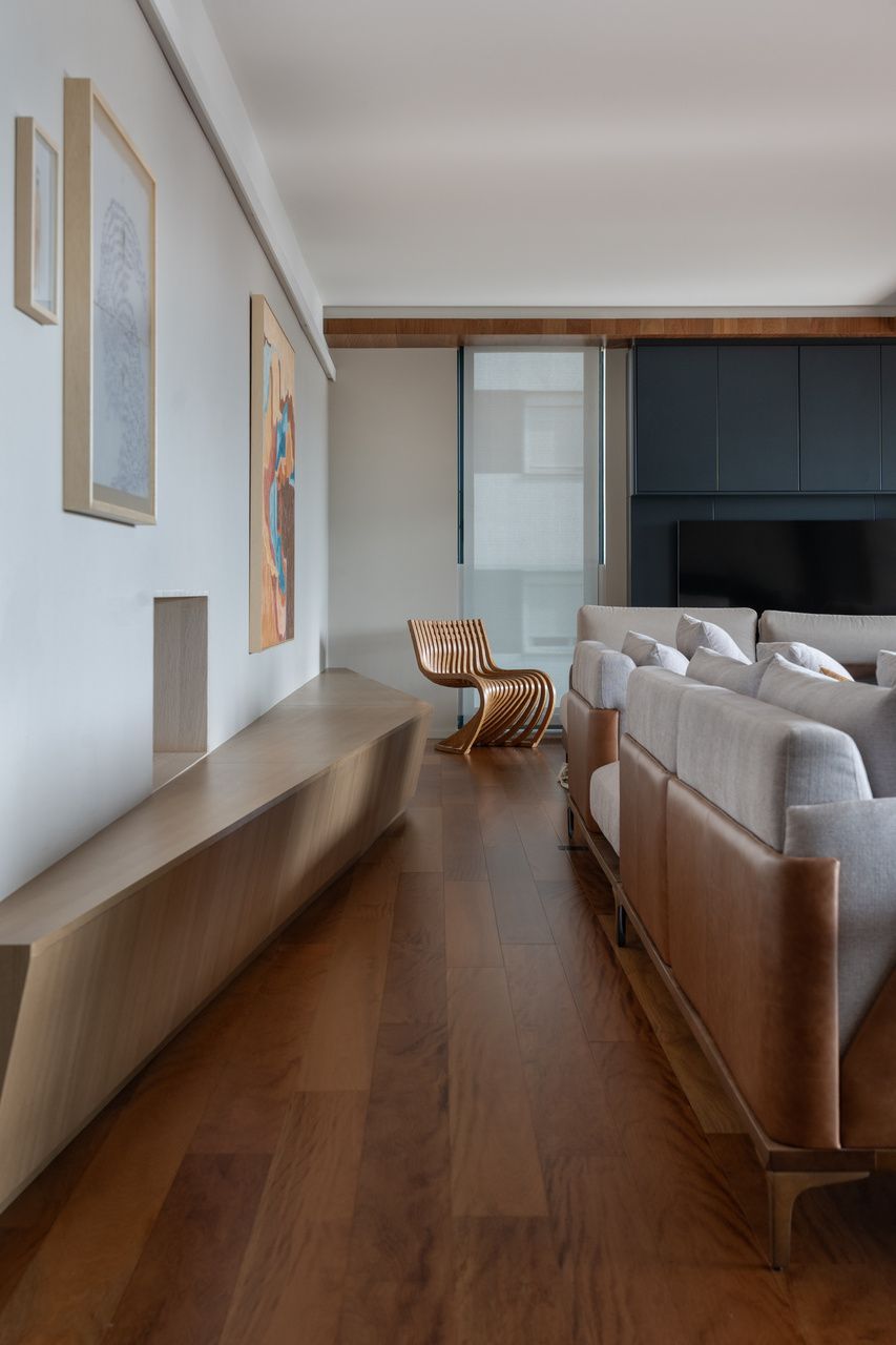 Como uma “tela em branco”, praticamente todos os ambientes do apartamento foram contemplados no projeto de arquitetura e decoração. Na parte estrutural, duas paredes que antes delimitavam o hall de entrada foram removidas, assim como a porta original, permitindo a integração do ambiente com o living. Essa nova configuração deu espaço também à criação de um armário-painel em “L”, de madeira clara, que percorre toda a parede de transição entre as áreas social e íntima, solução de marcenaria que também reveste a porta do elevador e camufla a porta de acesso ao corredor íntimo.