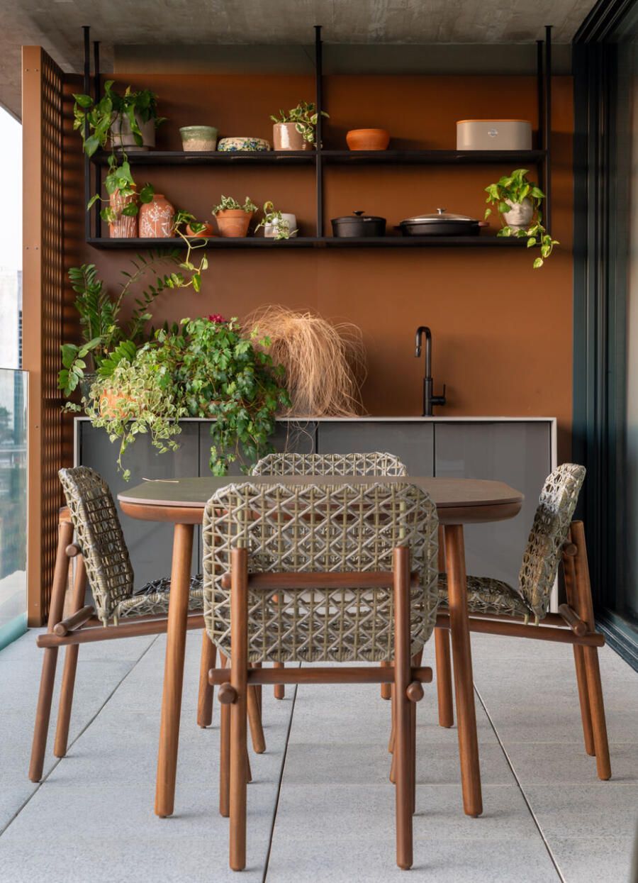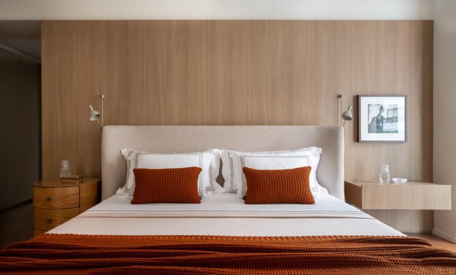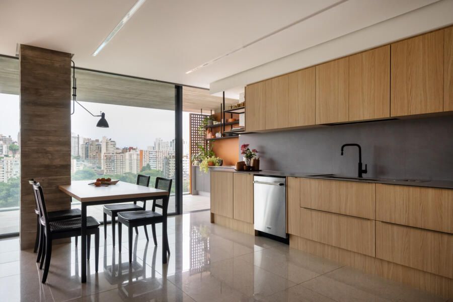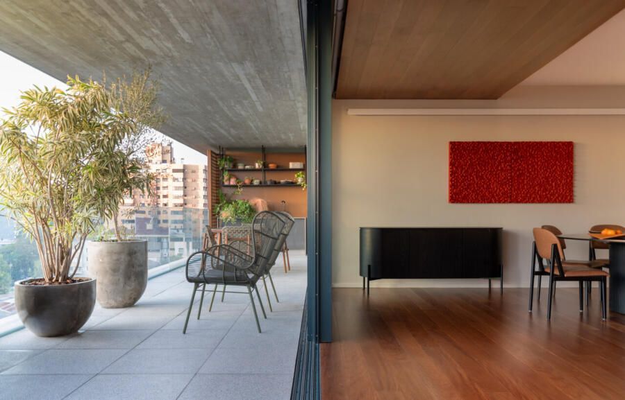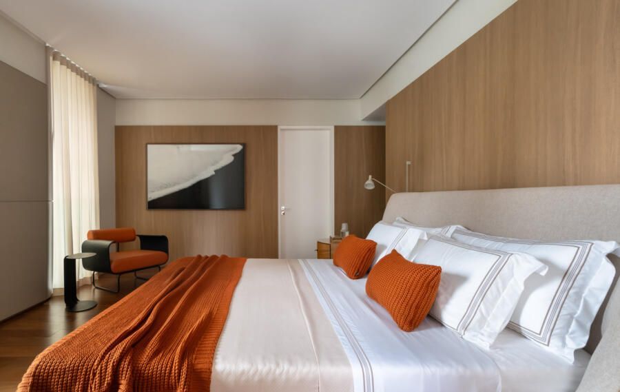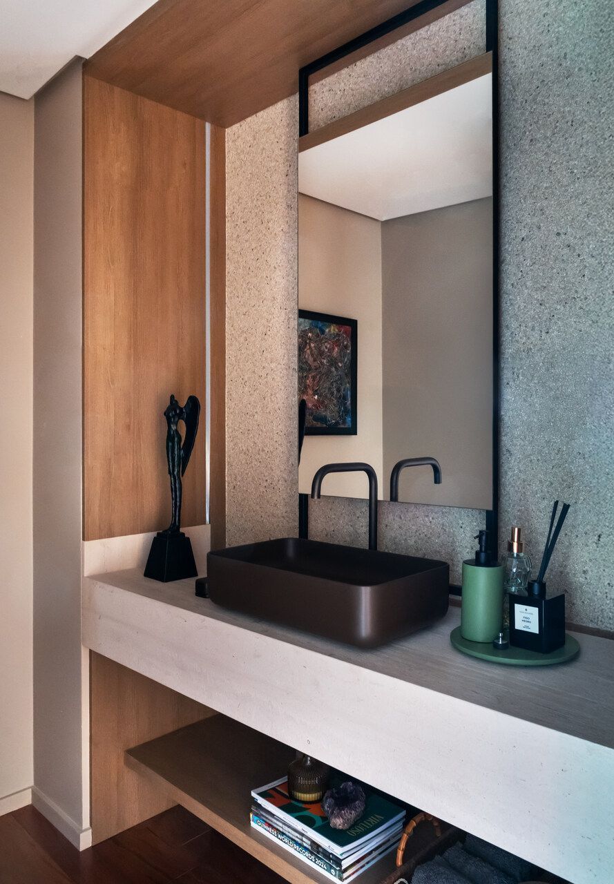 Já na decoração, peças de design assinado e marcenaria sob medida, desenhada pela própria arquiteta, dão personalidade aos ambientes. A paleta de cores valoriza os materiais naturais e aposta em tons quentes, com destaque para a madeira, além de toques pontuais de azul petróleo, vinho, verde-musgo, rosa antigo e vermelho, presentes em mobiliário e obras de arte. Entre os destaques, estão criações dos designers Luan Del Savio, Daniela Ferro, Gracia Mendes, Luisa Moysés, Salva, Alain Blatchè e Roque Frizzo.