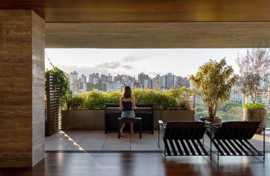 A arquiteta destaca que o ponto de partida do projeto foi a própria linguagem do edifício, complementada pelo livro Primeira Pessoa, com reflexões de Weinfeld e da paisagista Sandra Ling, que serviu como norte conceitual.