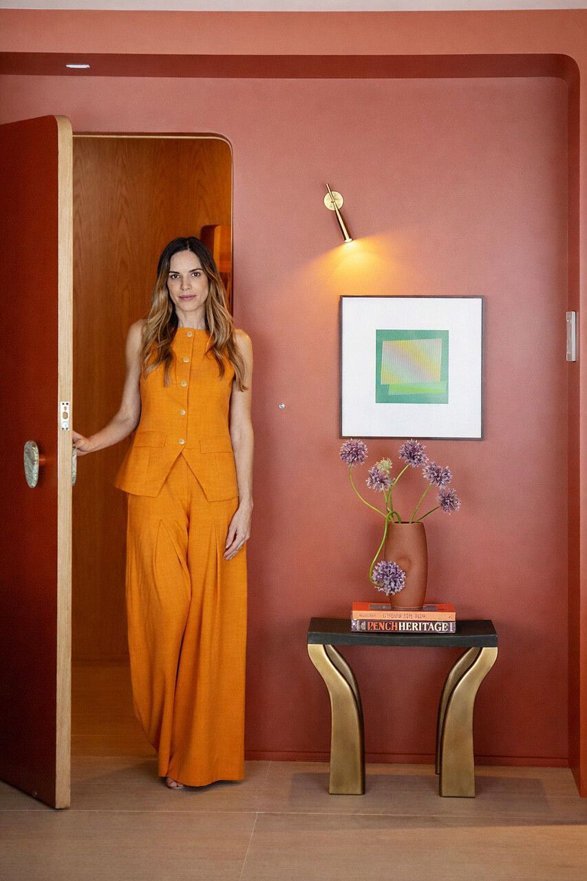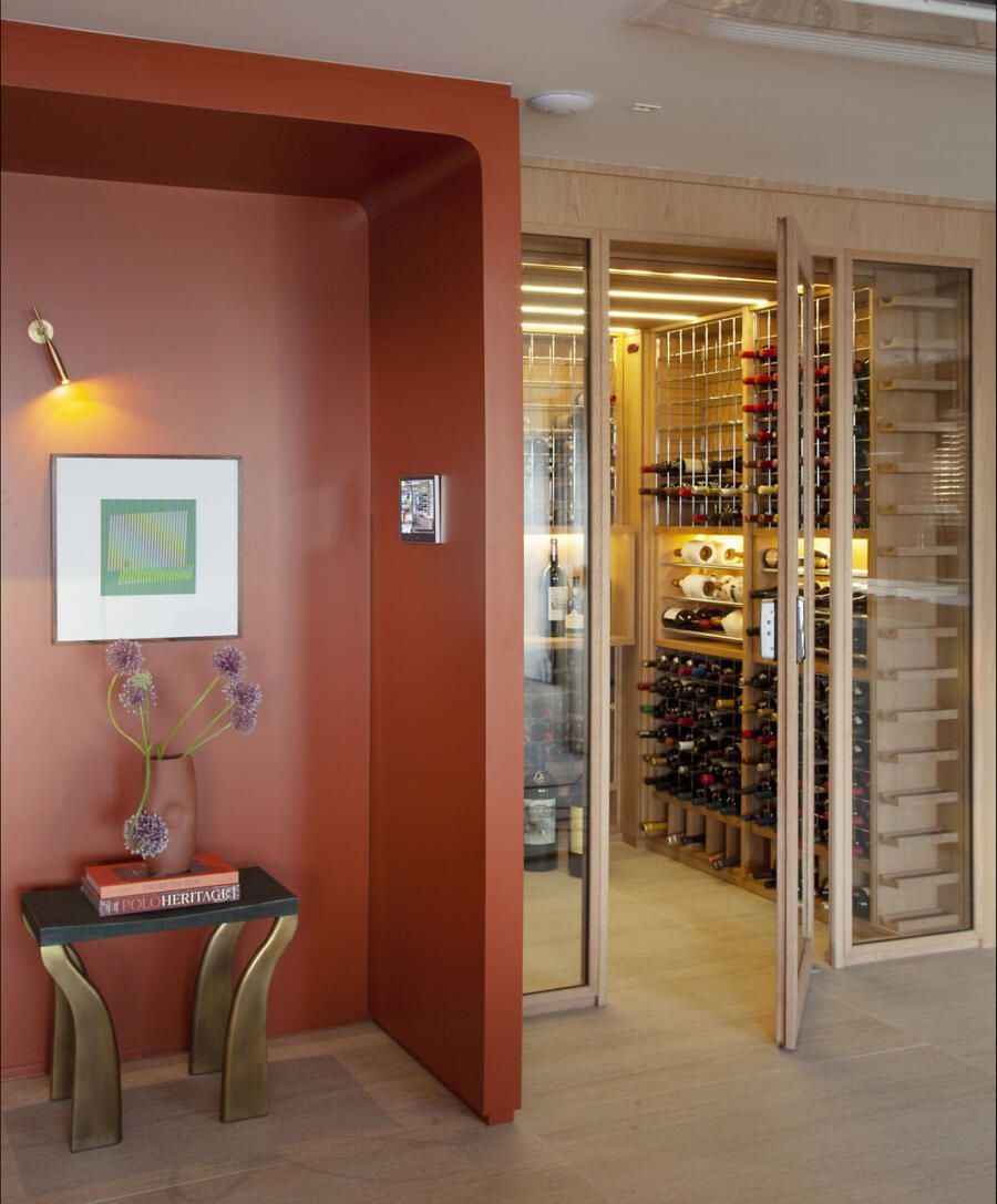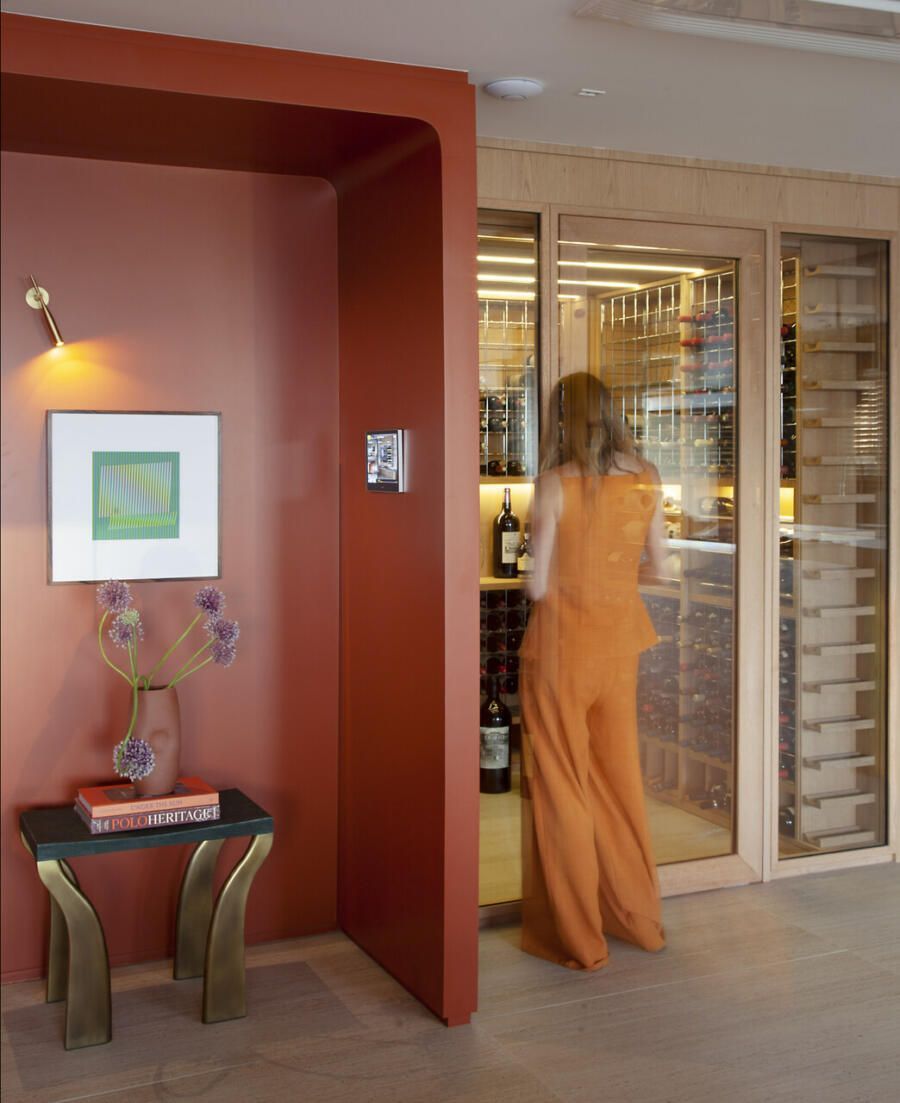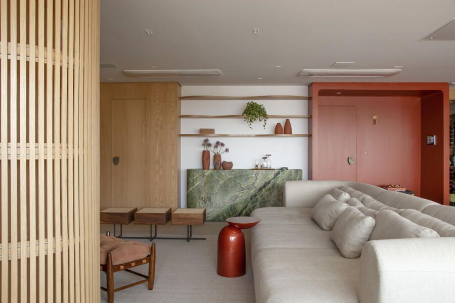 Logo na entrada, Deborah concebeu um gesto arquitetônico marcante: um pórtico pintado em um tom fechado de terracota. O elemento ajudou a criar um hall que não existia na planta original e ainda serviu como recurso para integrar funções importantes. De um lado da porta foi embutido o bar; do outro, surgiu a adega climatizada, instalada no espaço que anteriormente abrigava o quarto de serviço.