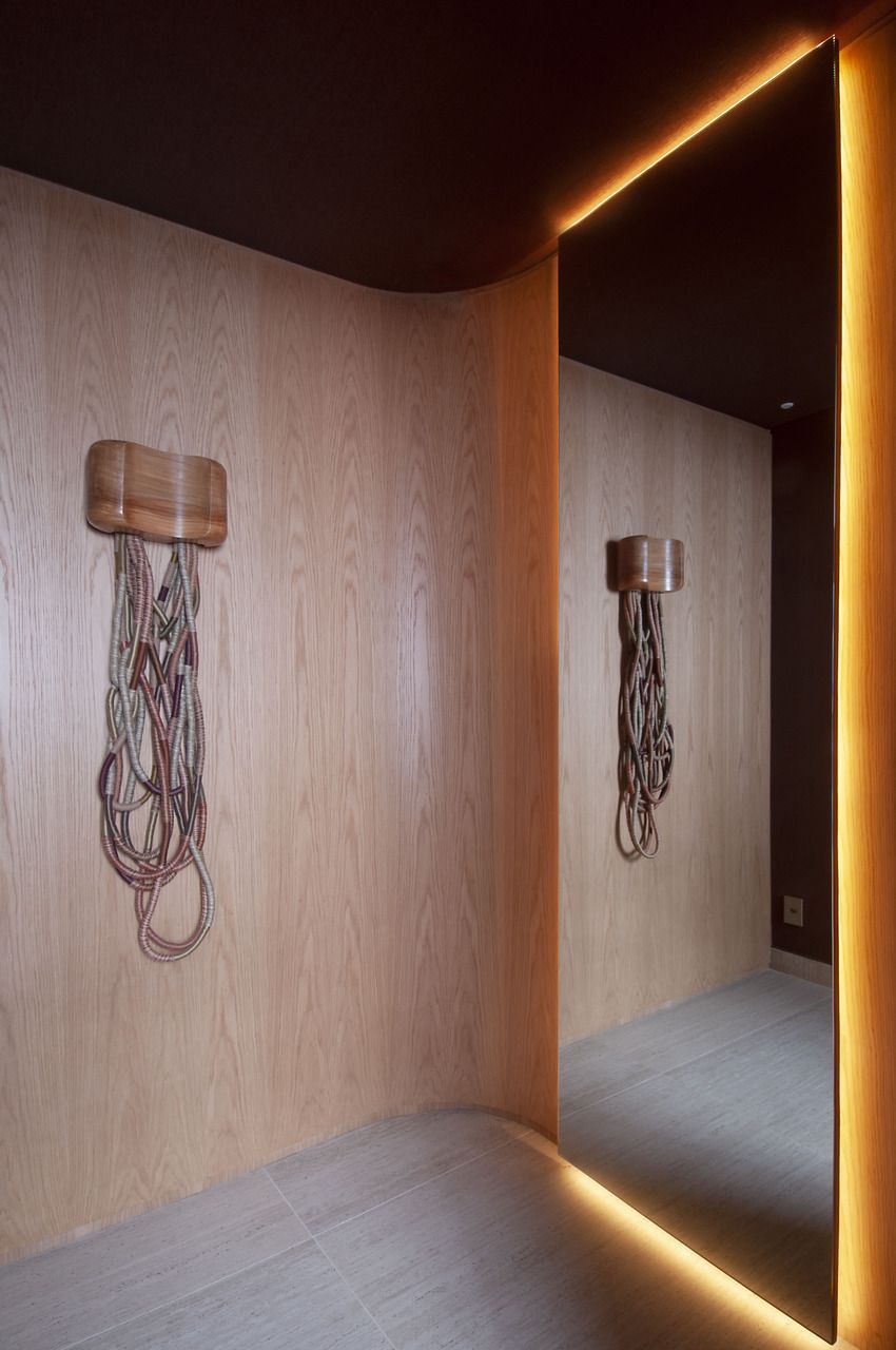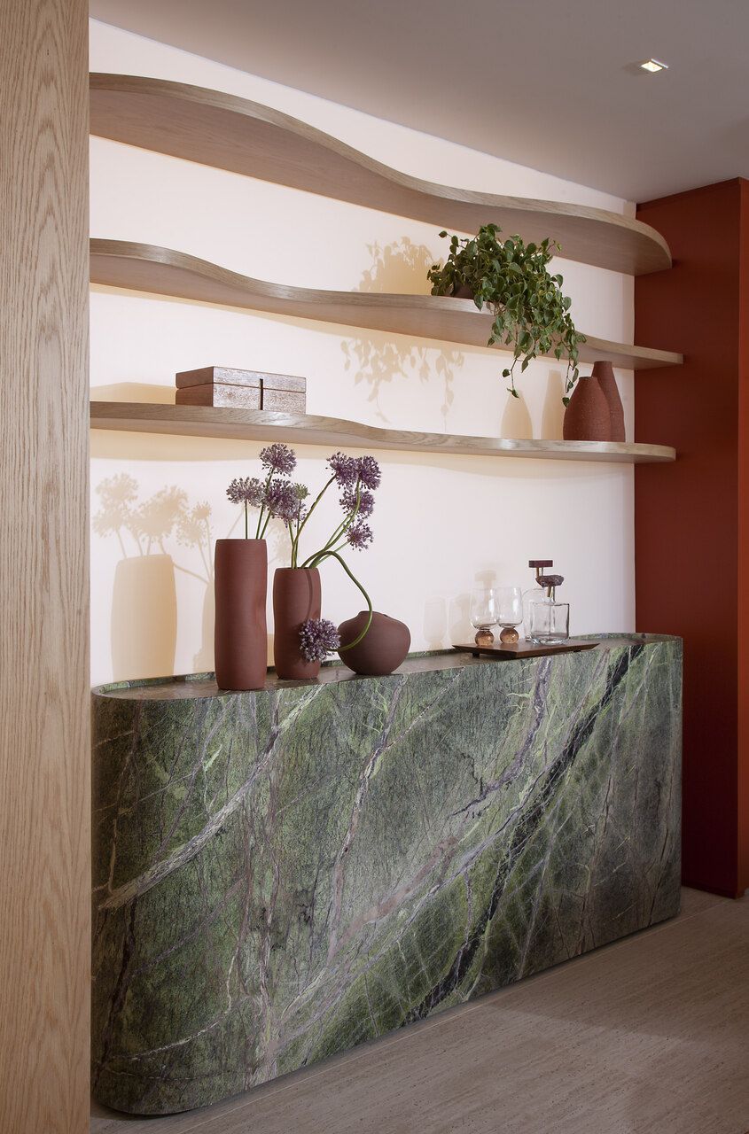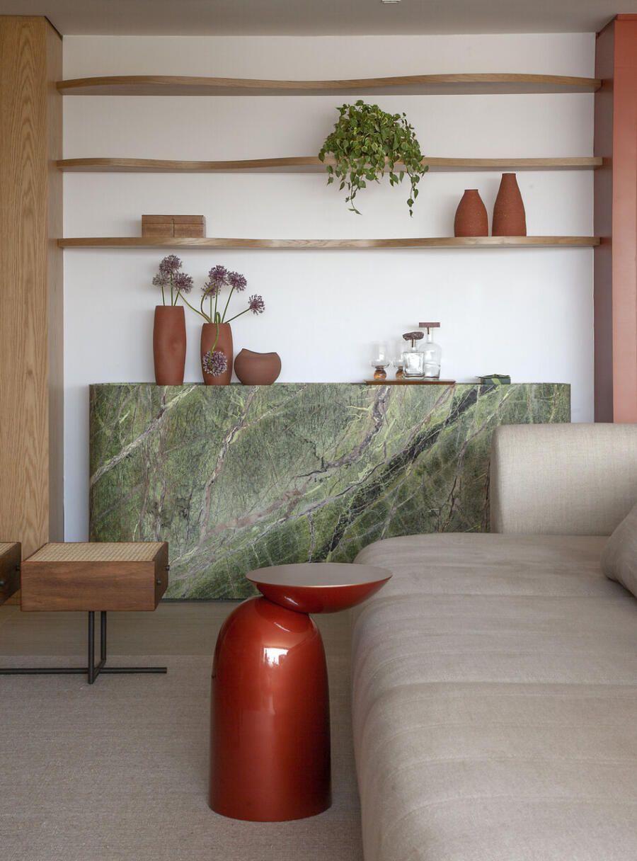Logo na entrada, Deborah concebeu um gesto arquitetônico marcante: um pórtico pintado em um tom fechado de terracota. O elemento ajudou a criar um hall que não existia na planta original e ainda serviu como recurso para integrar funções importantes. De um lado da porta foi embutido o bar; do outro, surgiu a adega climatizada, instalada no espaço que anteriormente abrigava o quarto de serviço.