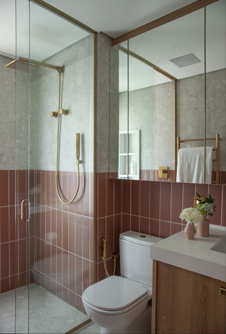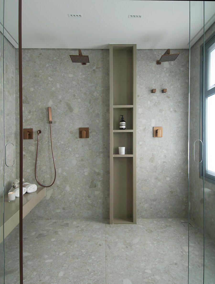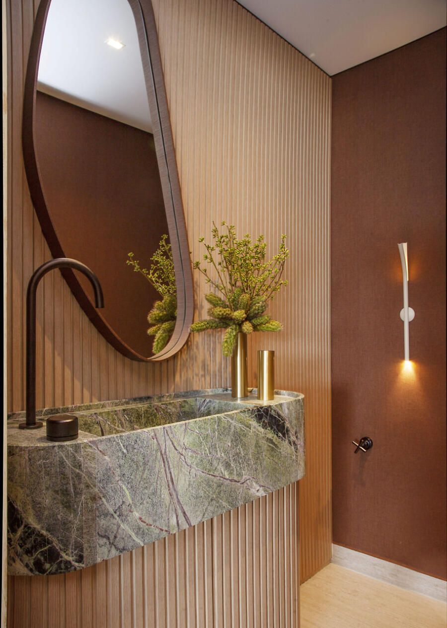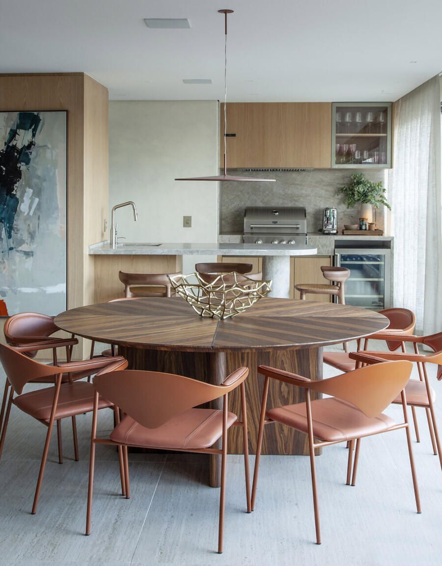 O restante do projeto parte de uma paleta equilibrada, composta por tons terrosos claros e médios — do off-white e do barbante ao marrom — que aparecem tanto nos revestimentos quanto na marcenaria em carvalho. Sobre essa base serena, surgem acentos mais intensos, especialmente em terracota, pontuando o ambiente com energia e personalidade.