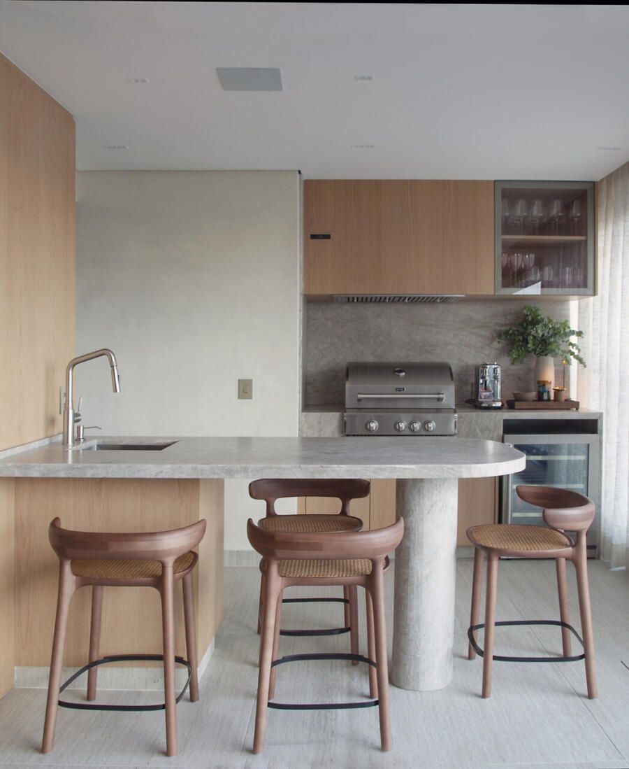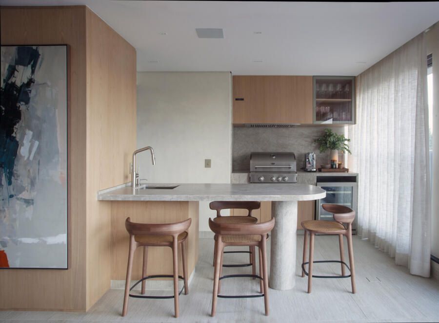 Entre as prioridades do casal estavam uma adega climatizada walk-in, um lounge confortável na sala e uma cozinha aberta para a área social, com a possibilidade de ser isolada sempre que necessário. Deborah organizou esses desejos em um layout fluido, que favorece o convívio sem abrir mão de soluções práticas para o dia a dia.