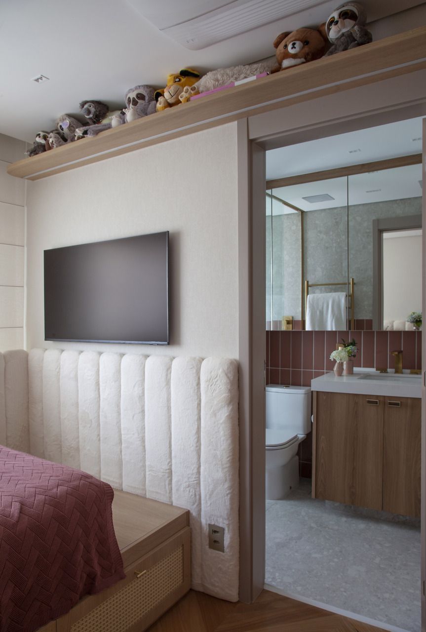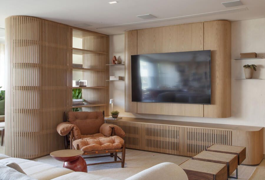 “Com a demolição dessa suíte, surgiu um pilar no living, do qual decidimos tirar partido, envolvendo-o com uma marcenaria curva, ripada e vazada, que se conecta visualmente ao rack e ao painel da TV.”