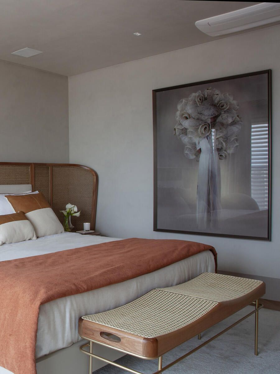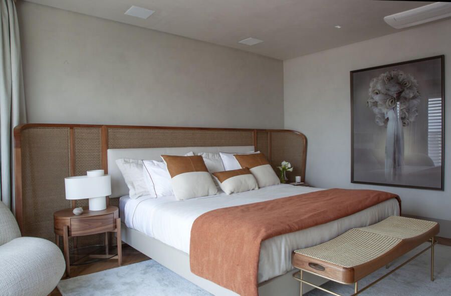 A planta original previa quatro suítes, mas a reforma transformou essa configuração. Uma delas foi integrada à área social para ampliar o living e valorizar a convivência. A intervenção revelou um pilar no espaço, que acabou se tornando protagonista do projeto.