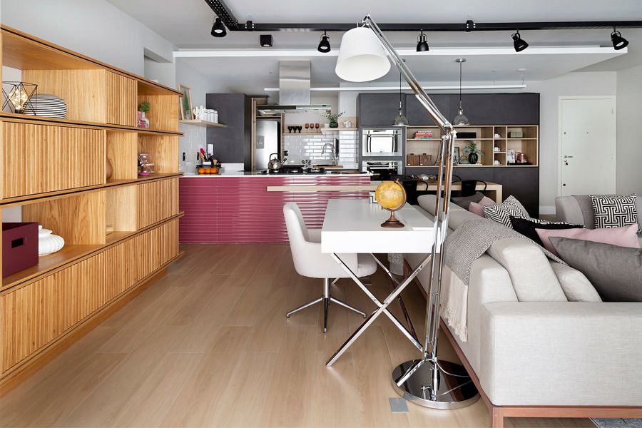 A decoração conta com uma paleta de cores bem definida e detalhes nos tons de rosa, trazendo leveza e feminilidade como a personalidade da moradora. O escritório nos contou, que a cliente diz que está morando em uma casa do Pinterest.