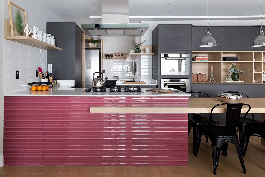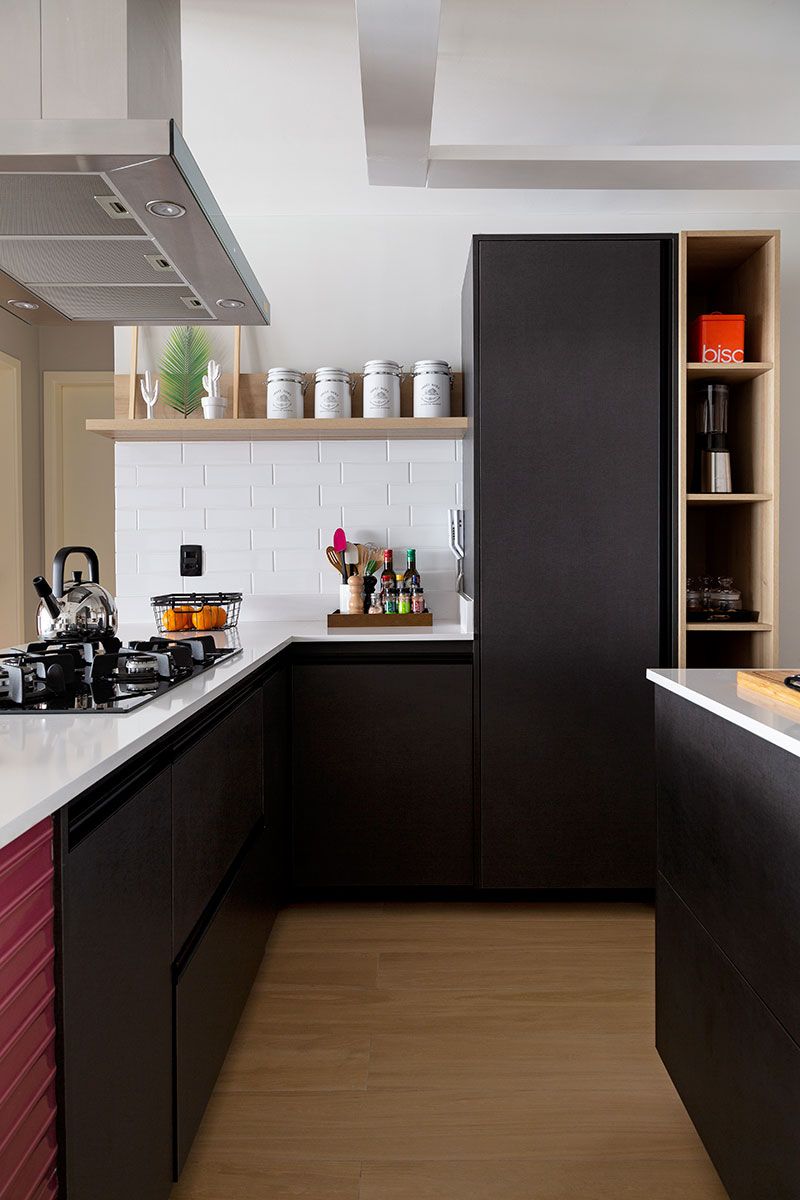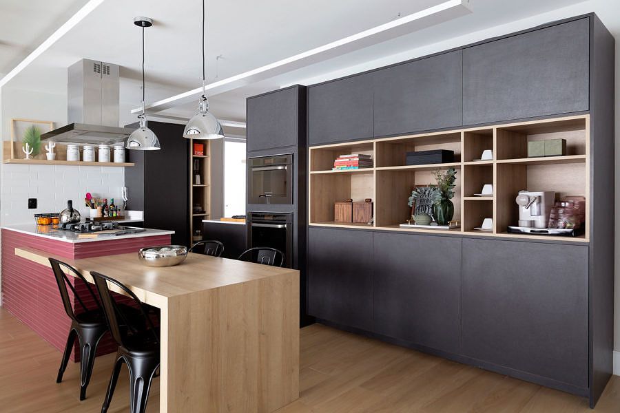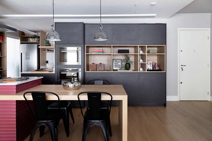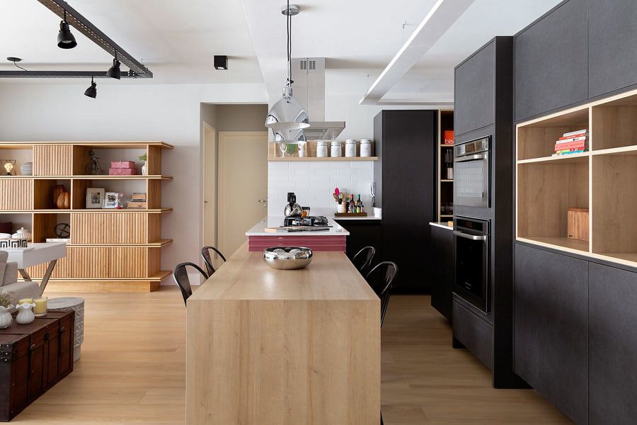 O escritório criou a atmosfera industrial mostrada na inspiração da cliente, mas adaptada para a personalidade e modo de viver. O destaque é a cozinha totalmente aberta e invadindo um pouco da sala, onde está a ilha com o cooktop, integrando totalmente os ambientes e trazendo fluidez para a cozinha.
