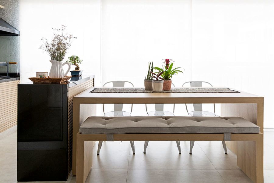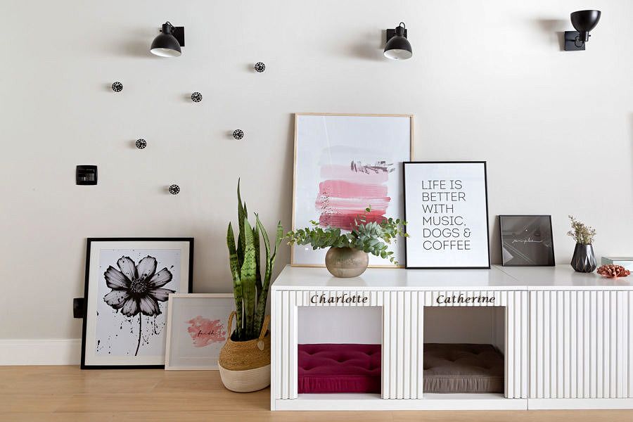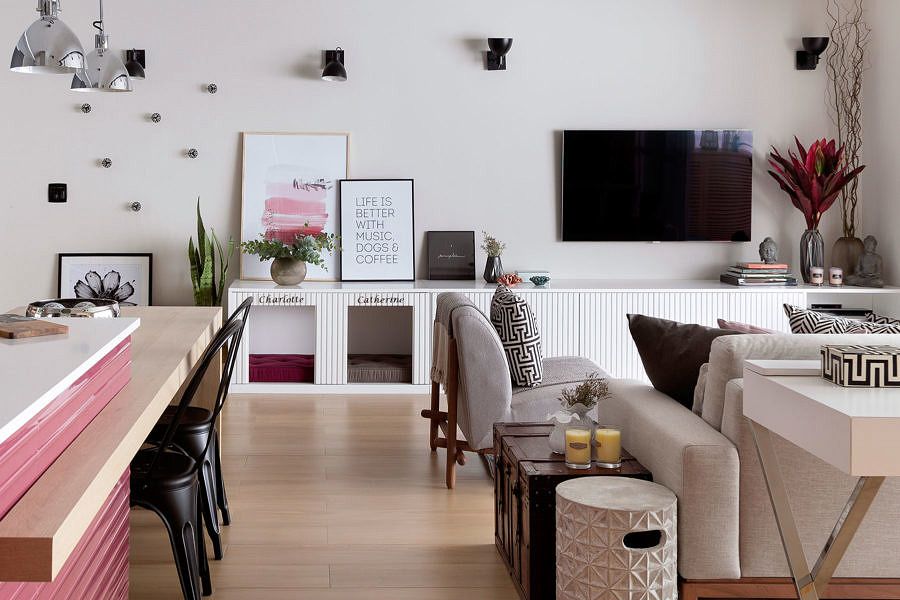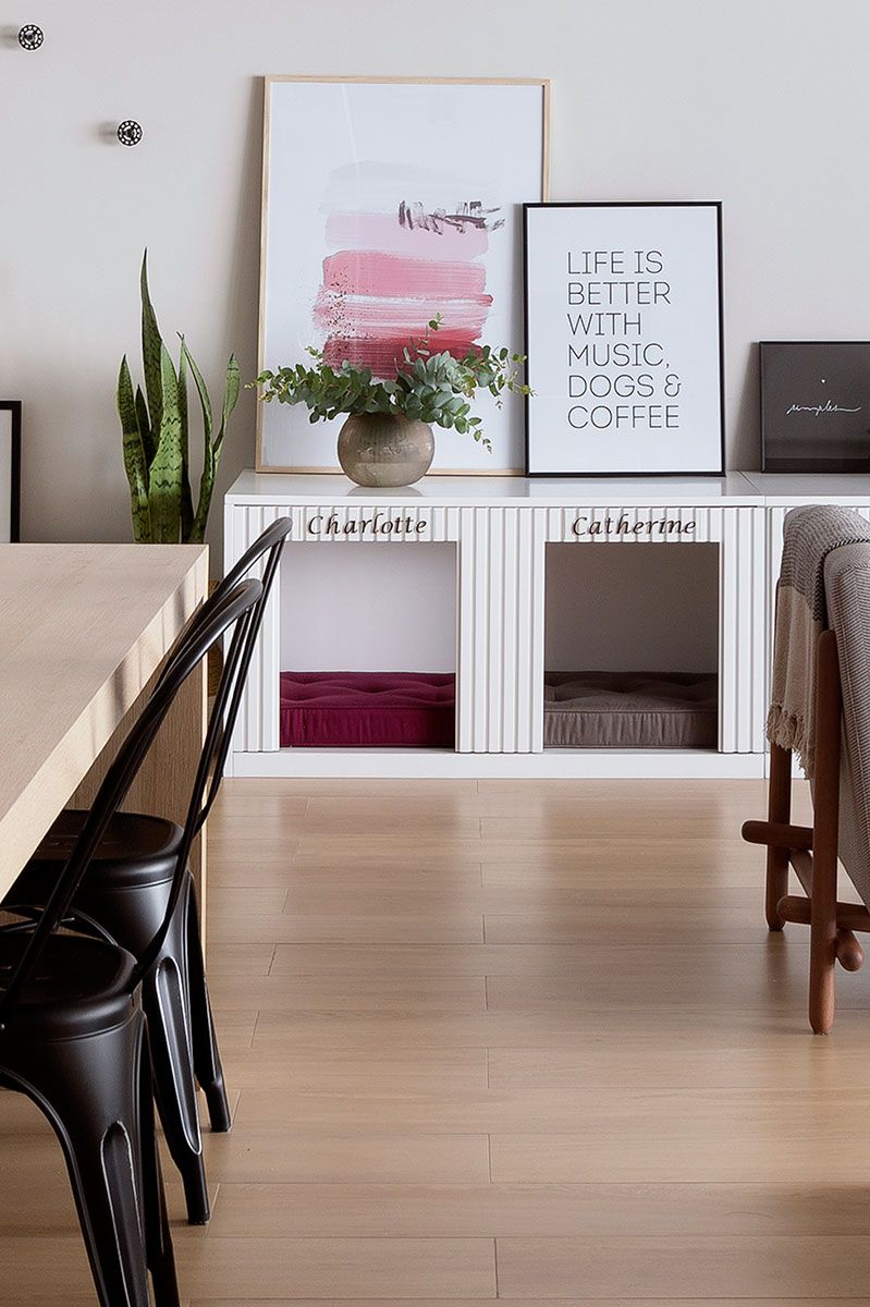 O pedido especial foi que o projeto fosse pensado pelo escritório para ela e suas duas cachorrinhas, Charlotte e Catherine, que ganharam cantinhos especiais pela casa: home com casinha e futons para o banho de sol na varanda.