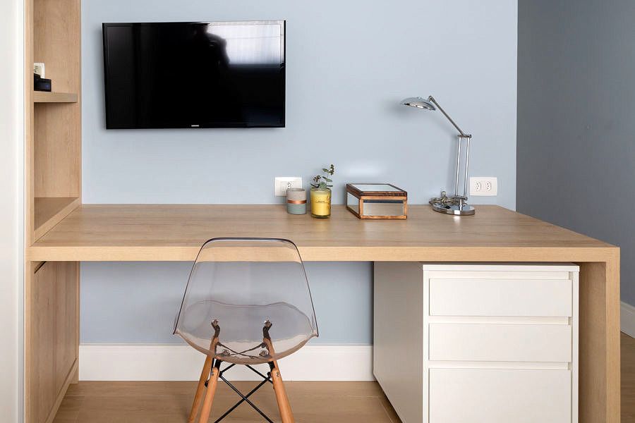 O terceiro dormitório foi eliminado, ampliando assim a sala e criando um Home office. A iluminação foi um item pensado com muito cuidado pelos profissionais, pois foram utilizados tipos diferentes de iluminação diretas e indiretas: trilhos com eletrocalhas pintadas de preto, sancas de gesso com fitas de led, arandelas direcionáveis e pendentes.