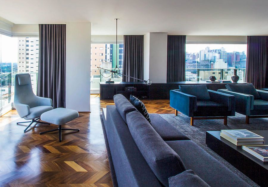 Todo envidraçado, o apê tem espaços demarcados através do mobiliário de design entre estar, jantar e escritório. Um painel ebanizado oculta as portas que dão acesso à ala íntima e à entrada. O piso de madeira cumaru no formato de espinha de peixe valoriza a composição, que tem pitadas de contemporaneidade.