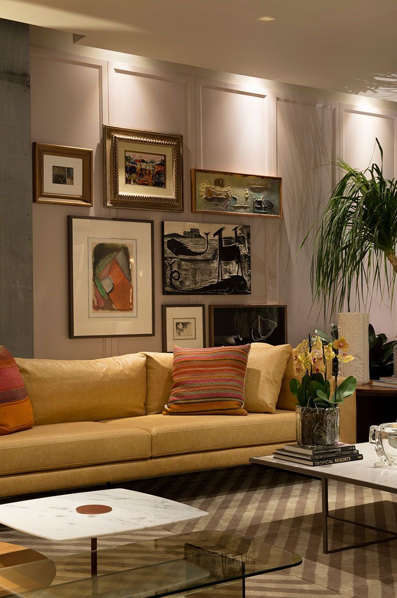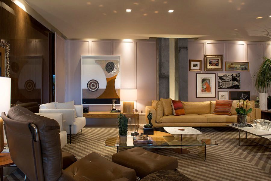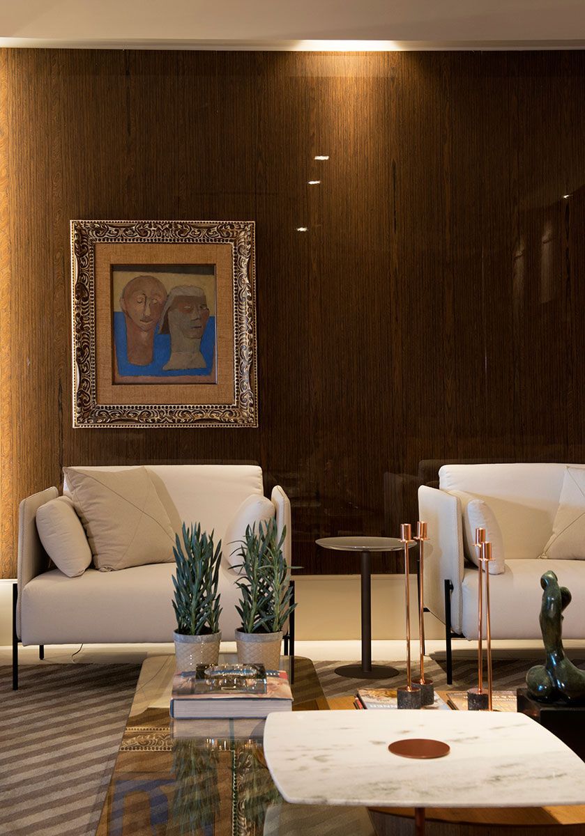 O principal desafio para o escritório foi criar num galpão um espaço charmoso e, ao mesmo tempo leve e poético, onde as pessoas possam conviver e usufruir com intensidade. Os painéis com vidros iluminados no galpão que possui seus pilares evidenciados ajudaram a criar a atmosfera perfeita para o living, que ainda faz uma mistura harmônica com os painéis clássicos da parede.