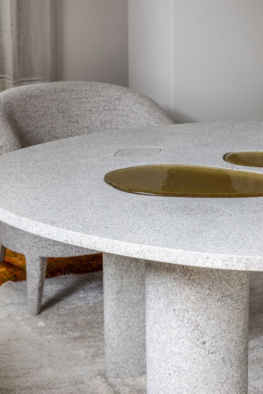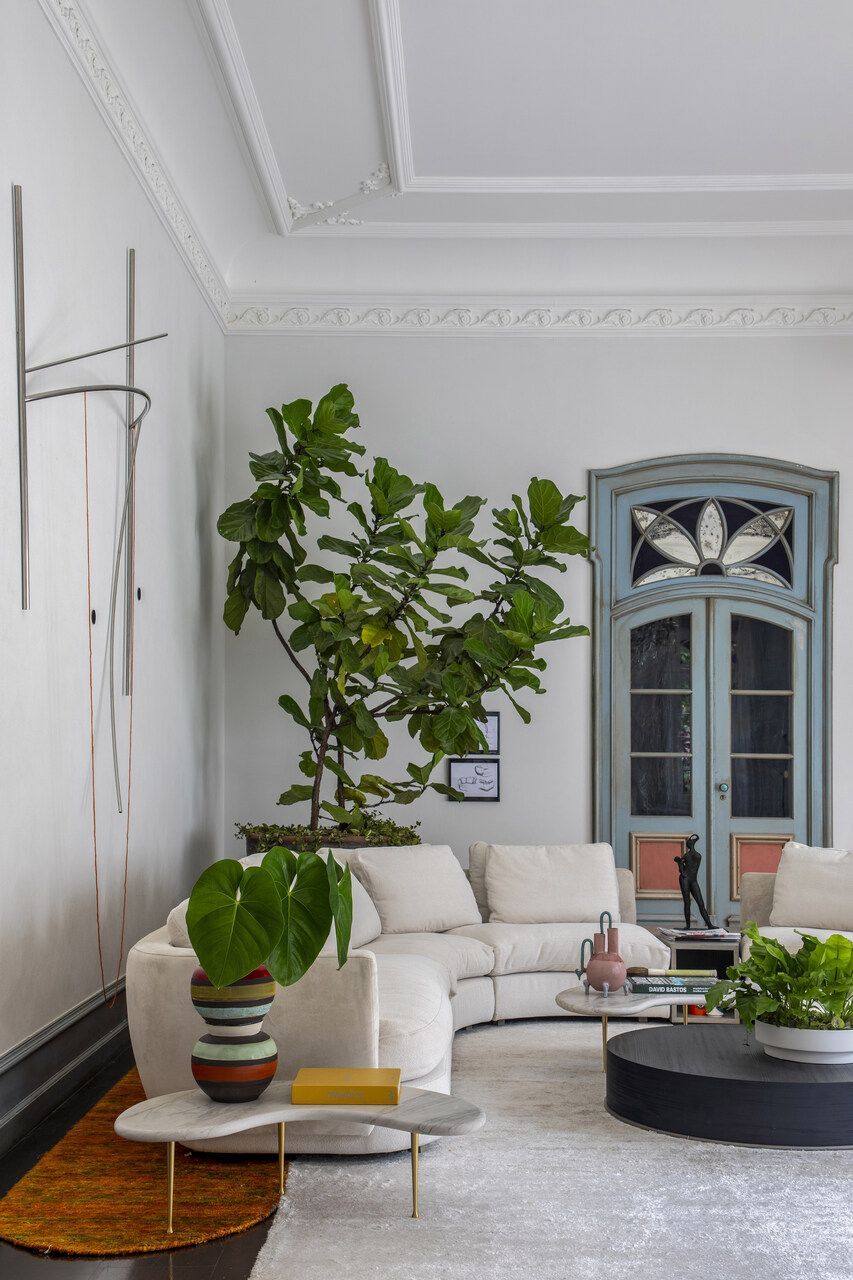 A decoração segue o estilo contemporâneo, com aproveitamento máximo da luz natural que invade o espaço pelas janelas imponentes. No design, formas orgânicas se espalham pelo living com sofás, poltronas, mesas e bancos curvos e arredondados. Já a paleta de cores, baseada em tons de cinza claro, ganham vida com pontos de cor.