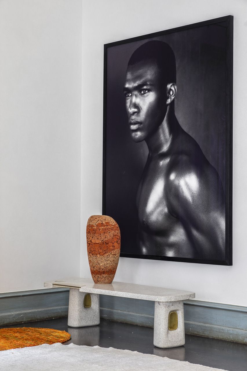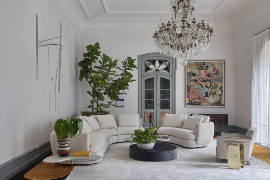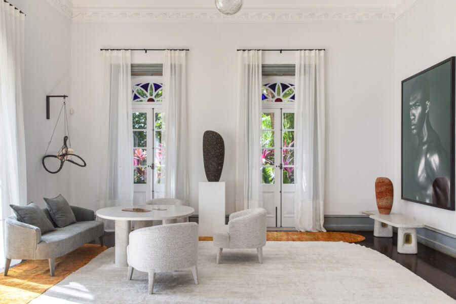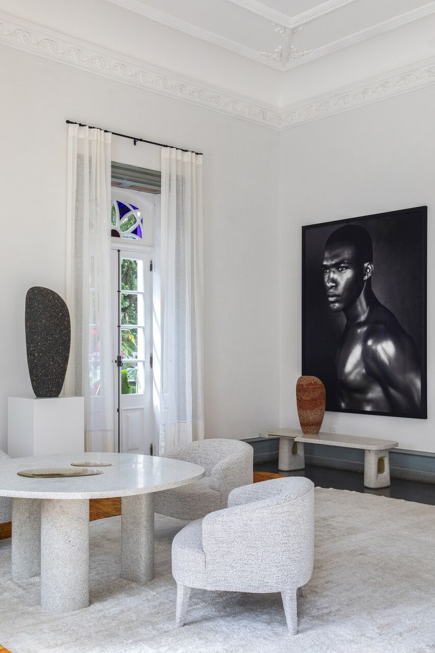 “Quando visitei a propriedade, o living foi o ambiente que mais me passou emoção. Como a casa principal é tombada, conservamos a estrutura original para valorizar ainda mais sua história. Depois, aplicamos nas paredes uma textura que remete à areia de praia e tem tudo a ver com o Rio de Janeiro.”