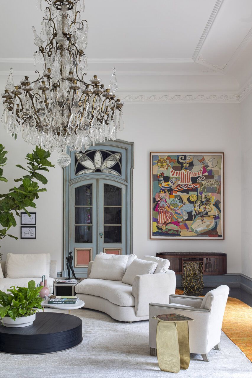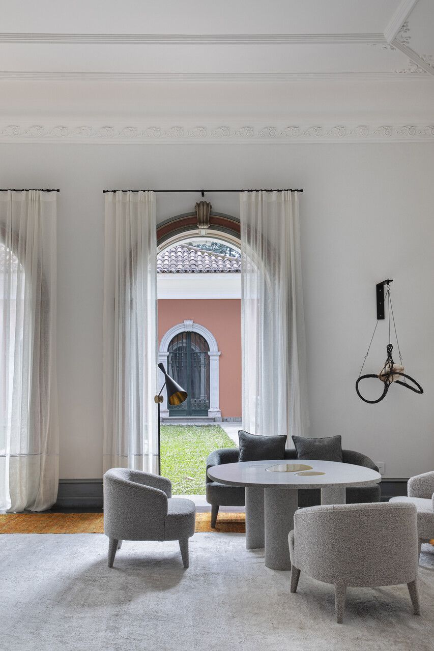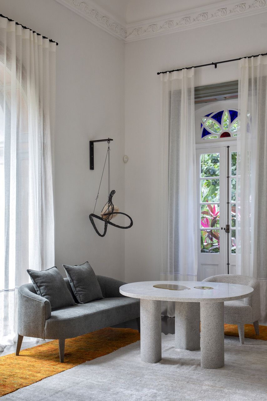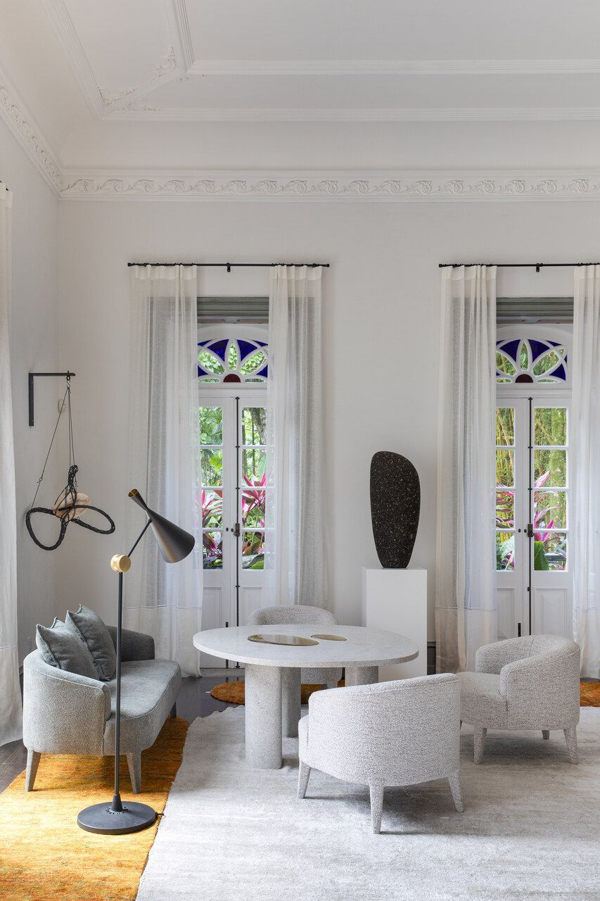 “Quando visitei a propriedade, o living foi o ambiente que mais me passou emoção. Como a casa principal é tombada, conservamos a estrutura original para valorizar ainda mais sua história. Depois, aplicamos nas paredes uma textura que remete à areia de praia e tem tudo a ver com o Rio de Janeiro.”