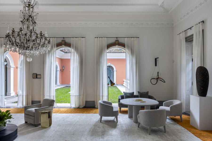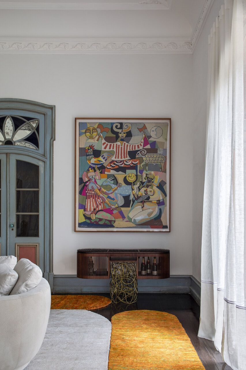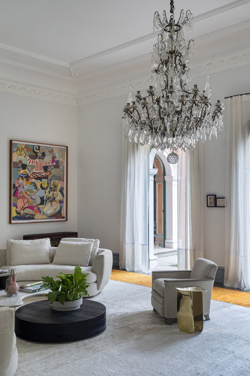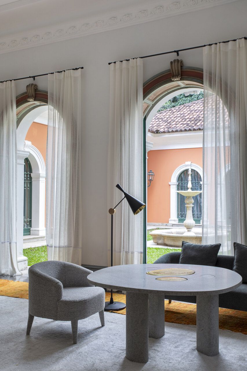 “Quando visitei a propriedade, o living foi o ambiente que mais me passou emoção. Como a casa principal é tombada, conservamos a estrutura original para valorizar ainda mais sua história. Depois, aplicamos nas paredes uma textura que remete à areia de praia e tem tudo a ver com o Rio de Janeiro.”