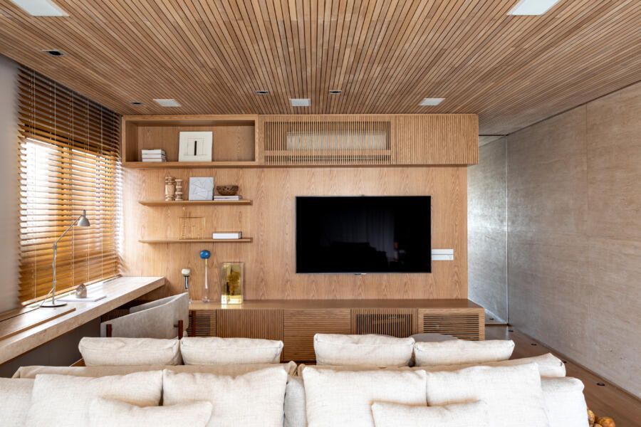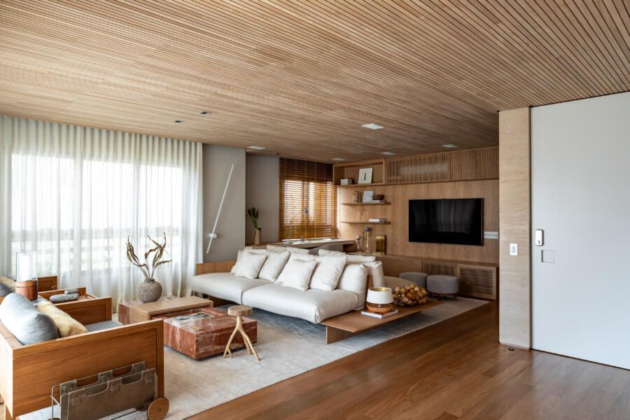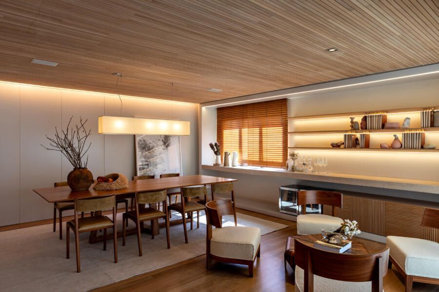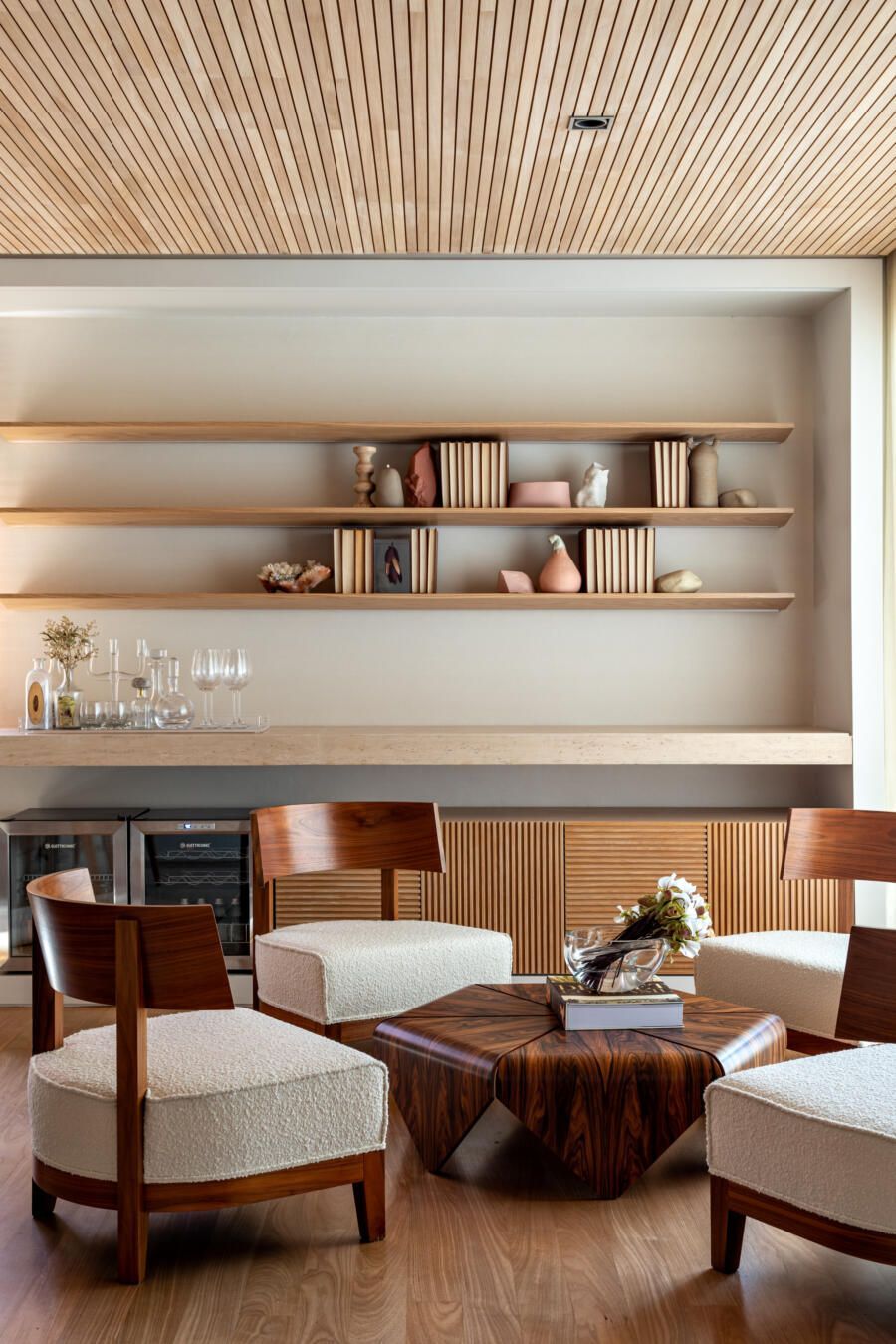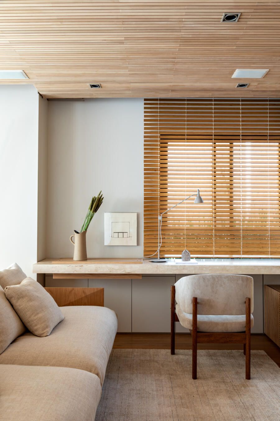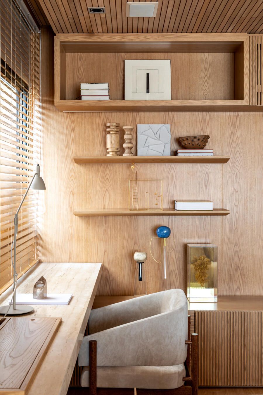 “Queríamos criar ambientes muito aconchegantes, então optamos por uma marcenaria clara. Há um piso de madeira clarinho com a marcenaria toda desenhada em carvalho americano branco. O teto é de madeira ripada, mais especificamente madeira Tauari com ripinhas de três centímetros. Por conta do uso significativo de madeira, tiramos bastante partido da iluminação direta. Então como a gente tinha um forro de madeira bem bonito, a ideia era que realmente não tivesse muita iluminação embutida. Ao invés disso, usamos sancas, luminárias decorativas, abajures, apoios de luminárias de piso…”