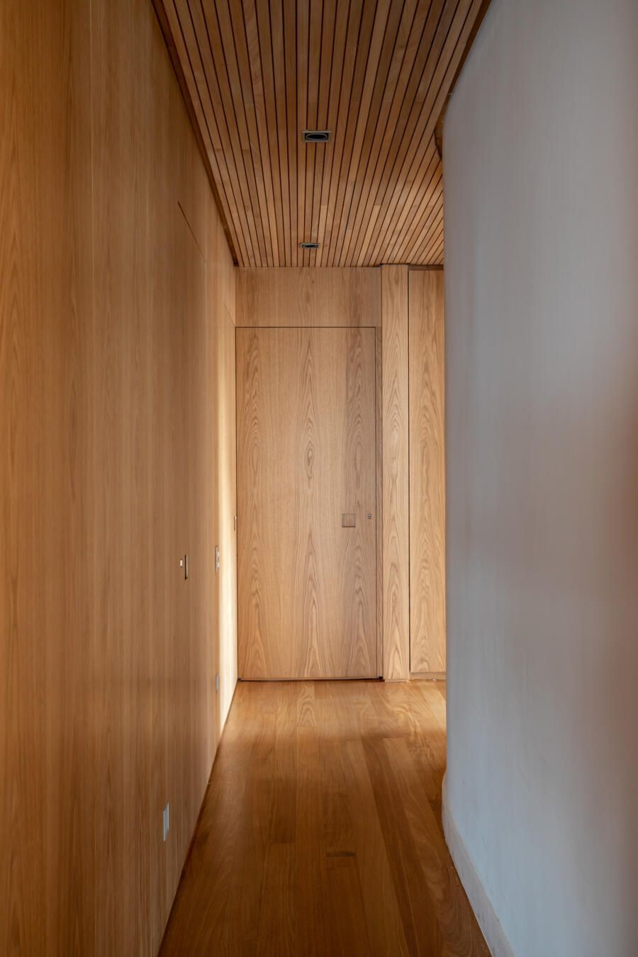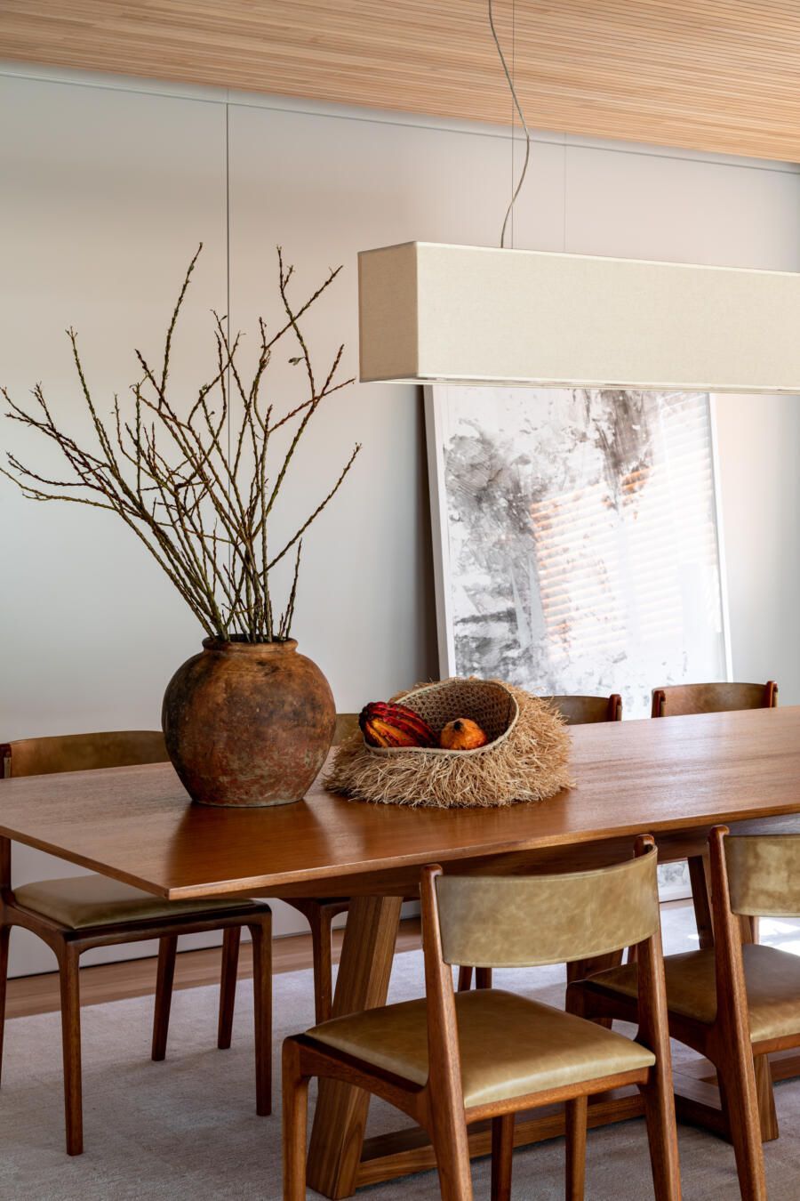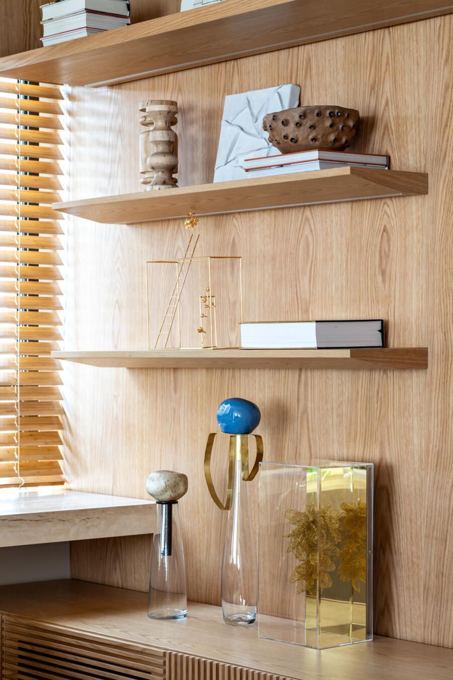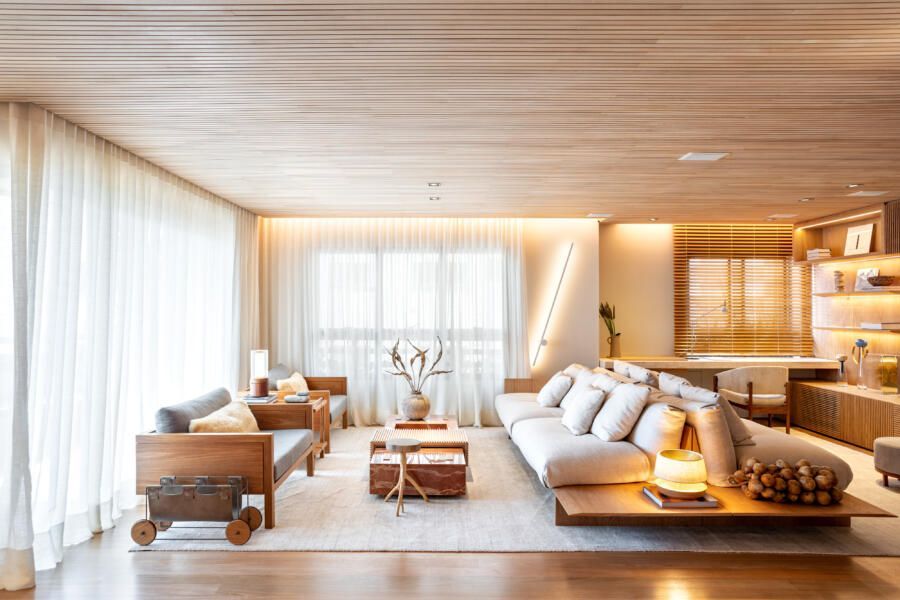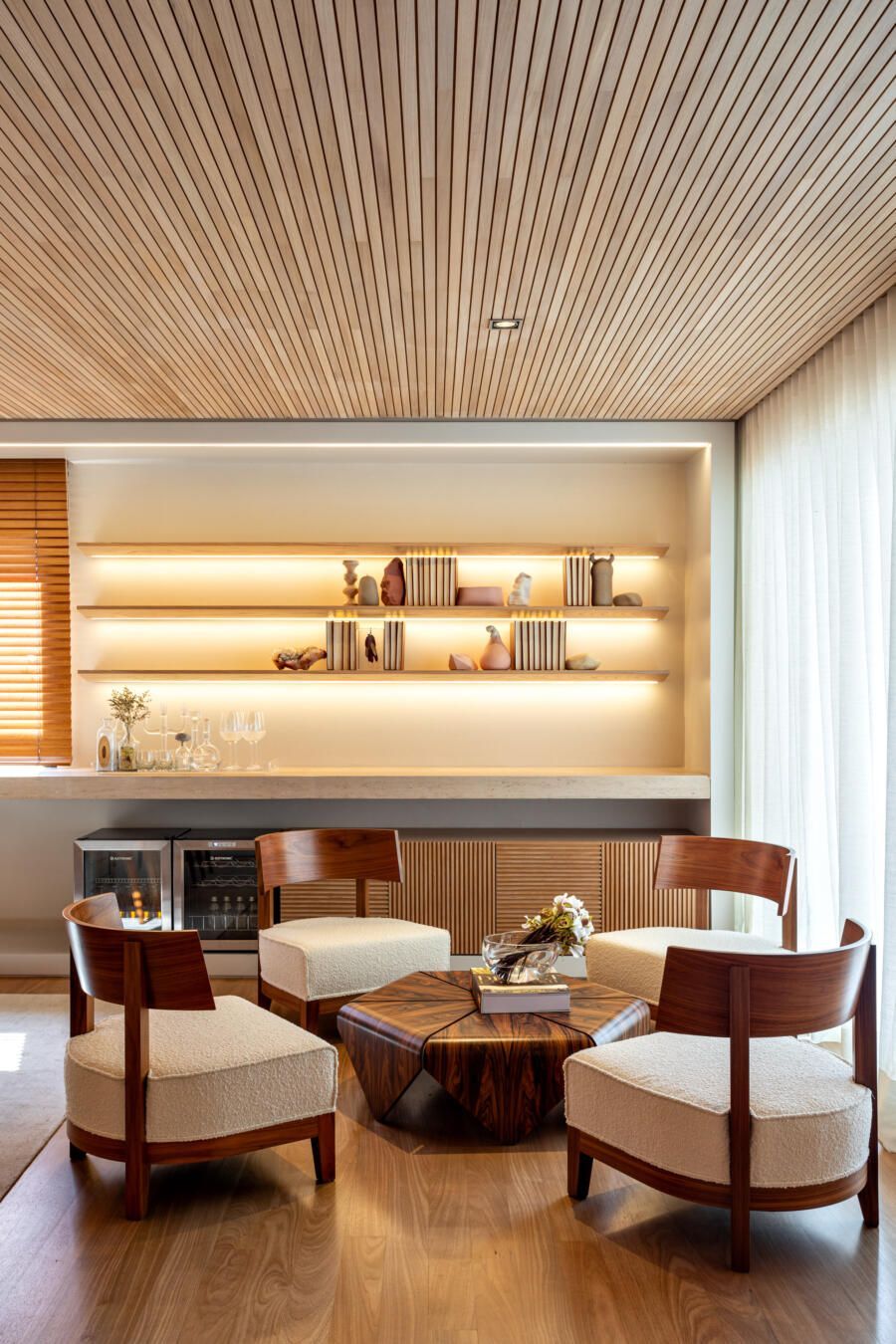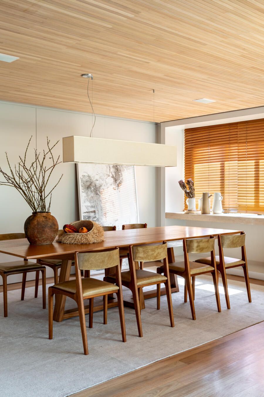 “Queríamos criar ambientes muito aconchegantes, então optamos por uma marcenaria clara. Há um piso de madeira clarinho com a marcenaria toda desenhada em carvalho americano branco. O teto é de madeira ripada, mais especificamente madeira Tauari com ripinhas de três centímetros. Por conta do uso significativo de madeira, tiramos bastante partido da iluminação direta. Então como a gente tinha um forro de madeira bem bonito, a ideia era que realmente não tivesse muita iluminação embutida. Ao invés disso, usamos sancas, luminárias decorativas, abajures, apoios de luminárias de piso…”