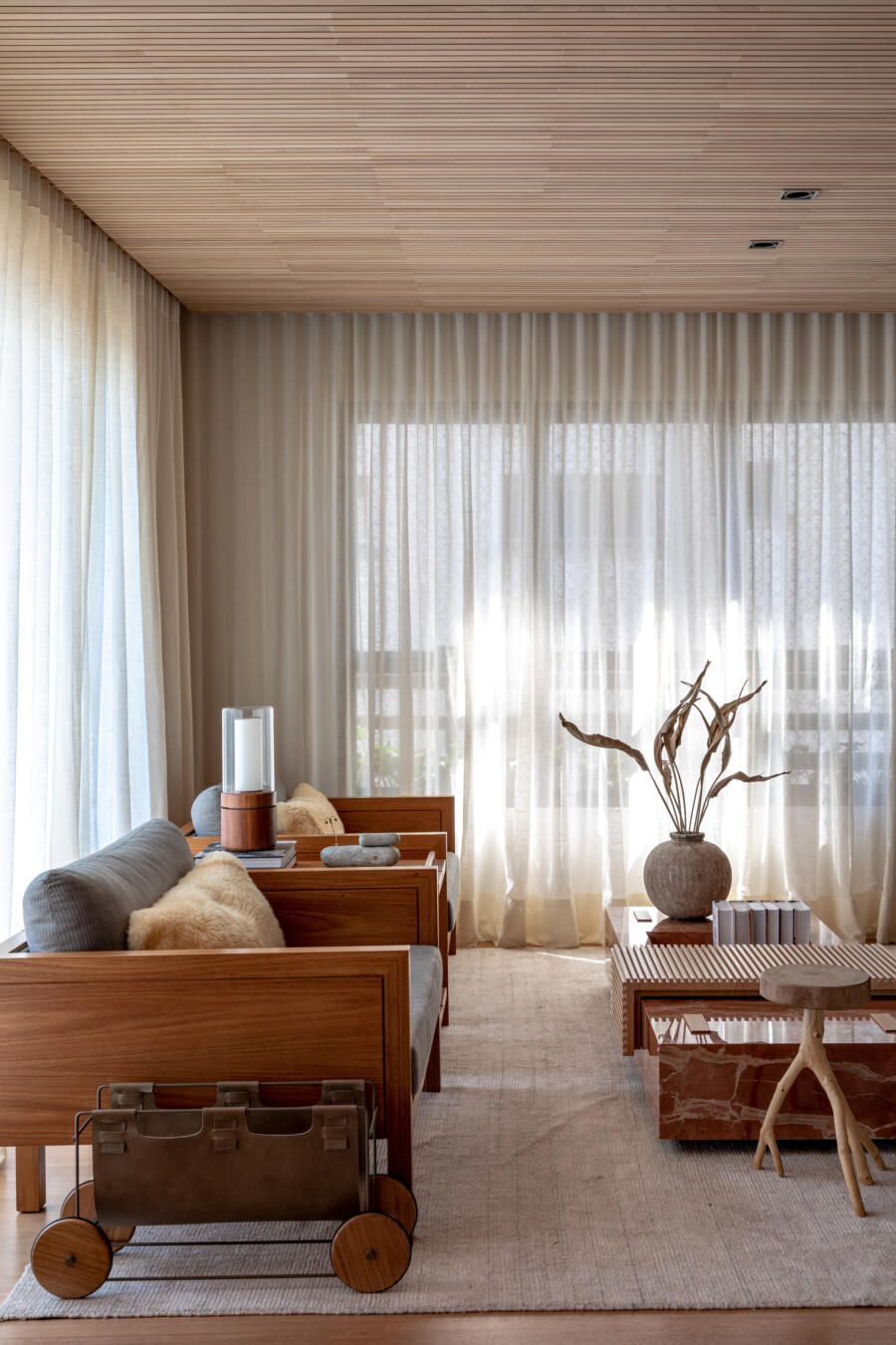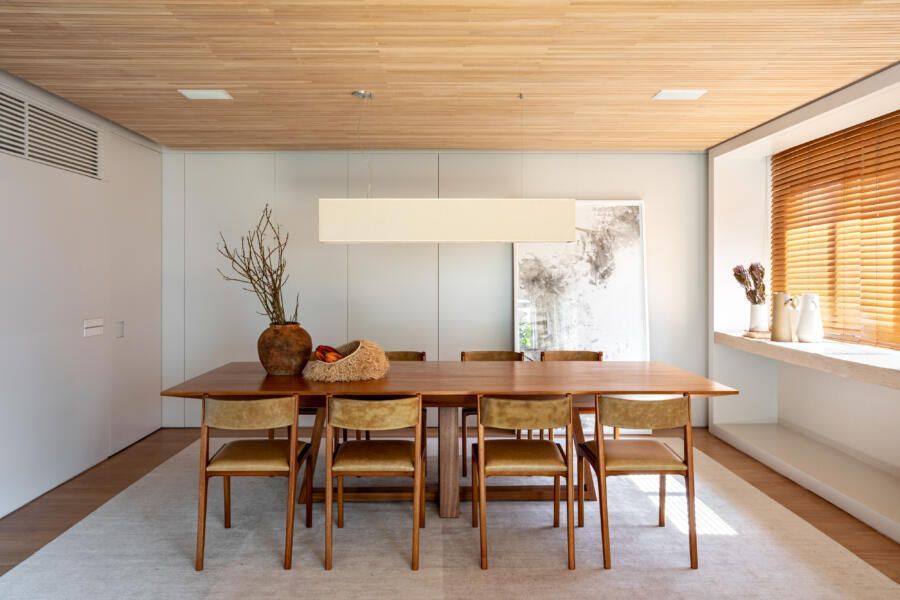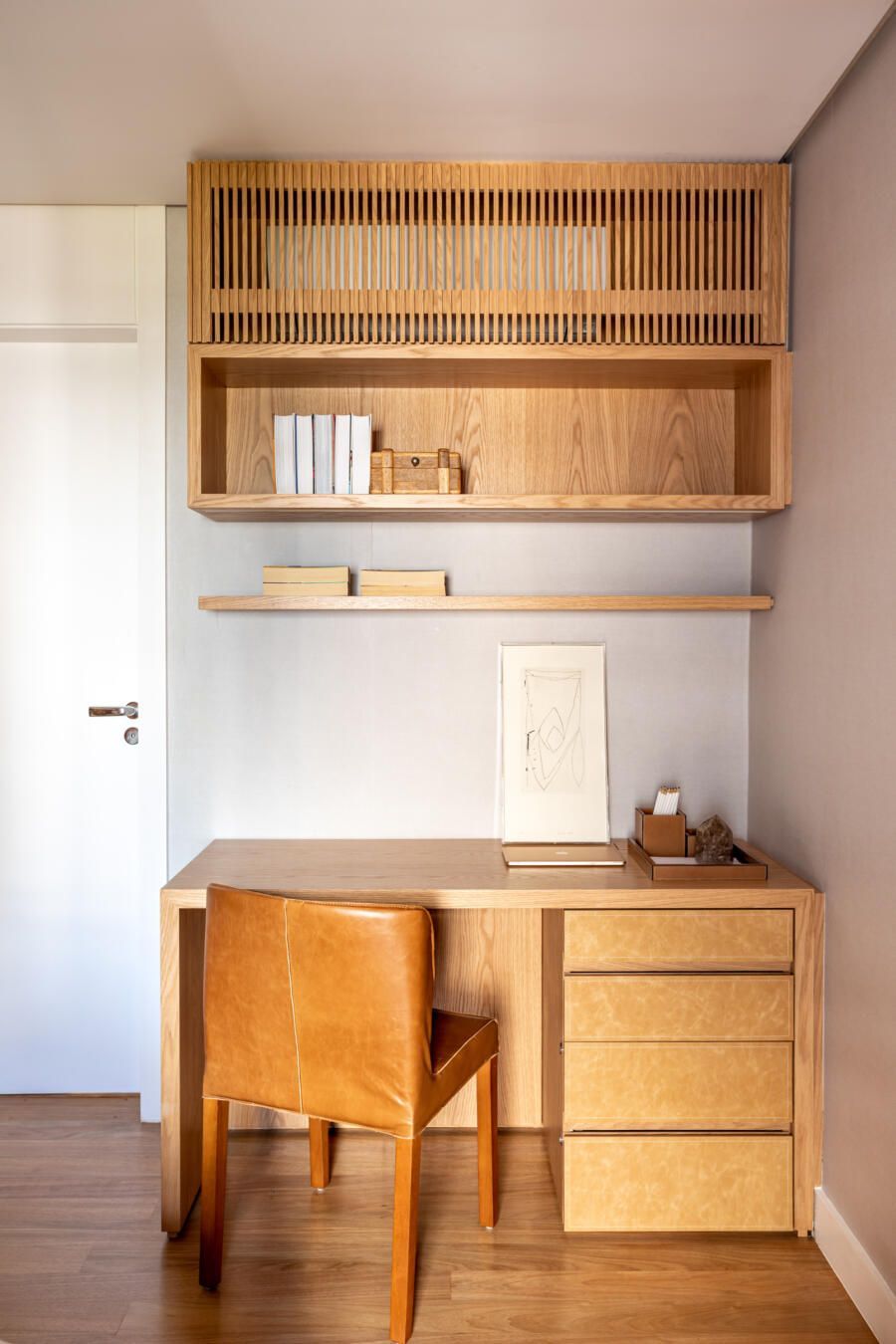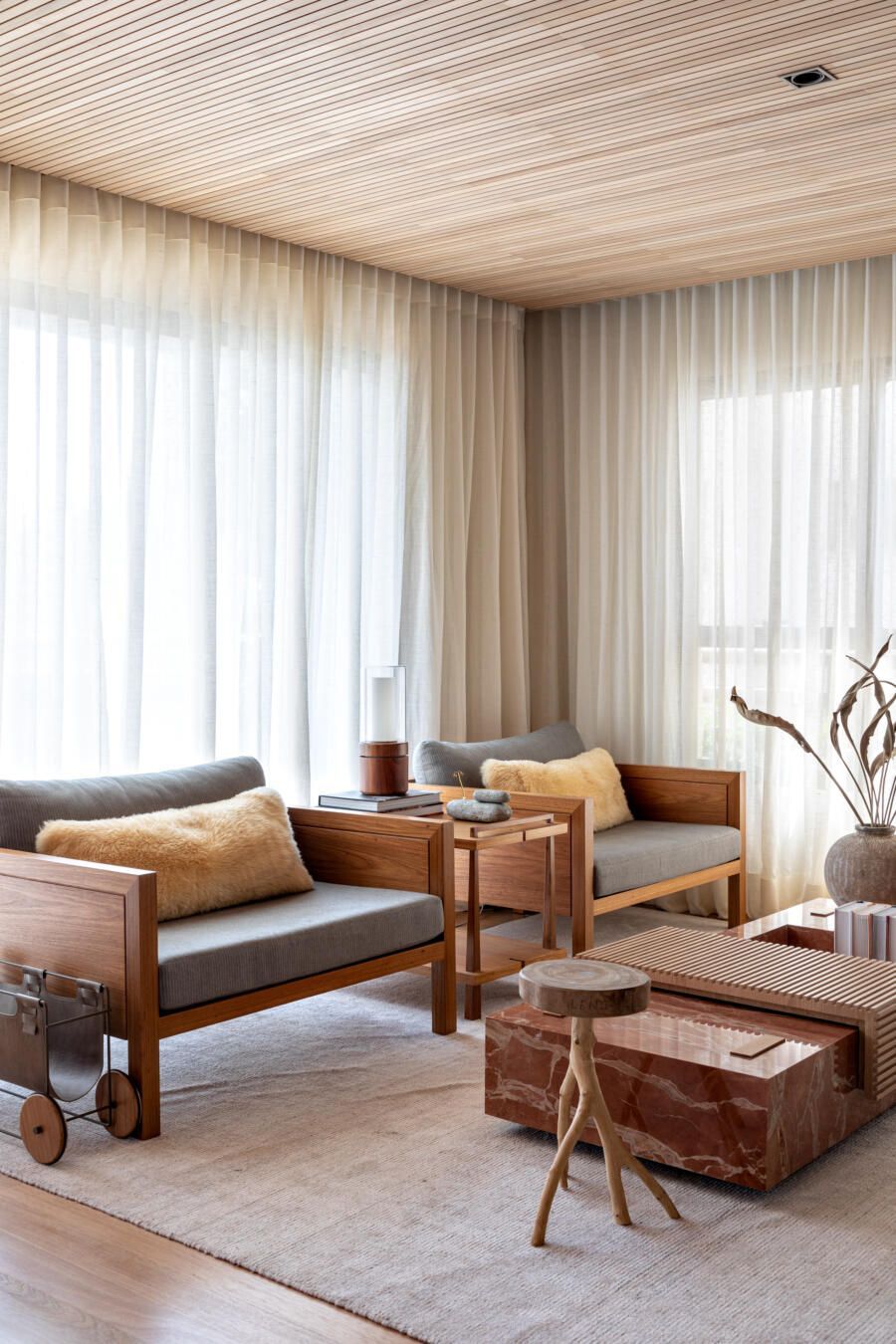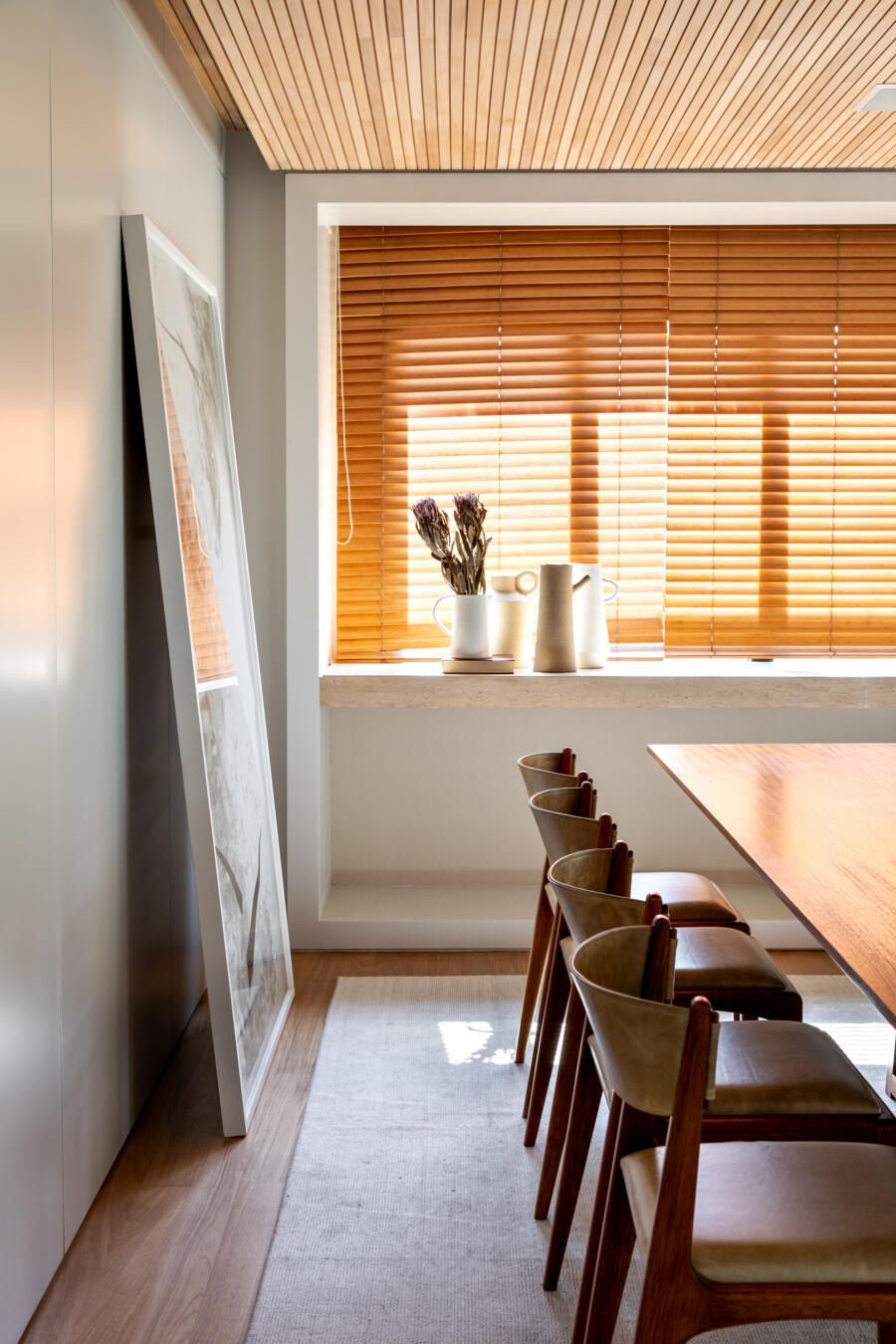 “Queríamos criar ambientes muito aconchegantes, então optamos por uma marcenaria clara. Há um piso de madeira clarinho com a marcenaria toda desenhada em carvalho americano branco. O teto é de madeira ripada, mais especificamente madeira Tauari com ripinhas de três centímetros. Por conta do uso significativo de madeira, tiramos bastante partido da iluminação direta. Então como a gente tinha um forro de madeira bem bonito, a ideia era que realmente não tivesse muita iluminação embutida. Ao invés disso, usamos sancas, luminárias decorativas, abajures, apoios de luminárias de piso…”