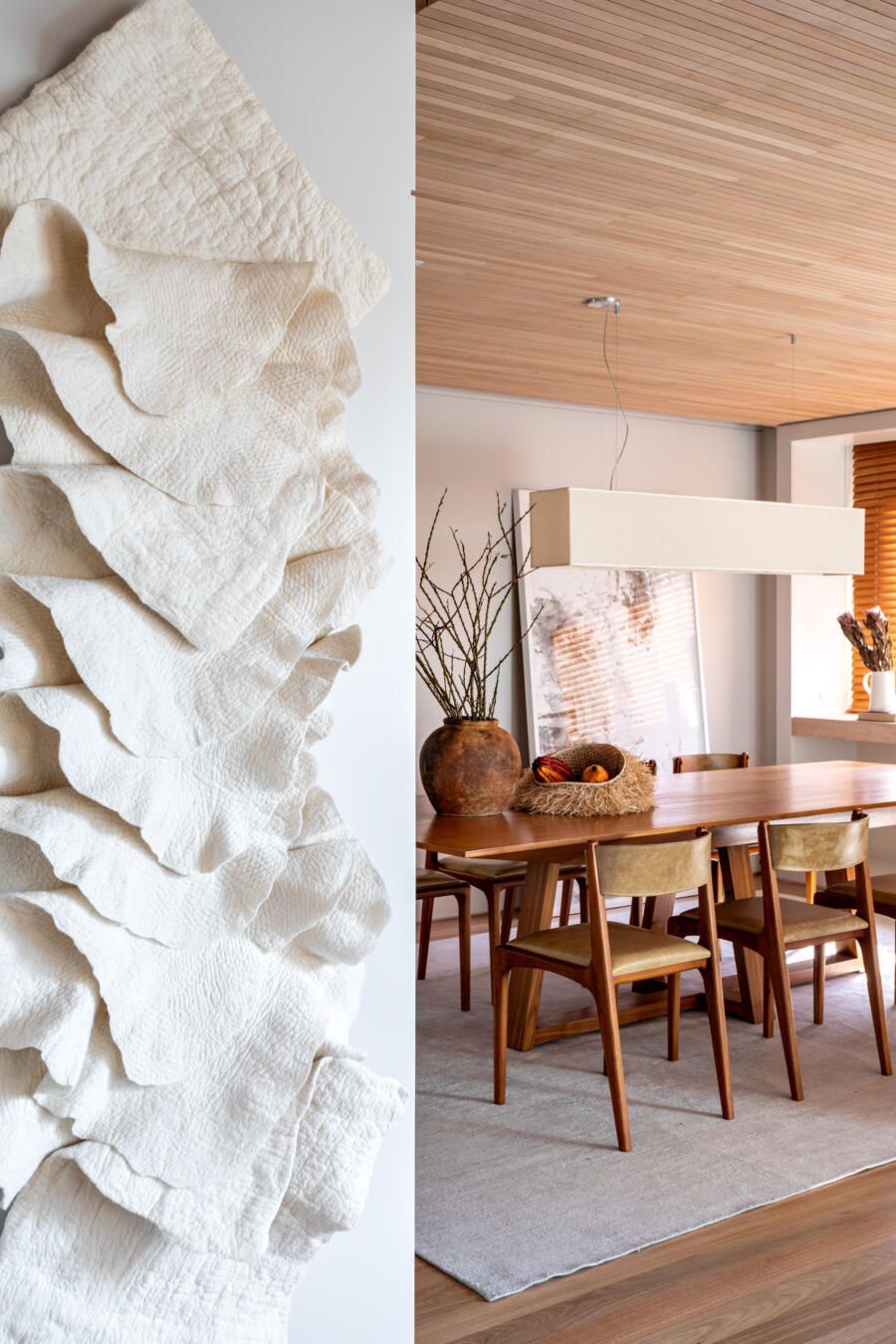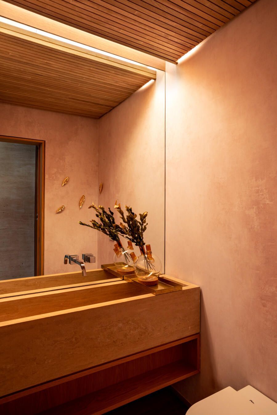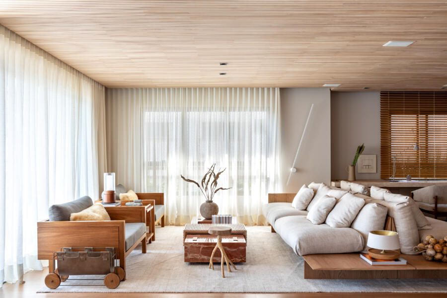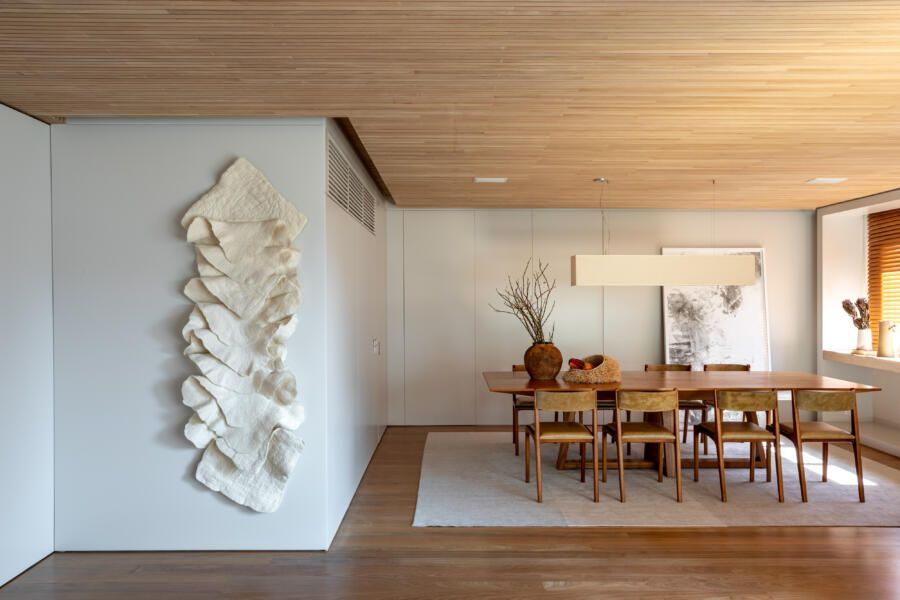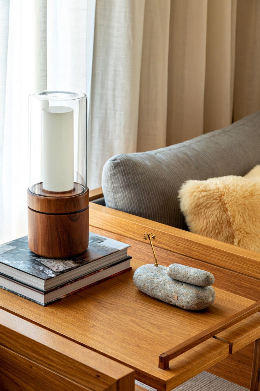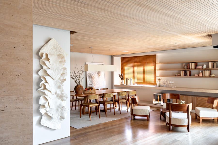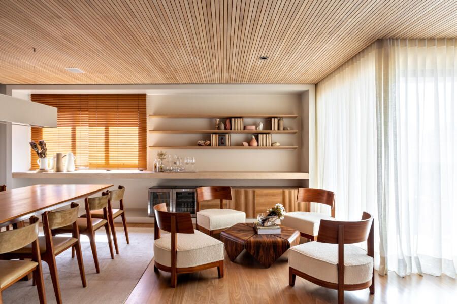 “Queríamos criar ambientes muito aconchegantes, então optamos por uma marcenaria clara. Há um piso de madeira clarinho com a marcenaria toda desenhada em carvalho americano branco. O teto é de madeira ripada, mais especificamente madeira Tauari com ripinhas de três centímetros. Por conta do uso significativo de madeira, tiramos bastante partido da iluminação direta. Então como a gente tinha um forro de madeira bem bonito, a ideia era que realmente não tivesse muita iluminação embutida. Ao invés disso, usamos sancas, luminárias decorativas, abajures, apoios de luminárias de piso…”