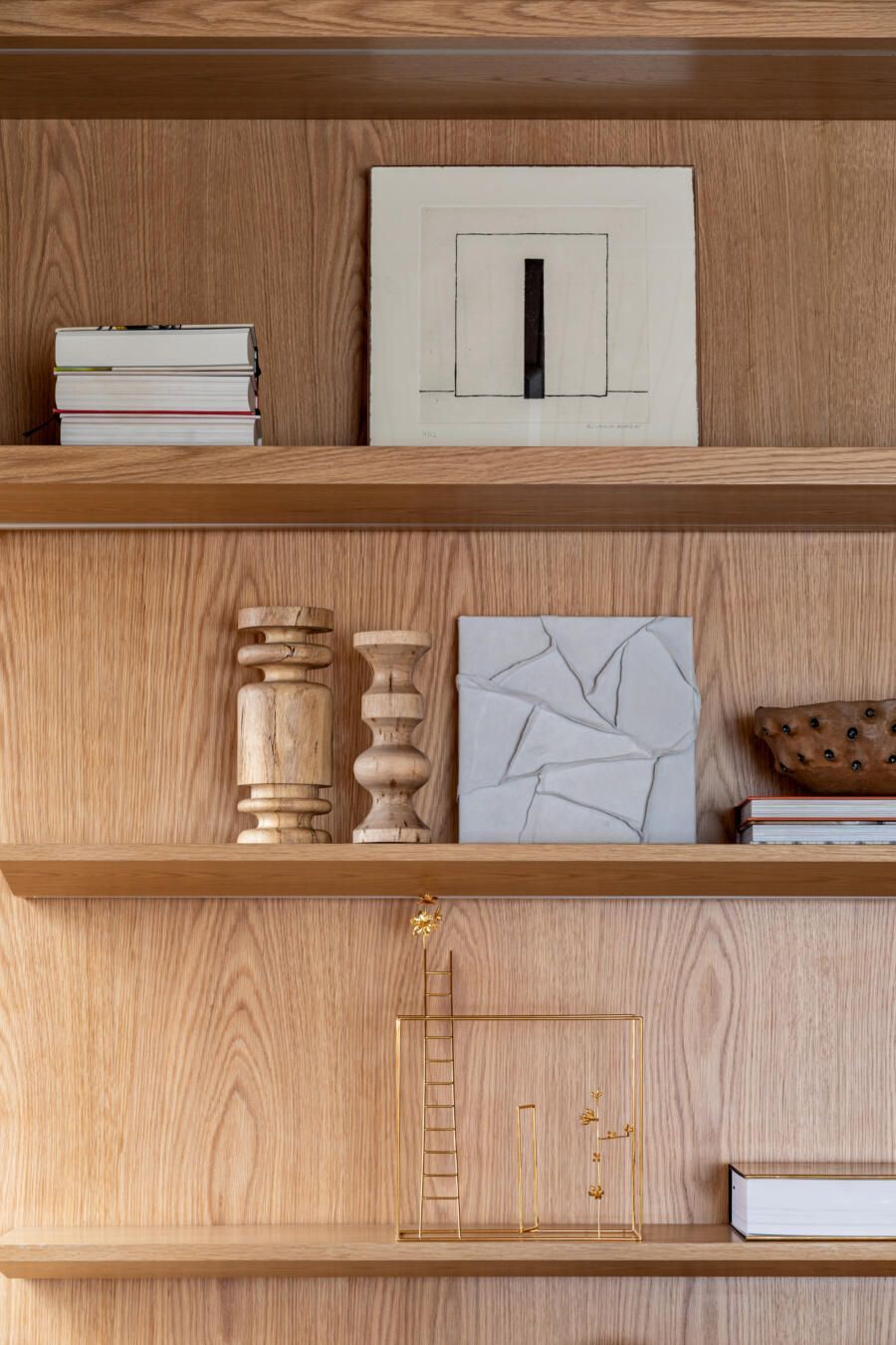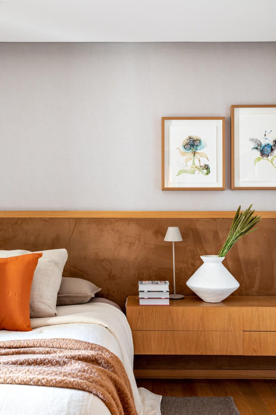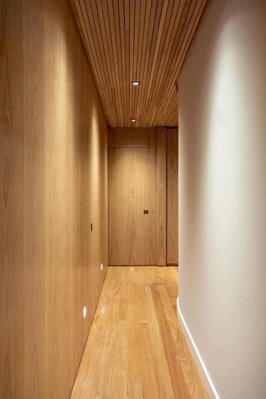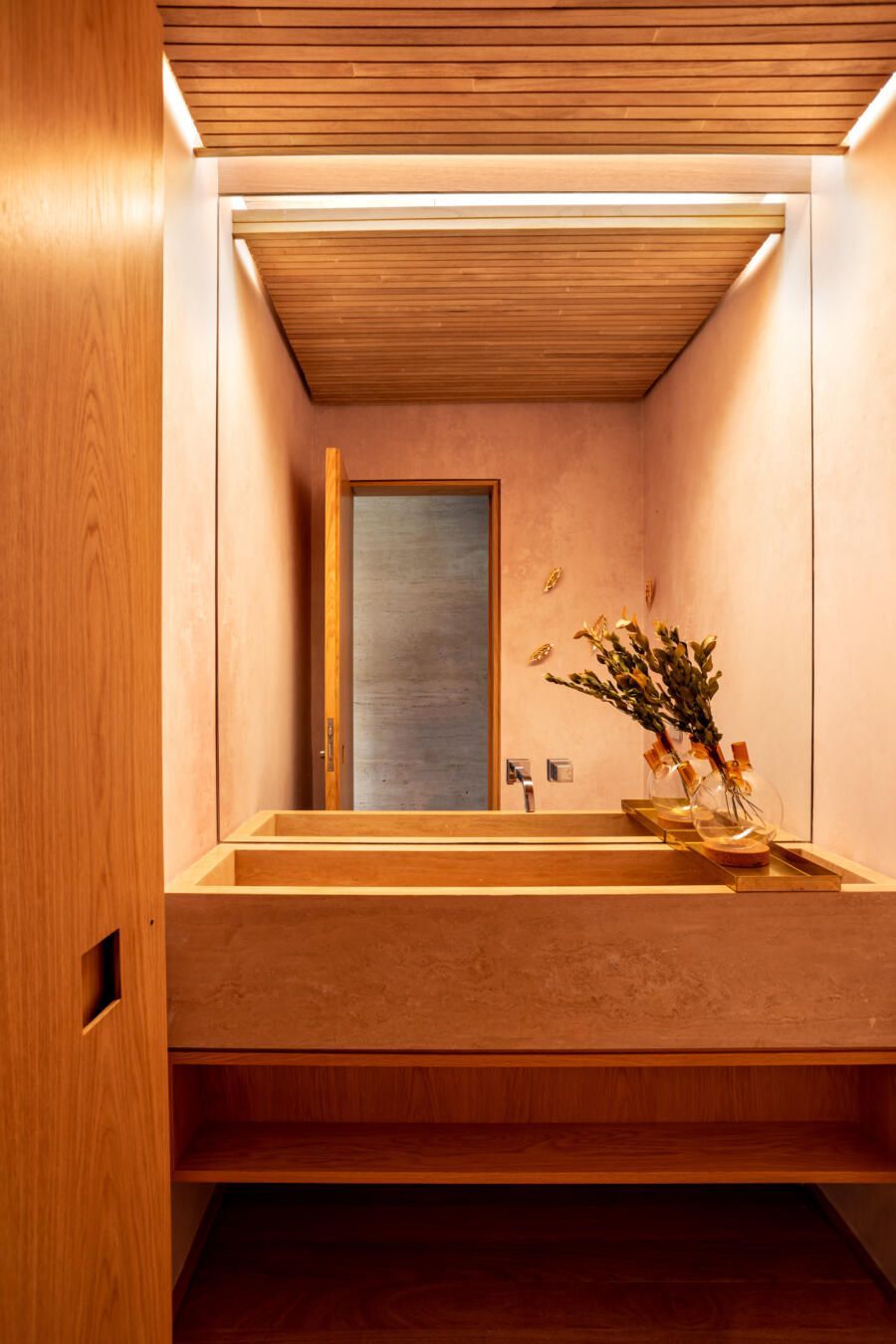 “Queríamos criar ambientes muito aconchegantes, então optamos por uma marcenaria clara. Há um piso de madeira clarinho com a marcenaria toda desenhada em carvalho americano branco. O teto é de madeira ripada, mais especificamente madeira Tauari com ripinhas de três centímetros. Por conta do uso significativo de madeira, tiramos bastante partido da iluminação direta. Então como a gente tinha um forro de madeira bem bonito, a ideia era que realmente não tivesse muita iluminação embutida. Ao invés disso, usamos sancas, luminárias decorativas, abajures, apoios de luminárias de piso…”