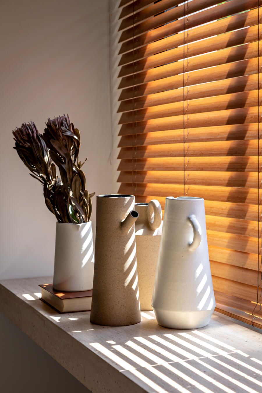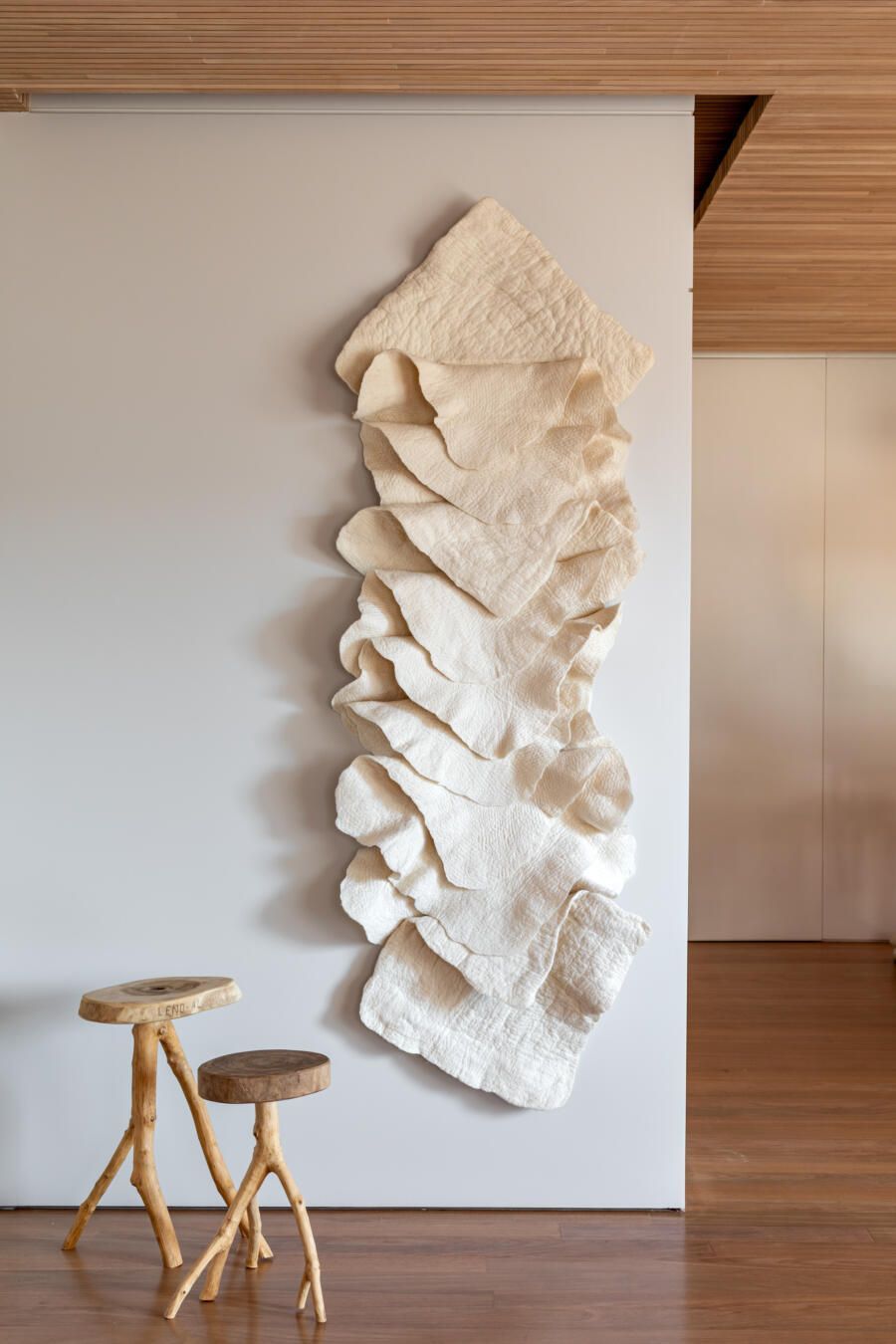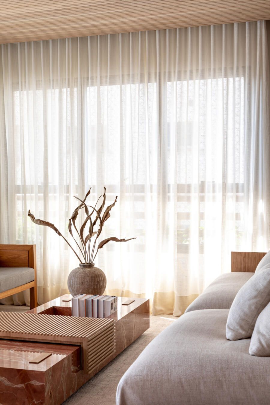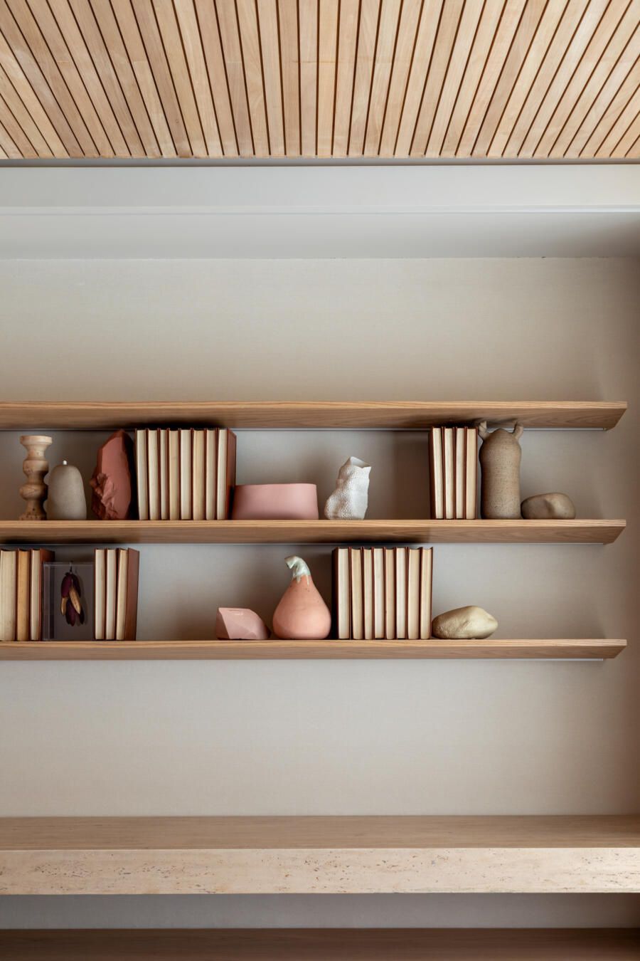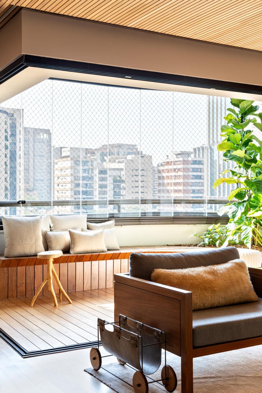 “Queríamos criar ambientes muito aconchegantes, então optamos por uma marcenaria clara. Há um piso de madeira clarinho com a marcenaria toda desenhada em carvalho americano branco. O teto é de madeira ripada, mais especificamente madeira Tauari com ripinhas de três centímetros. Por conta do uso significativo de madeira, tiramos bastante partido da iluminação direta. Então como a gente tinha um forro de madeira bem bonito, a ideia era que realmente não tivesse muita iluminação embutida. Ao invés disso, usamos sancas, luminárias decorativas, abajures, apoios de luminárias de piso…”