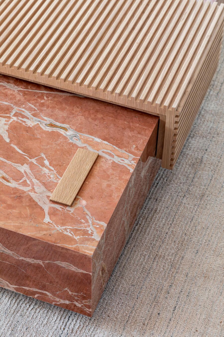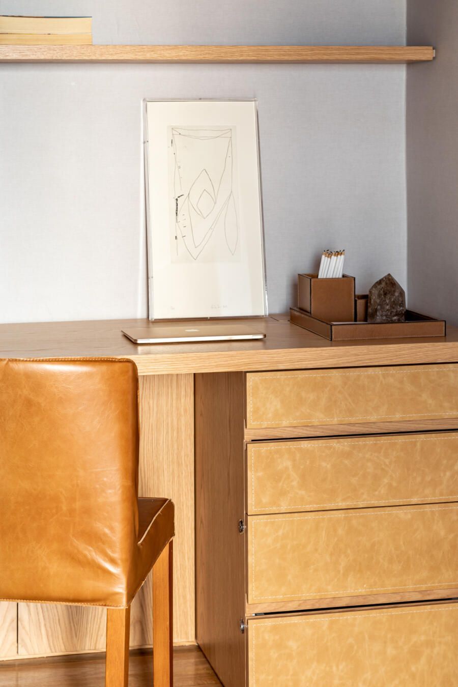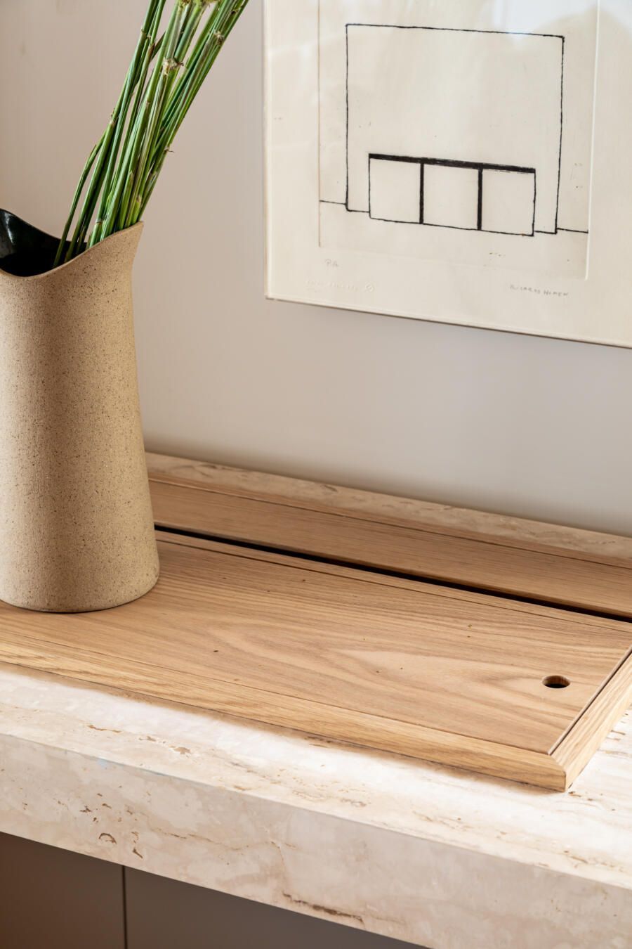 “Eles não precisavam de muito espaço para guardar coisas na bancada de mármore, então a gente criou só uma caixinha de madeira para quando estiverem recebendo. Nessa caixinha eles podem deixar as bebidas, servir de apoio para servir uns petiscos ou, eventualmente, até sobremesas. Assim, a bancada ‘normal’ pode se tornar uma bancada de bar.”
