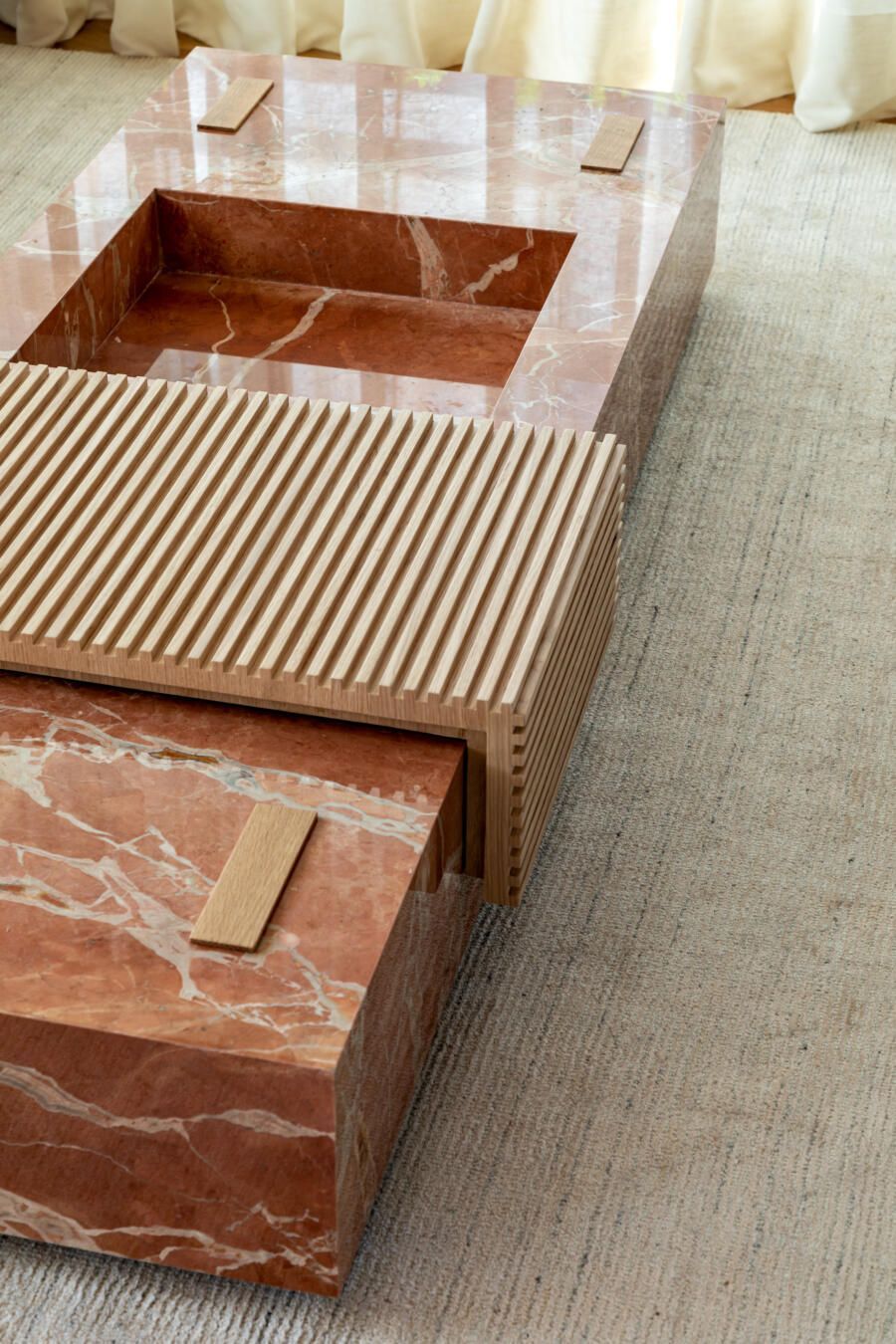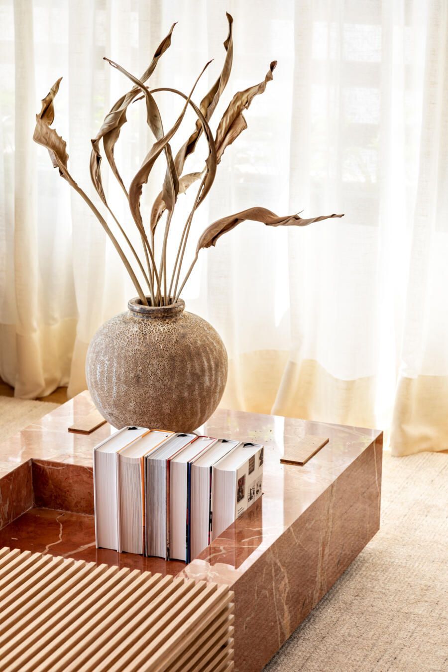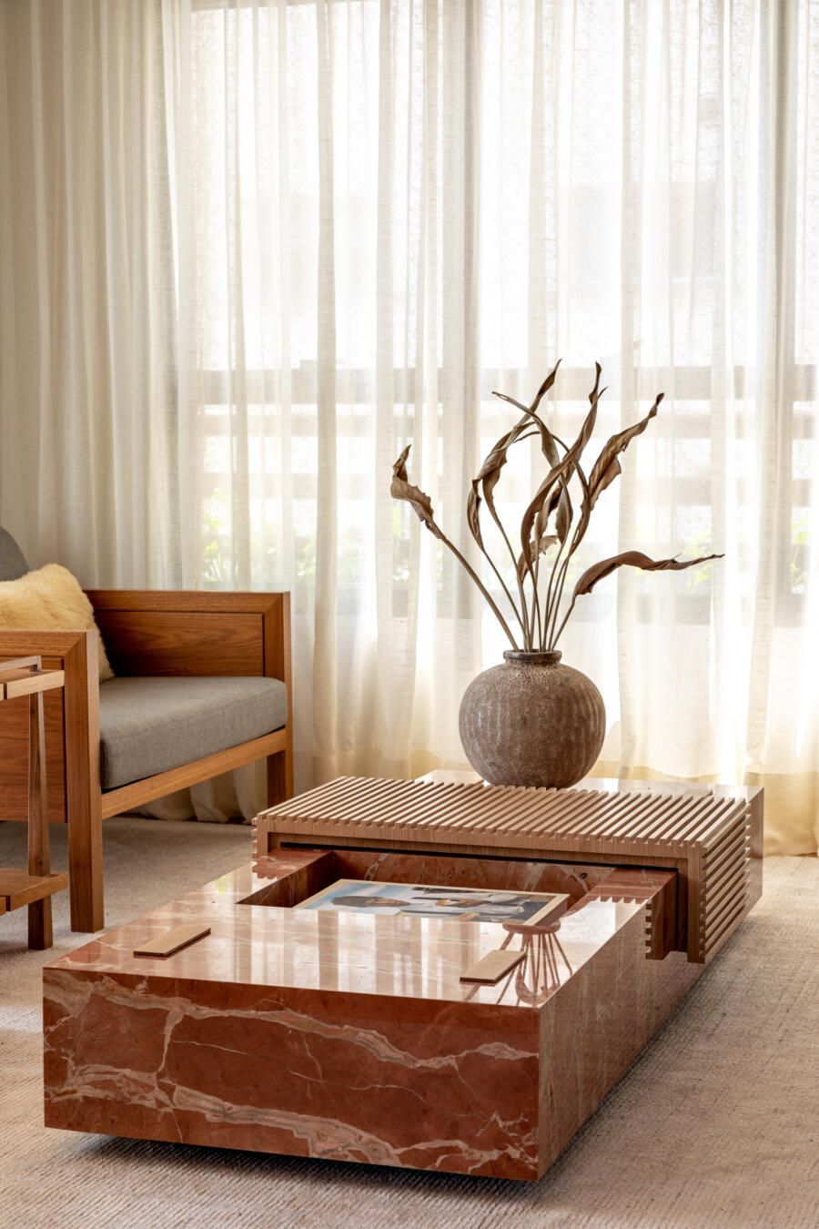 “O casal sentia muita falta de ter um espaço único, com mais possibilidades, então acabamos bolando um layout integrado utilizando o sofá box do Jader Almeida, que vira para os dois lados. Eles também queriam um espaço de trabalho nessa sala, então planejamos uma sala multiuso que tem home theater, o living e uma bancada de apoio de home office que é esteticamente interessante o suficiente para conviver com o resto da área social. E a mesa de centro de mármore foi especialmente desenhada por nós para este projeto.”