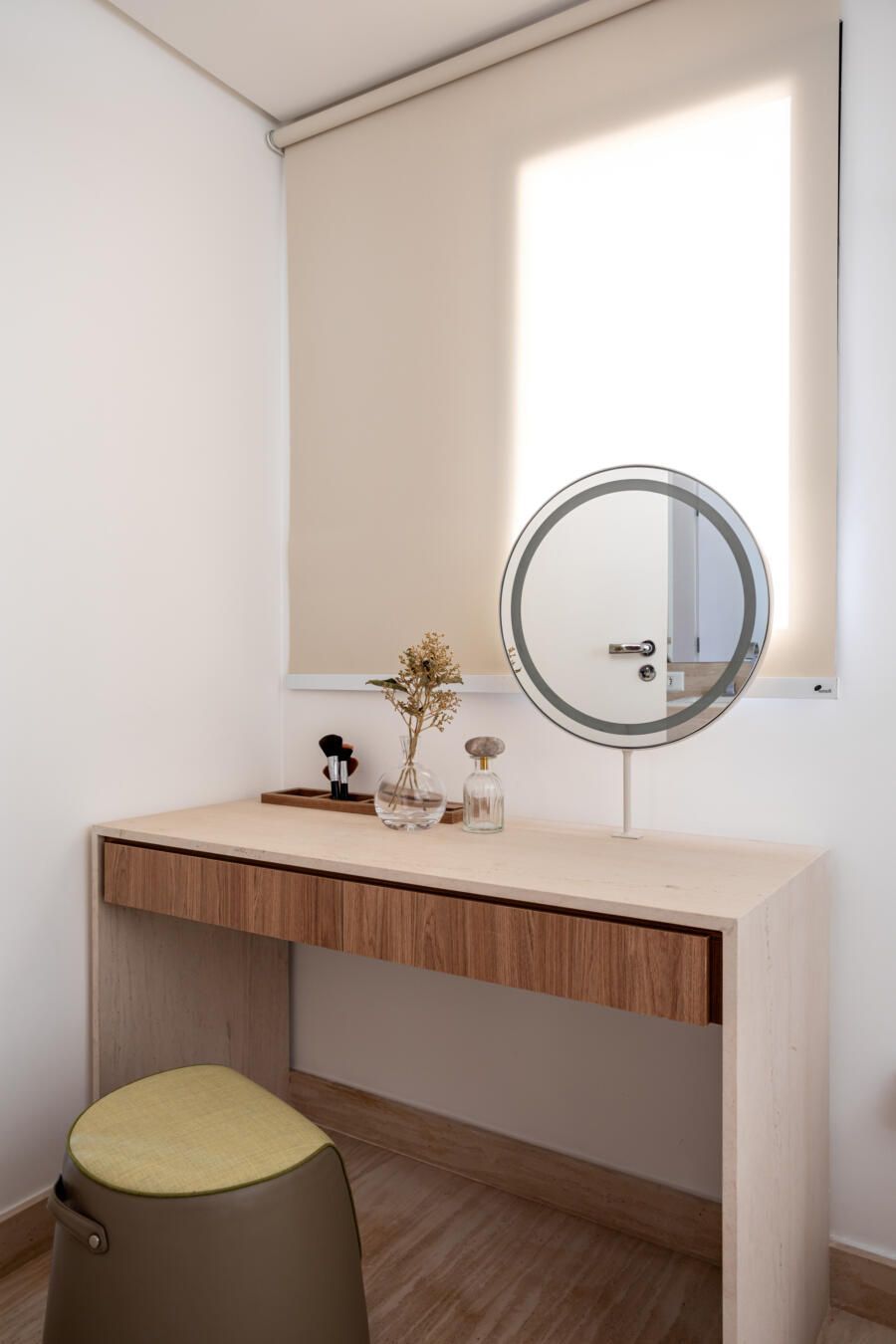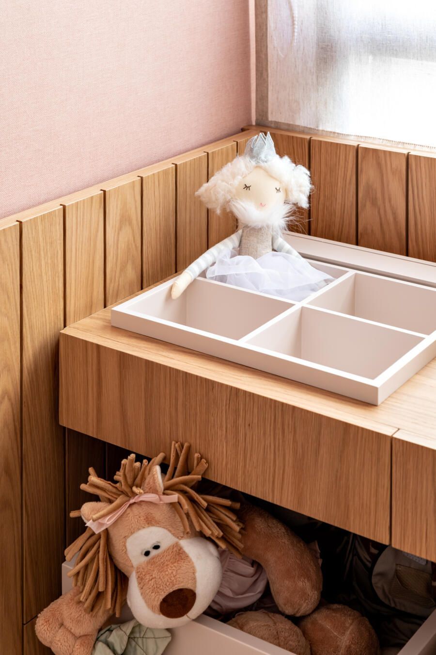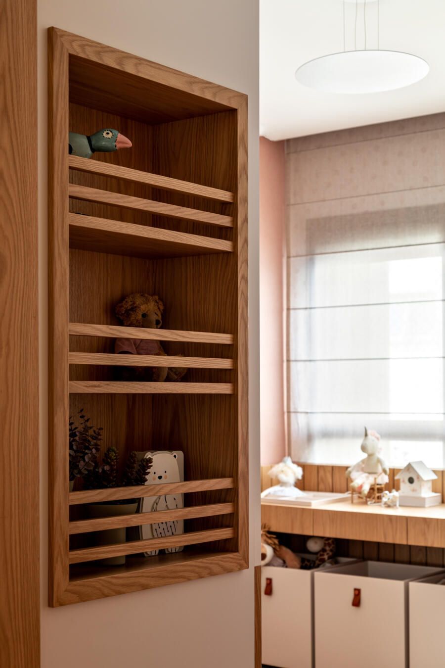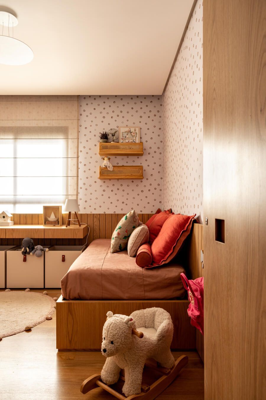 “Eles estavam grávidos da segunda filha e queriam dar um quartinho de presente para a filha mais velha. Ela ainda dormia no berço e passou para a cama, então a gente fez um quarto já pensando num ambiente de ‘mocinha’. Fizemos uma marcenaria toda sob medida, onde deixamos projetada uma bancada de estudos com altura de adulto e, embaixo, umas caixinhas de rodízio que são fáceis da menina puxar, brincar e guardar os brinquedos sozinha.”