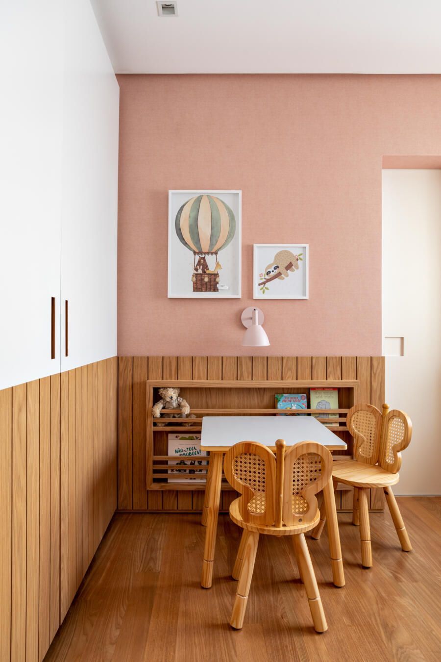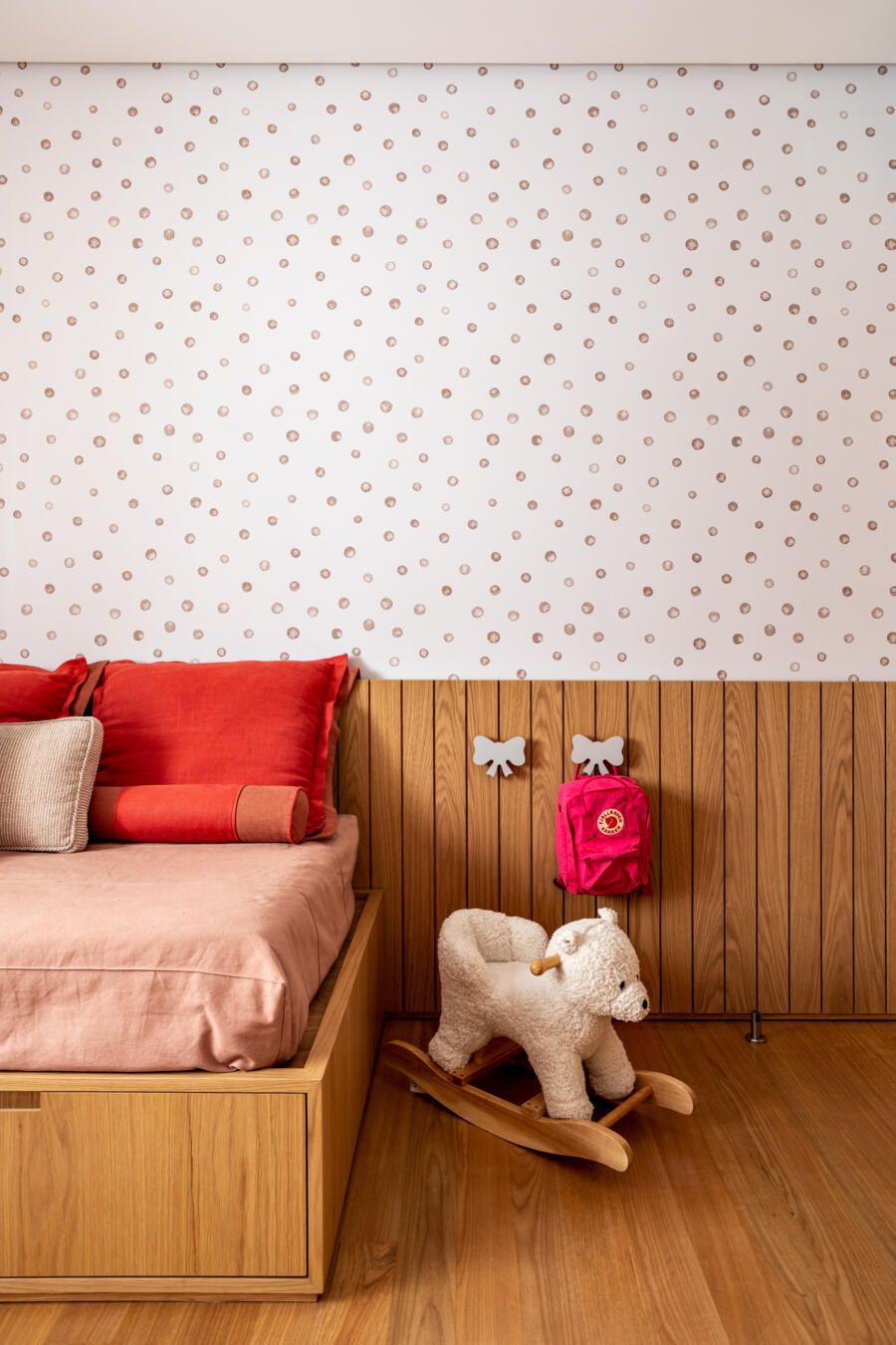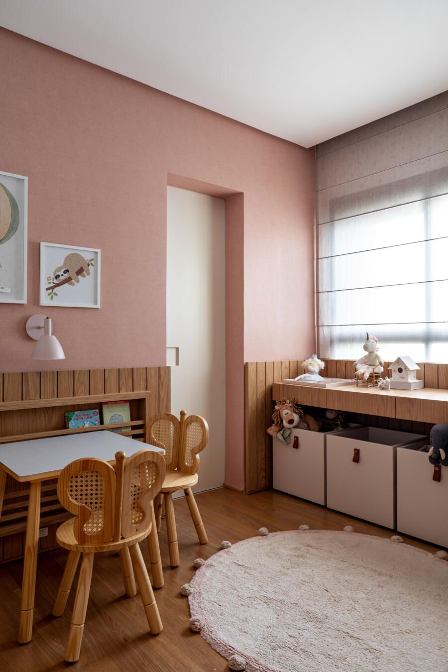“Usamos um tom de rosa, mas com uma mistura meio inusitada. É um rosa seco que se mistura com uma cor de coral bem viva e alegre. Fizemos isso para trazer uma composição diferente para o tom de rosa. Também trabalhamos com dois papéis de parede diferentes, um de bolinhas e o outro rosa. A principal ideia era desenhar um quarto que pudesse crescer com ela.”
