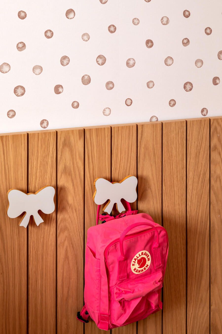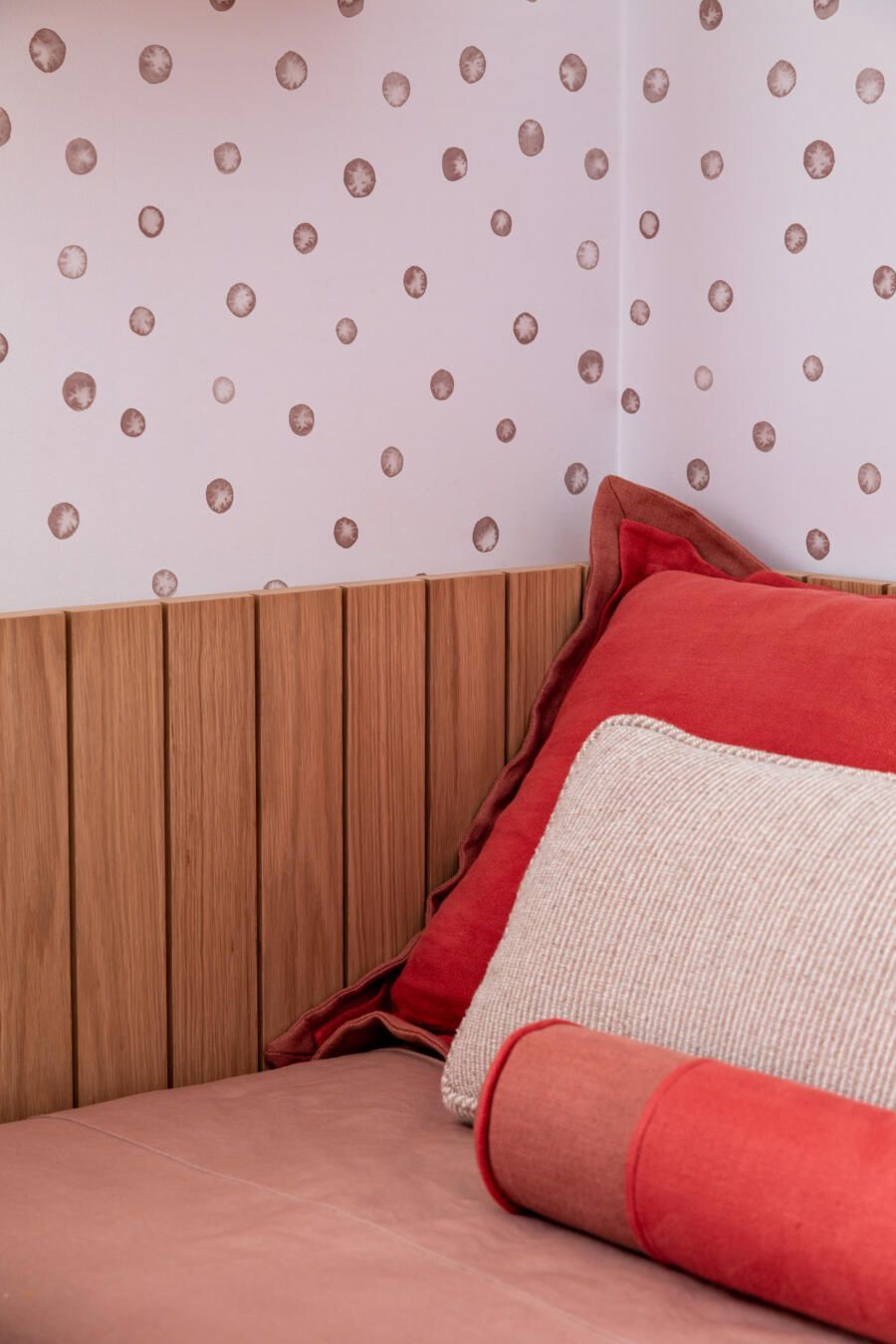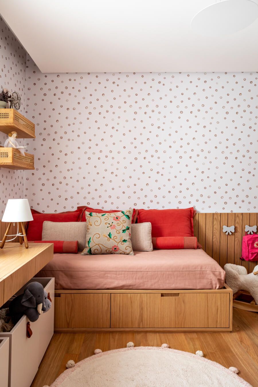 “Usamos um tom de rosa, mas com uma mistura meio inusitada. É um rosa seco que se mistura com uma cor de coral bem viva e alegre. Fizemos isso para trazer uma composição diferente para o tom de rosa. Também trabalhamos com dois papéis de parede diferentes, um de bolinhas e o outro rosa. A principal ideia era desenhar um quarto que pudesse crescer com ela.”