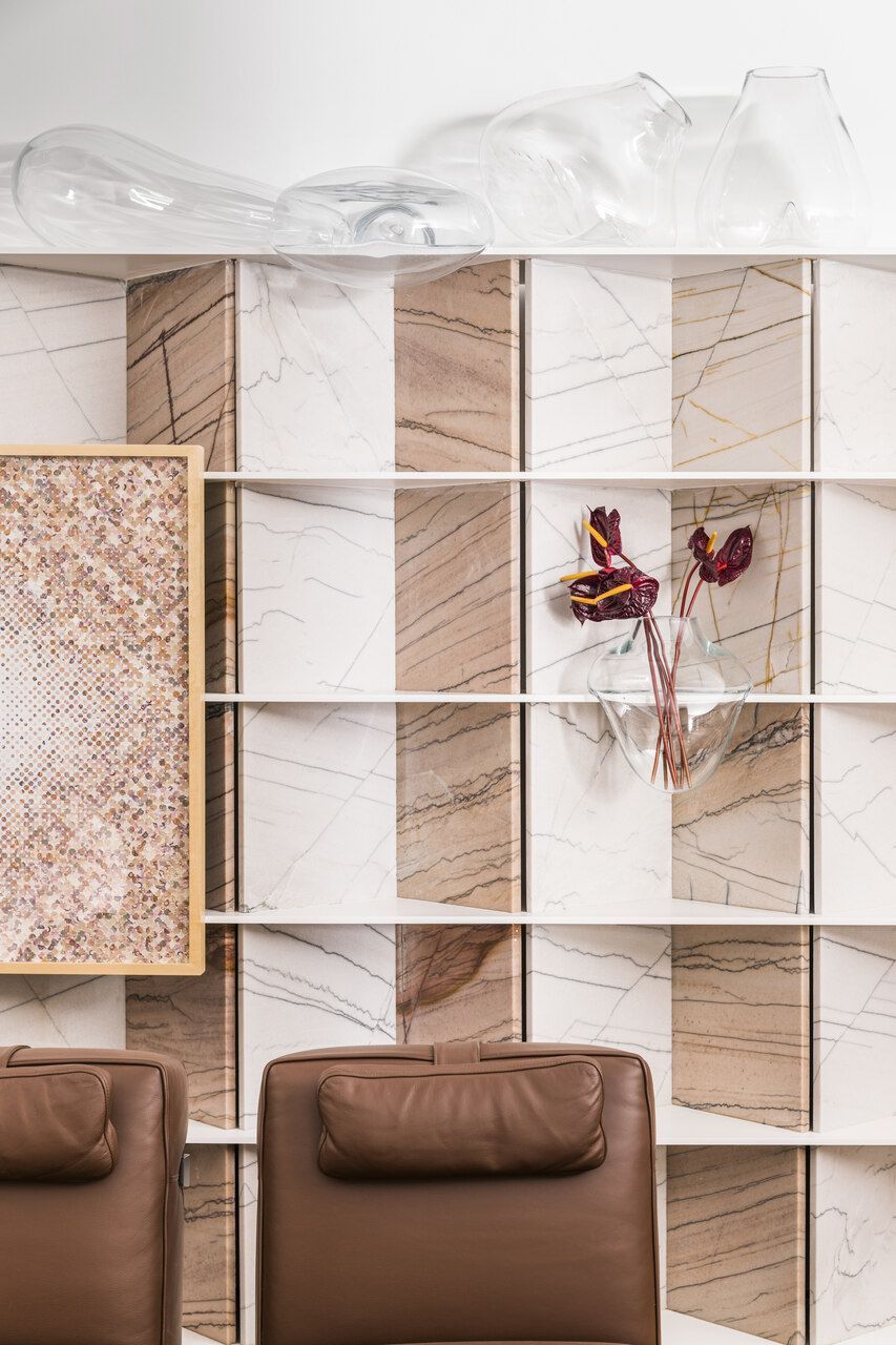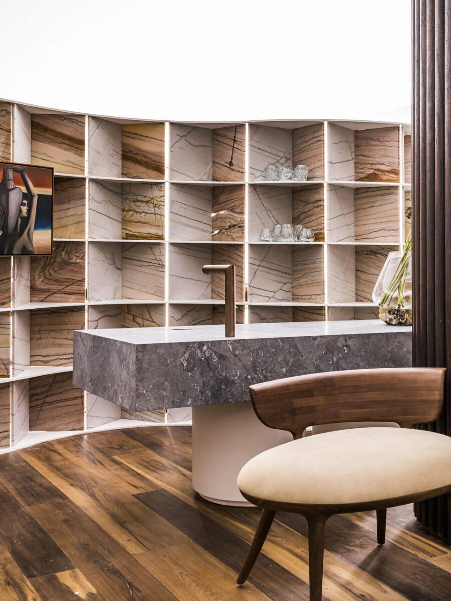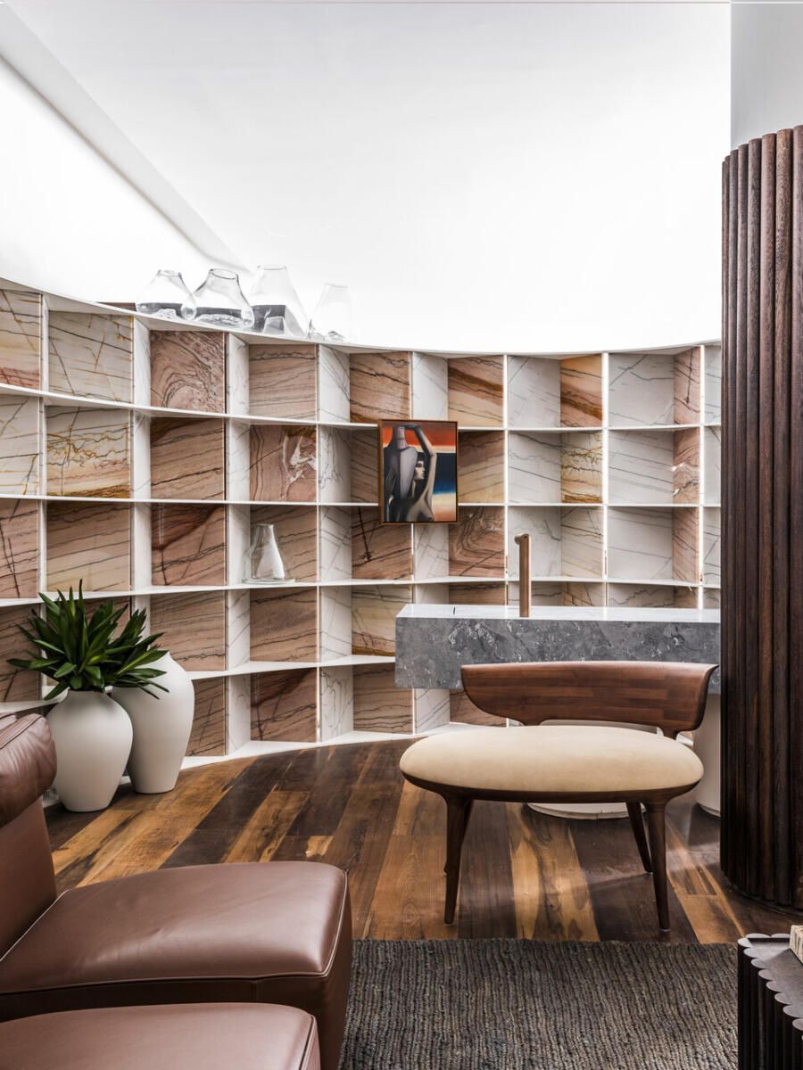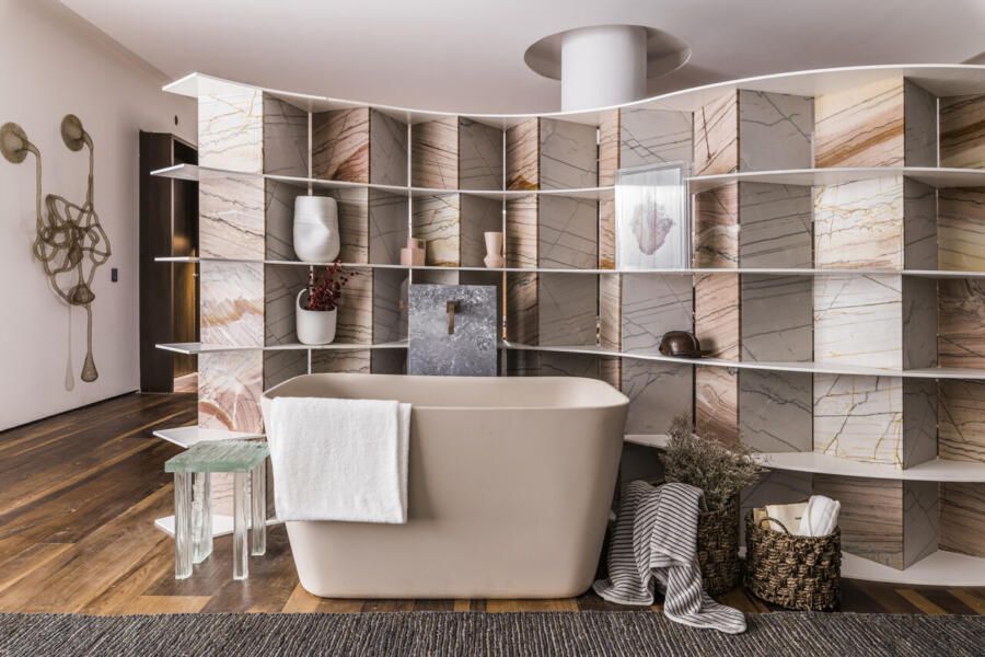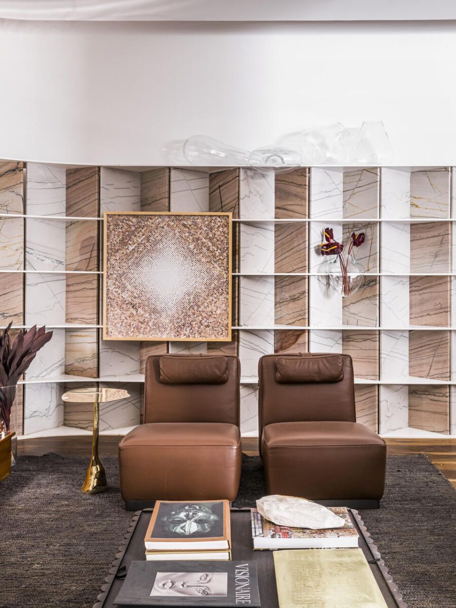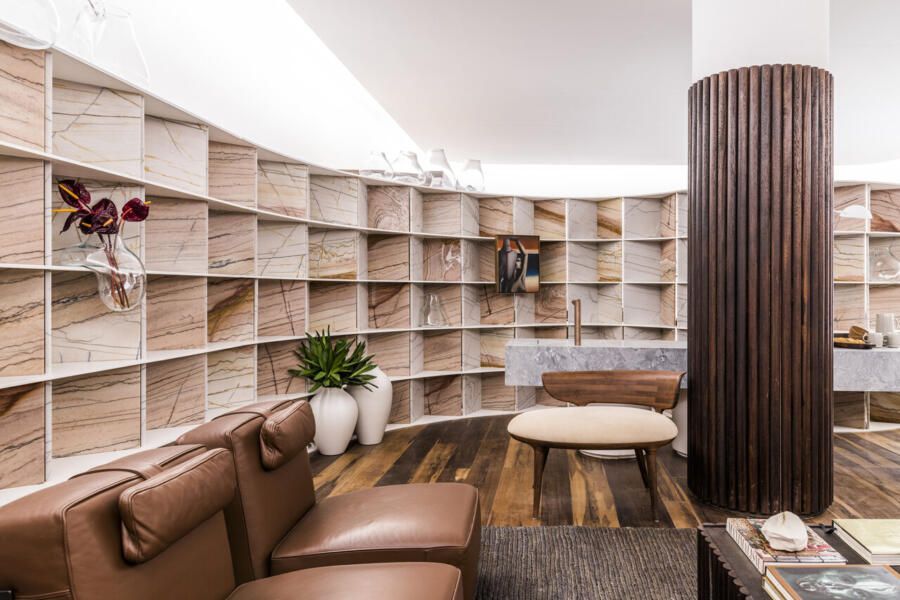 “Busquei inspiração no estilo cosmopolita que vivemos em São Paulo para criar o conceito. As cores criam uma linguagem ao mesmo tempo urbana e relaxante. Procurei criar um degradê com as cores das pedras, madeira e vidro.”