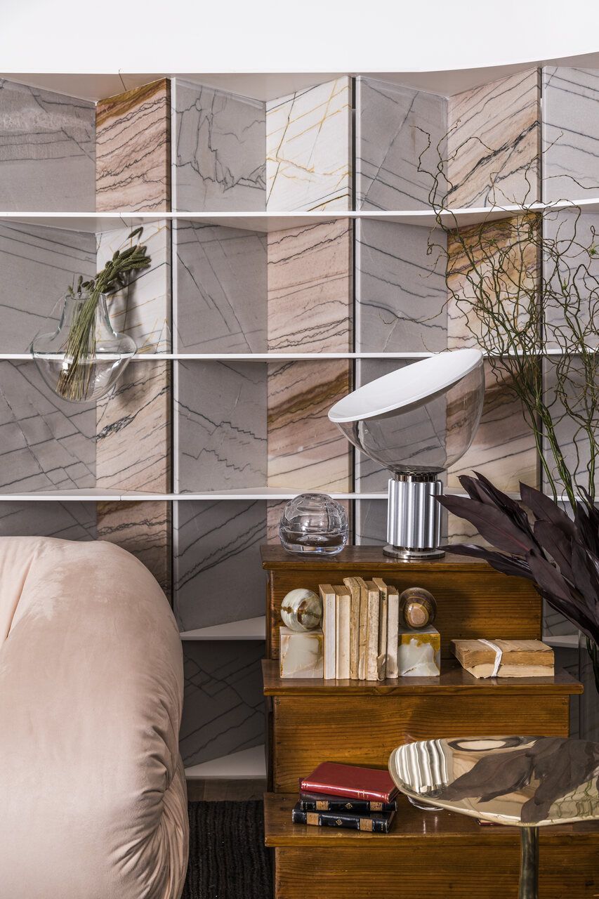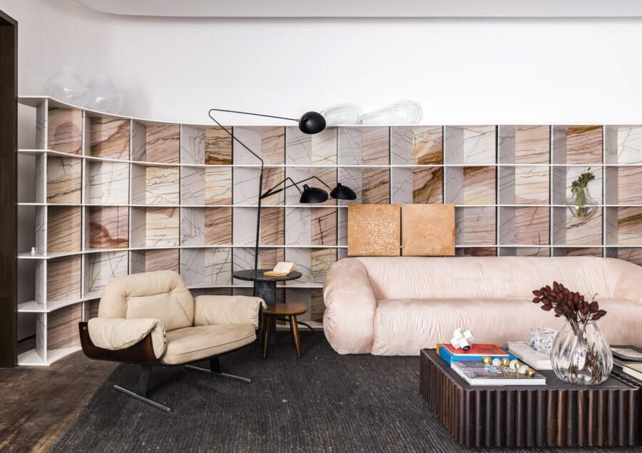 Nomeado “LOFT 011” em referência ao DDD da capital paulista, seus 88m² são divididos entre living integrado a uma bancada utilitária, quarto e banheiro, combinando tons de branco, cinza e rosa. Um dos destaques do ambiente é a bancada e o mix de pedras naturais, cuidadosamente selecionadas, aplicadas em diferentes pontos do ambiente, que produzem um efeito visual de impressionar.