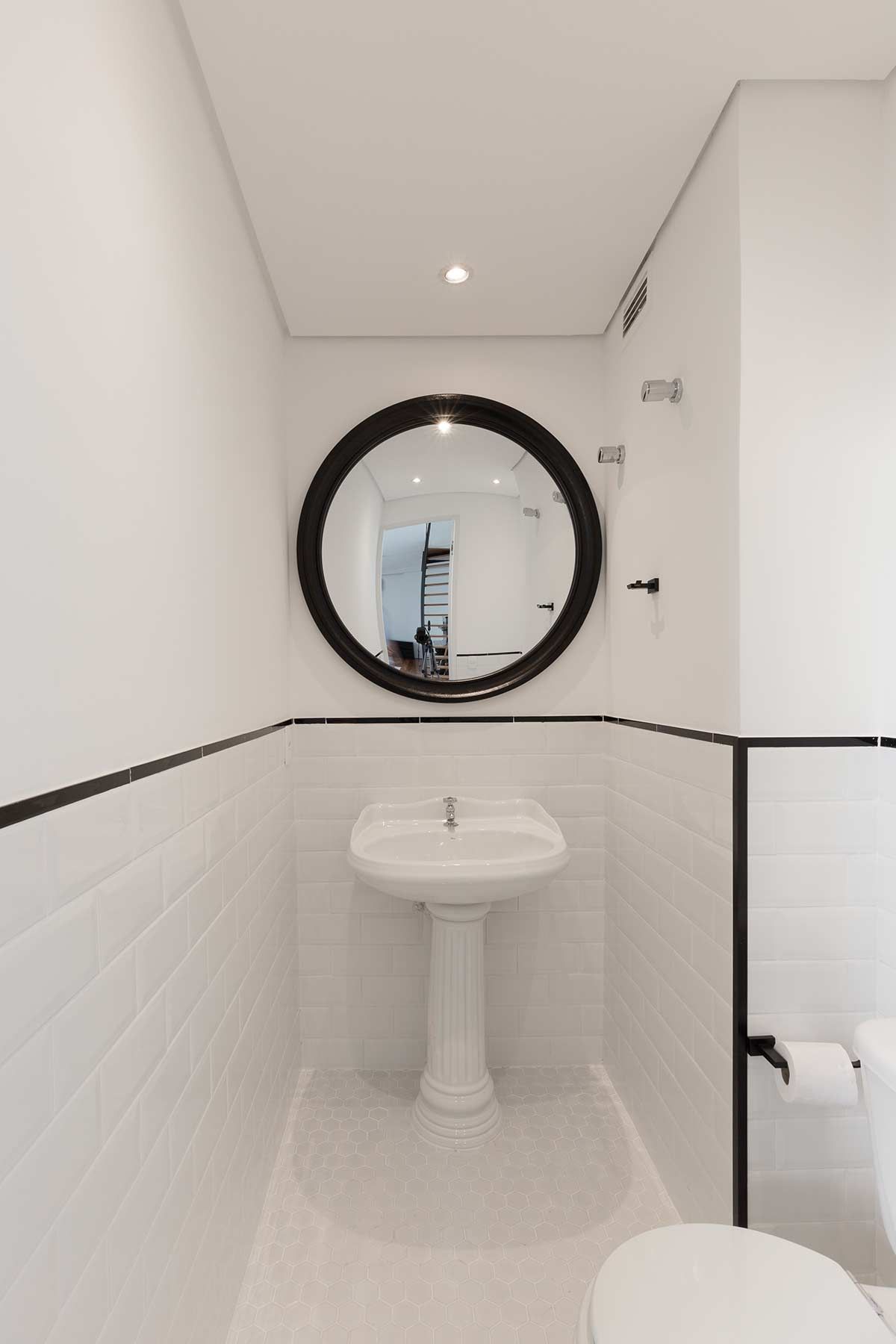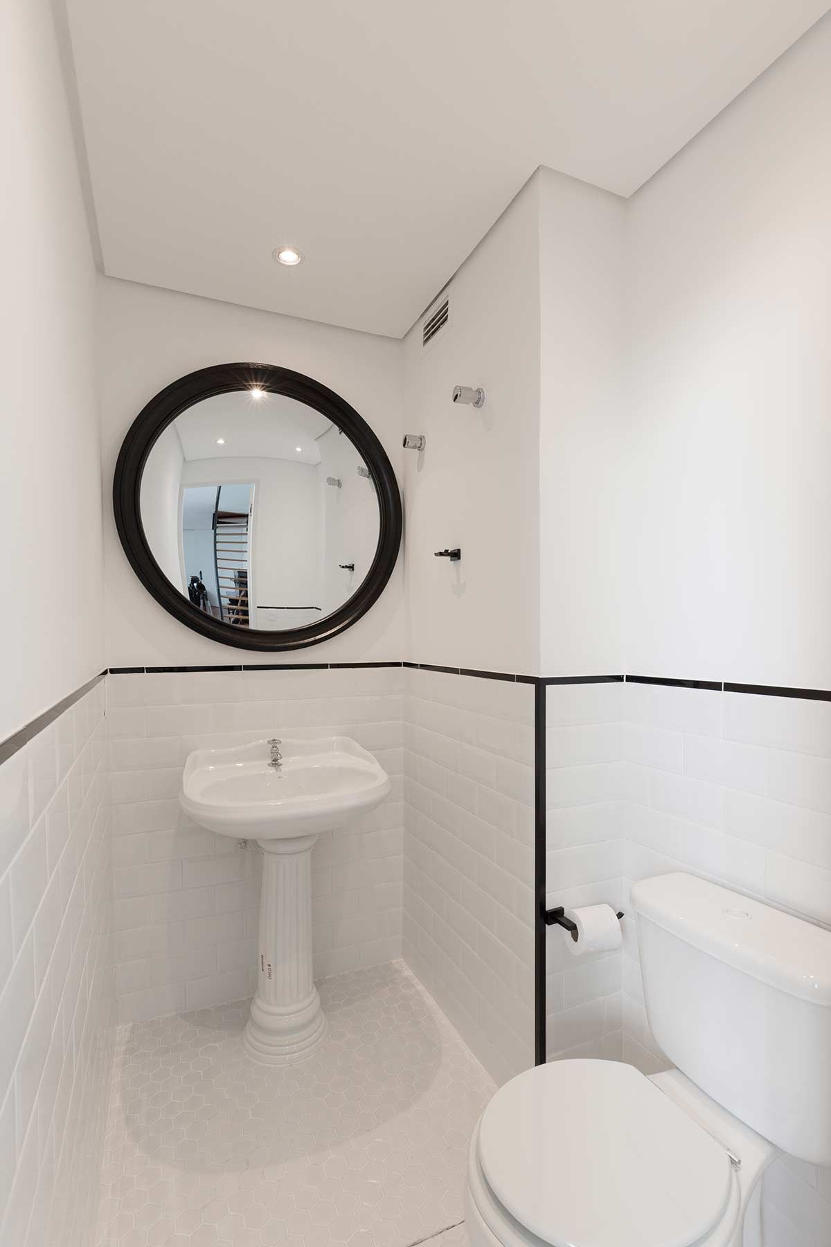 No lavabo, um mix com pastilha hexagonal branca no piso e tijolo de cerâmica a vista na parede, são repartidos por um filete preto para dar acabamento, acentuando a atmosfera minimalista. Por fim, a cuba retrô e o espelho redondo, dão charme e personalidade ao espaço.