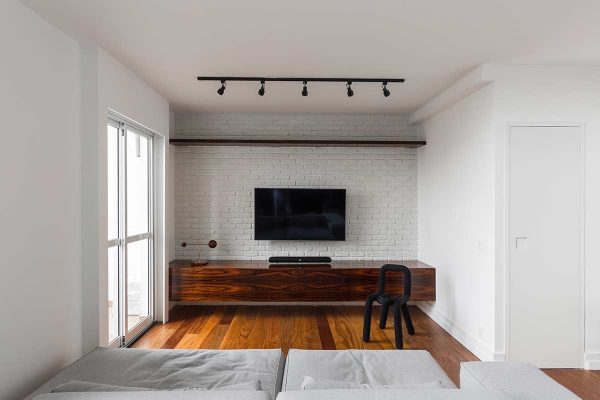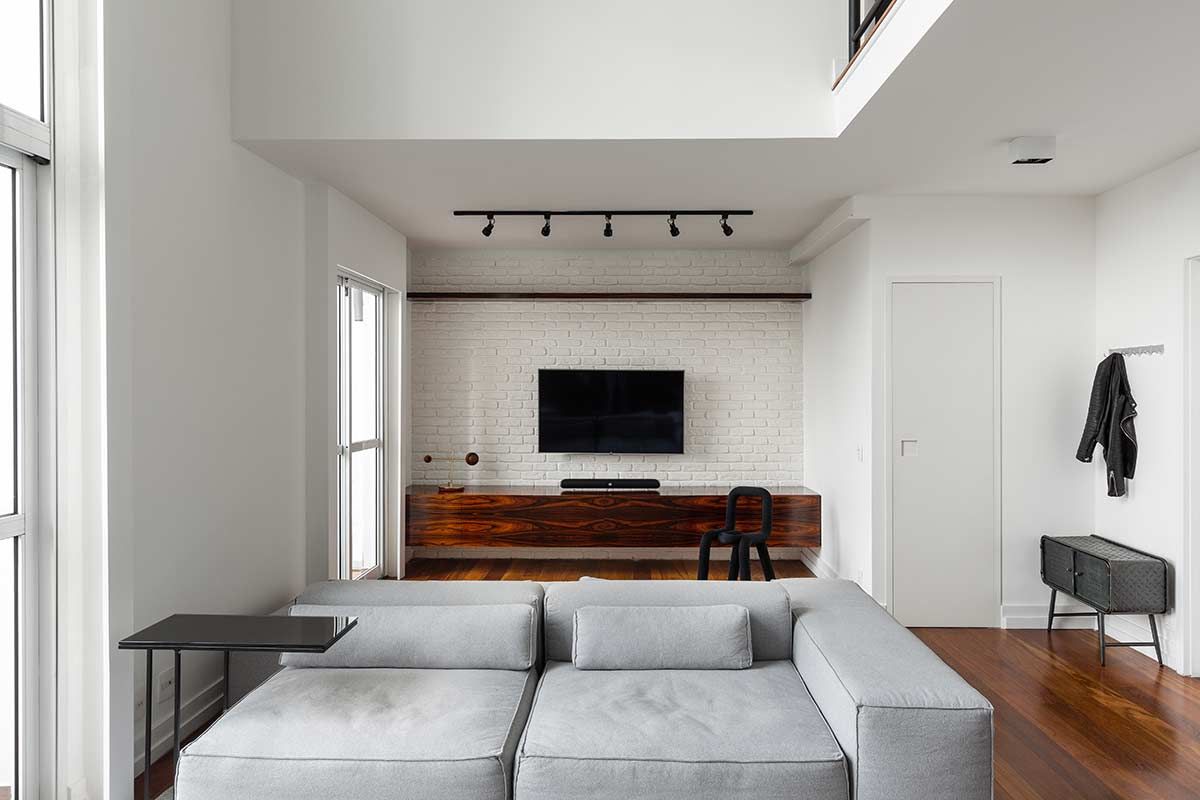 O proprietário deste loft no bairro Panamby em São Paulo, contatou a arquiteta Bruna Pires para deixar a área social mais integrada, e atualizar a decoração. Utilizando conceitos minimalistas como premissa, a paleta de cores sugerida pela profissional foi o cinza, branco e preto, aliados à madeira e acabamentos como o tijolo a vista em tom alvejado, que remete aos famosos lofts nova iorquinos.