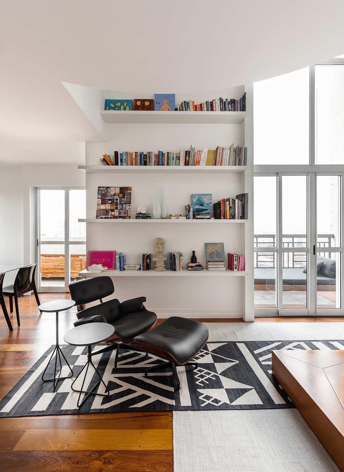 A escada e a iluminação aparente na cor preta, reforçam a atmosfera contemporânea do estar. Assim como o rack, o mobiliário foi desenhado pela arquiteta, que escolheu uma sobreposição de tapetes para integrar o cômodo, que mesmo sendo comprido, ficou bem aconchegante.