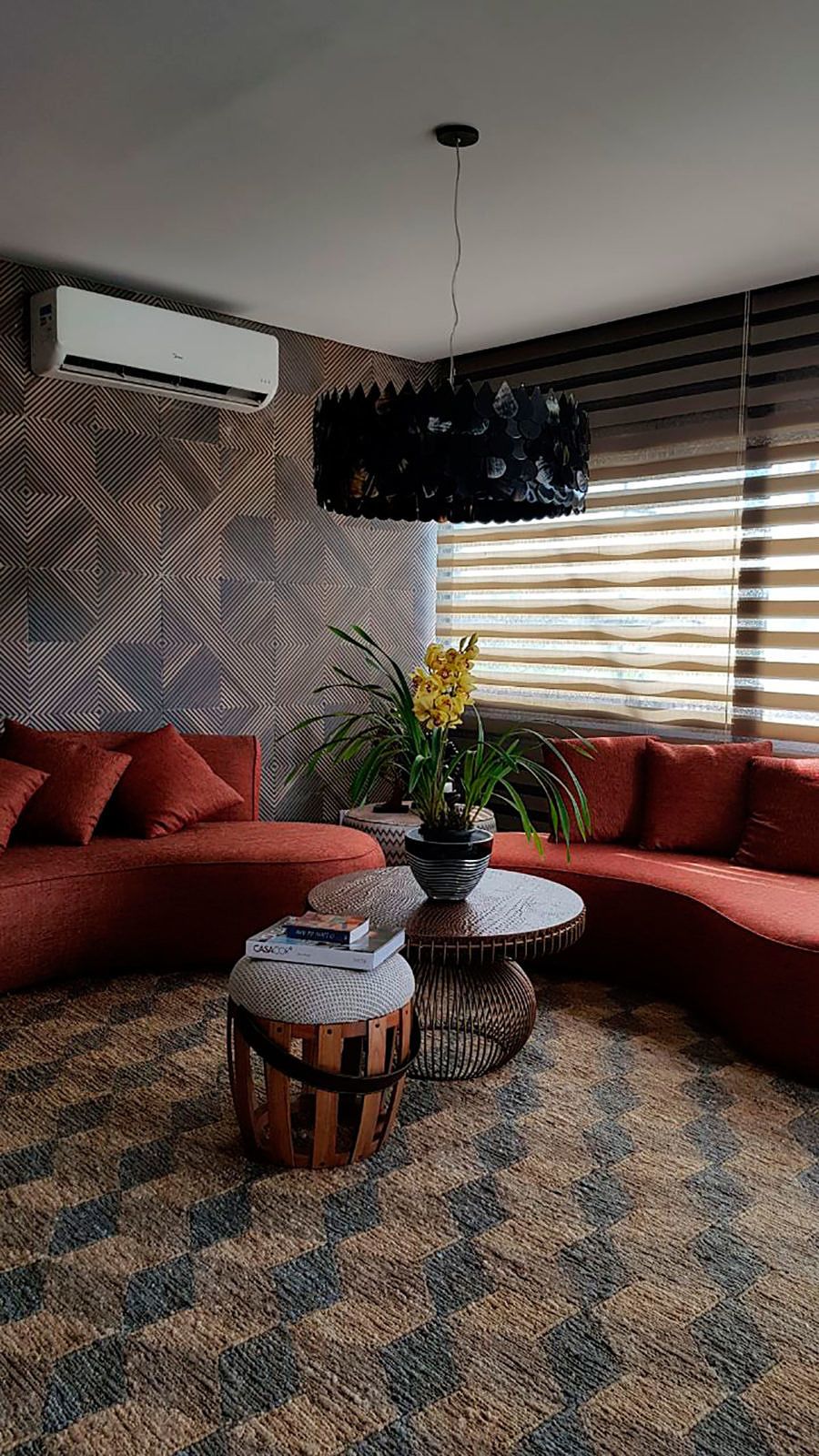 Os tons claros e terrosos criam uma atmosfera calma, que convida a permanecer no ambiente. Junto a Cortina Atena Amorim, que tem um feito translúcido e proporciona estilo próprio, dando harmonia ao espaço como divisórias em franjas leves.