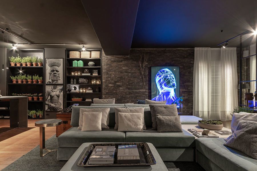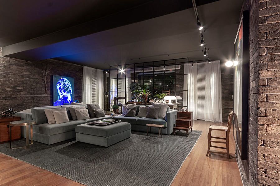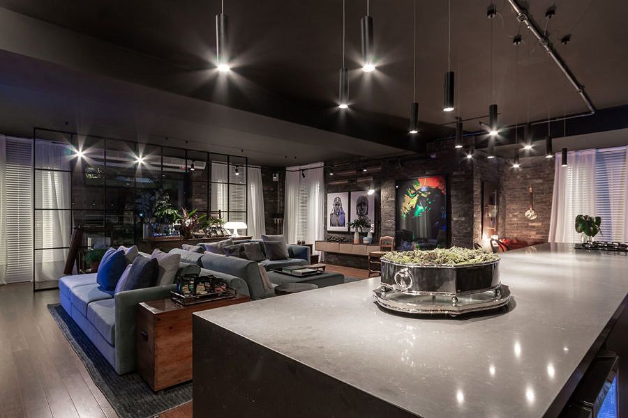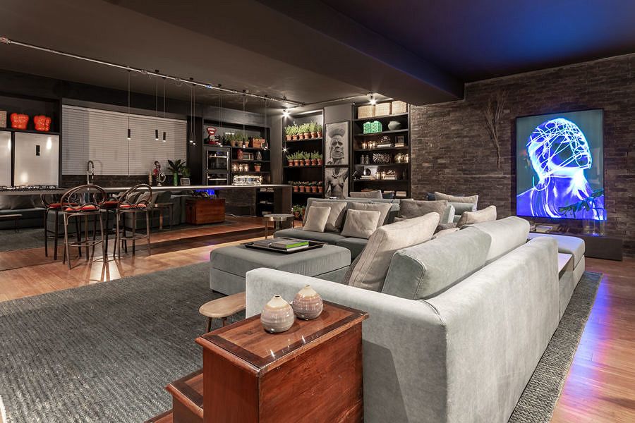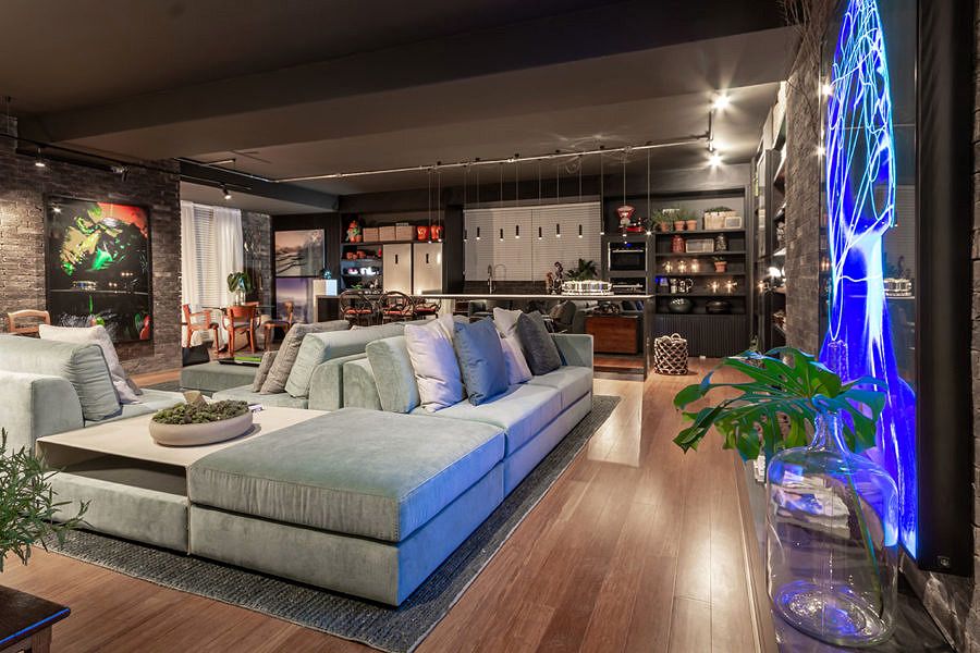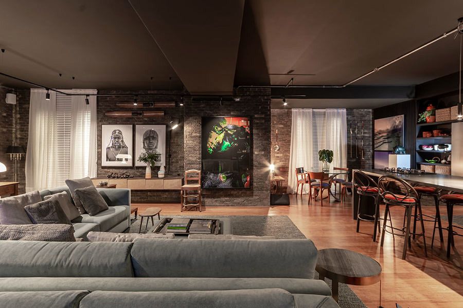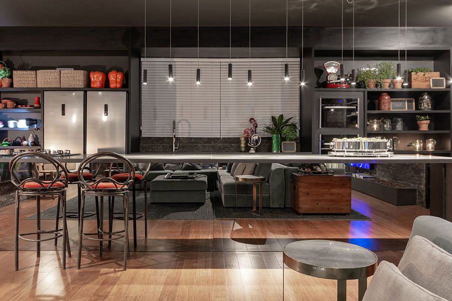 O ambiente assinado por Gustavo Paschoalim para a CASACOR São Paulo tem 92m², com uma cozinha gourmet integrada ao amplo living. Com a pegada dos lofts americanos, utiliza piso de demolição de bambu, iluminação em trilhos aparentes e tijolos ingleses nas paredes.