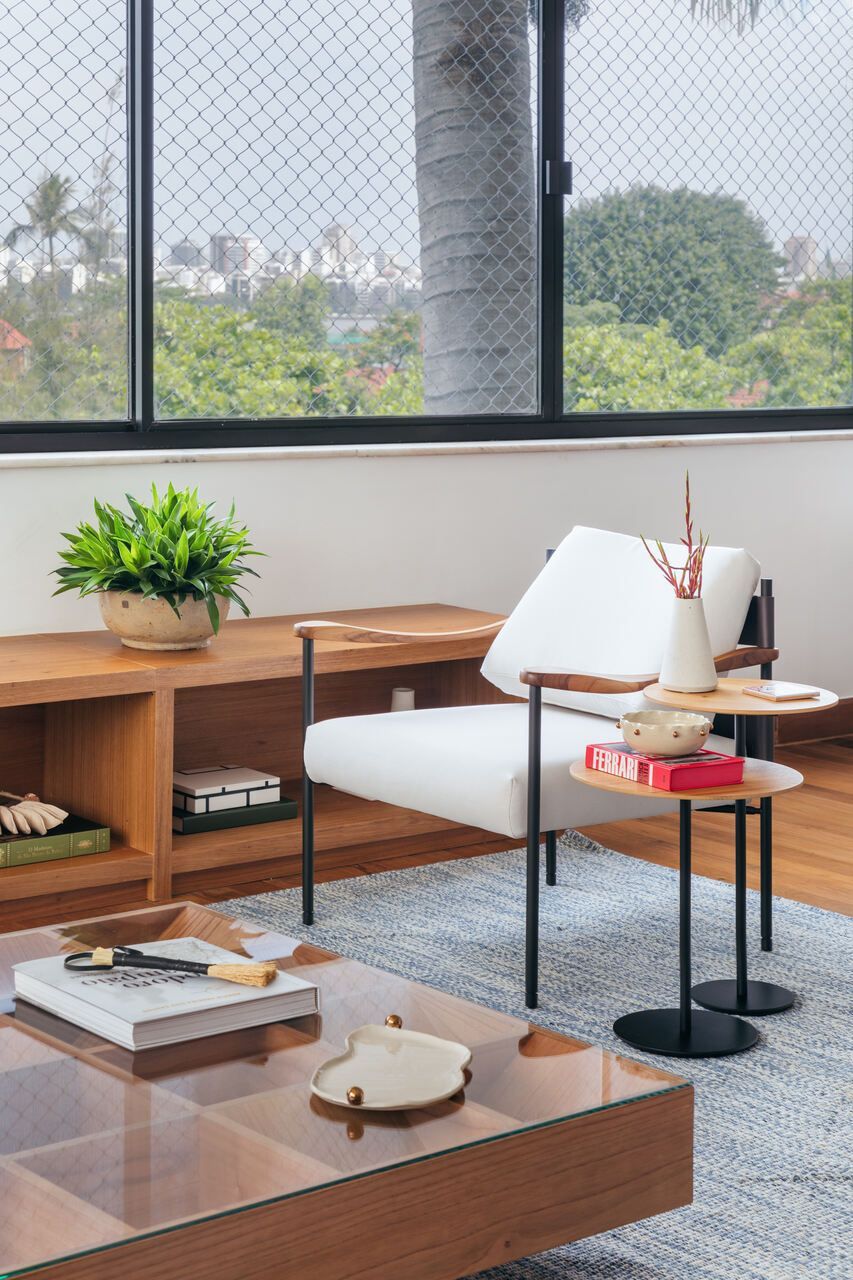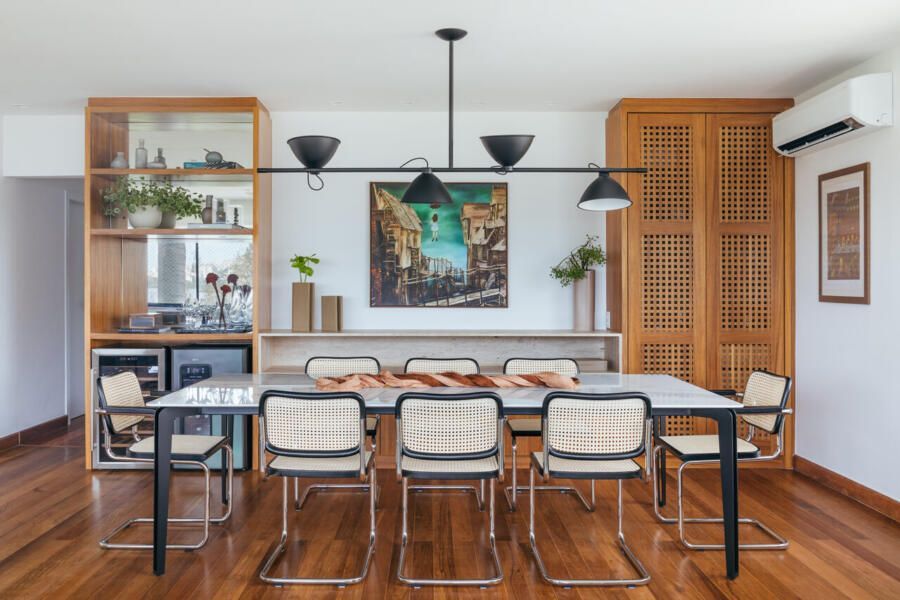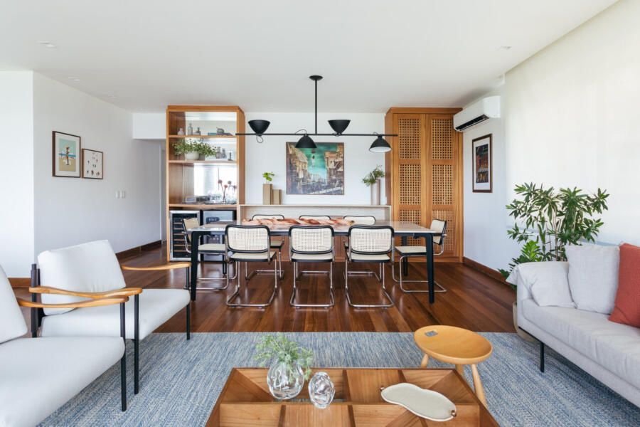 A área social que integra os ambientes de estar, jantar e TV, ganhou uma decoração bem contemporânea com móveis e objetos de design assinado, como a luminária de Lina Bo Bardi e as cadeiras Cesca, de Marcel Breuer, ambos na sala de jantar. Já as poltronas de Ronald Sasson e o banquinho Mocho, de Sérgio Rodrigues, são destaque no estar.