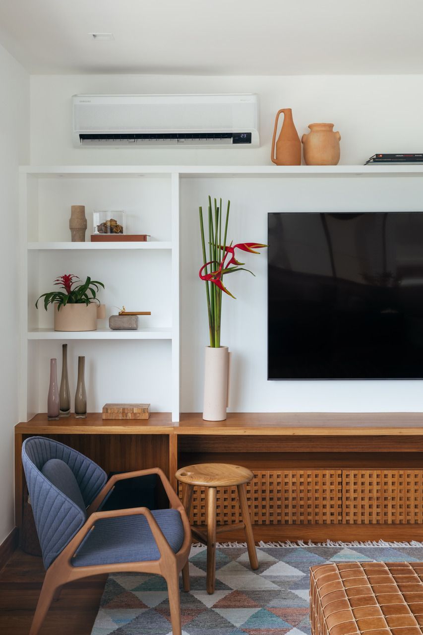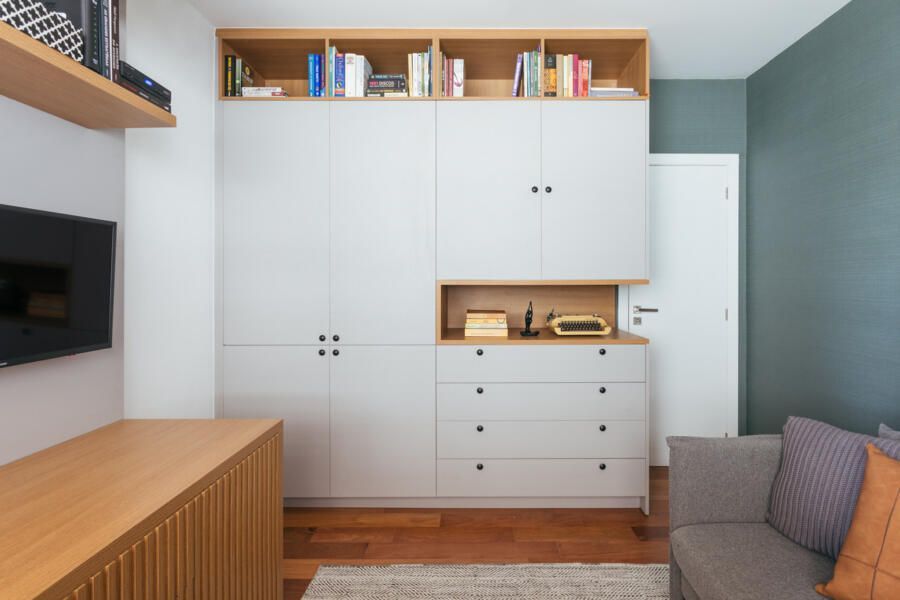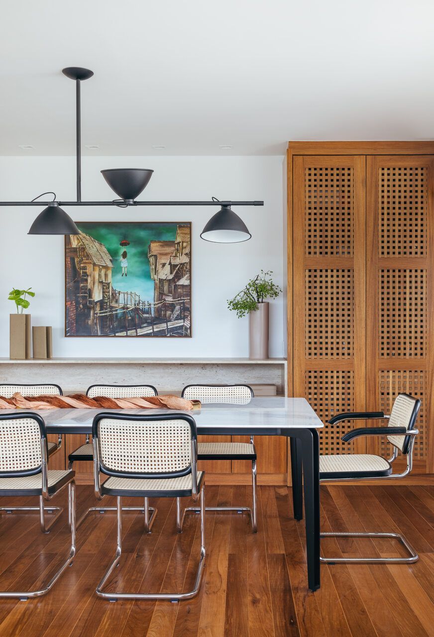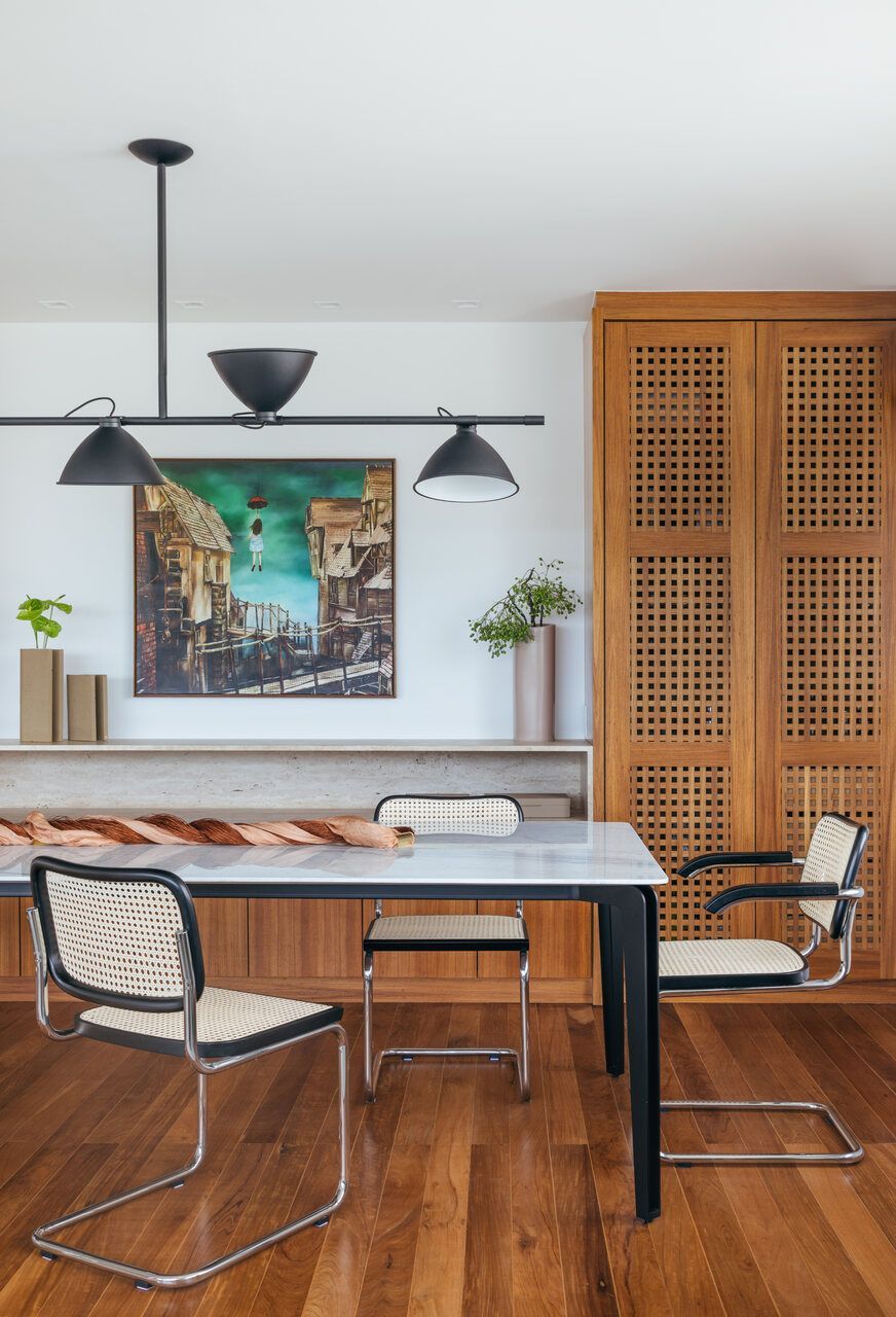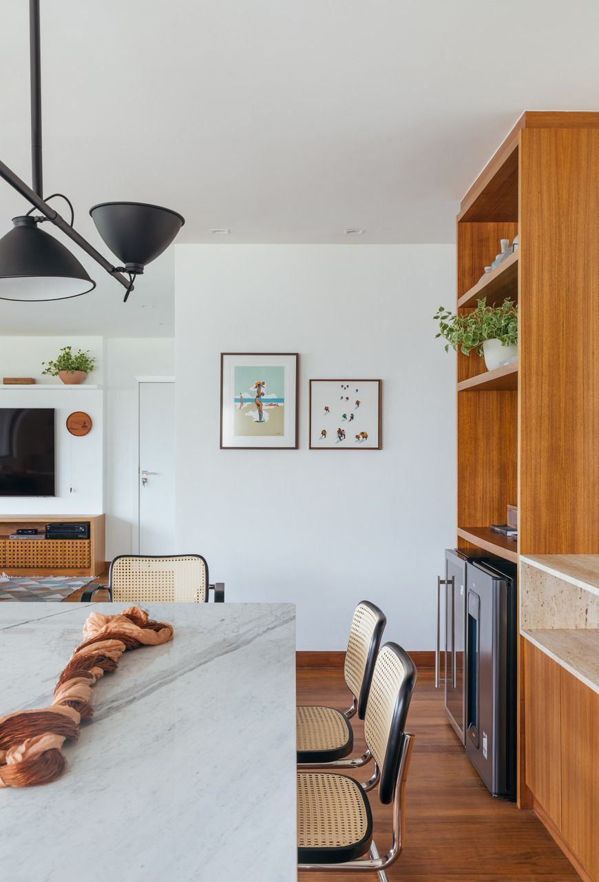 O piso original da área social, em Ipê, foi mantido. Já o dos quartos e corredores, que estava coberto por laminado, foi substituído por um novo revestimento em cumaru, que tem uma tonalidade bem parecida. A marcenaria é um dos grandes destaques do projeto: na área social, ela vem em formato de muxarabi, tanto no móvel feito para a TV como no louceiro. Já nos quartos, ela ganha tons mais suaves que trazem leveza aos ambientes íntimos.