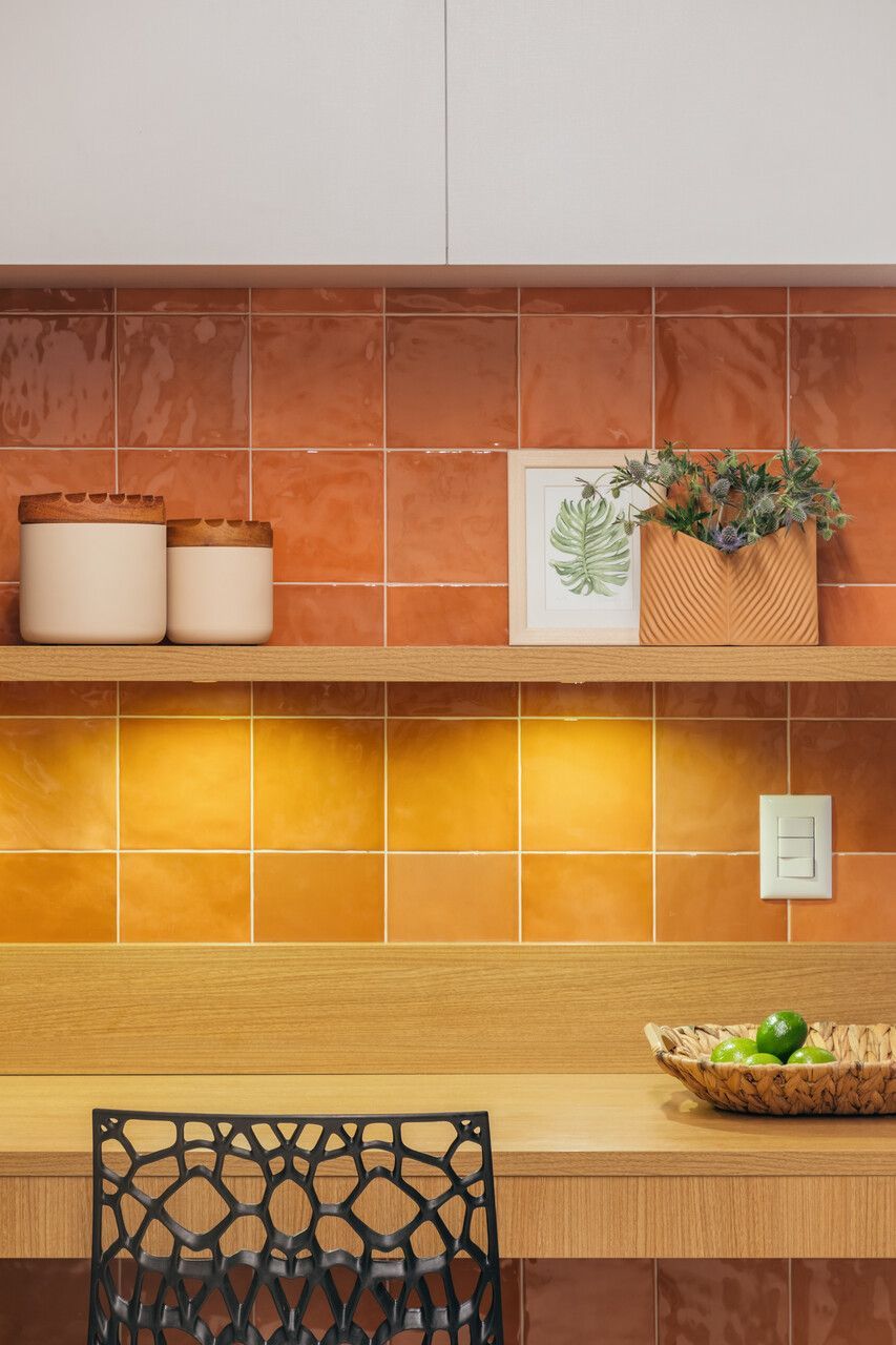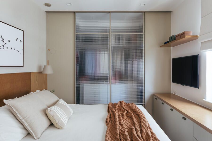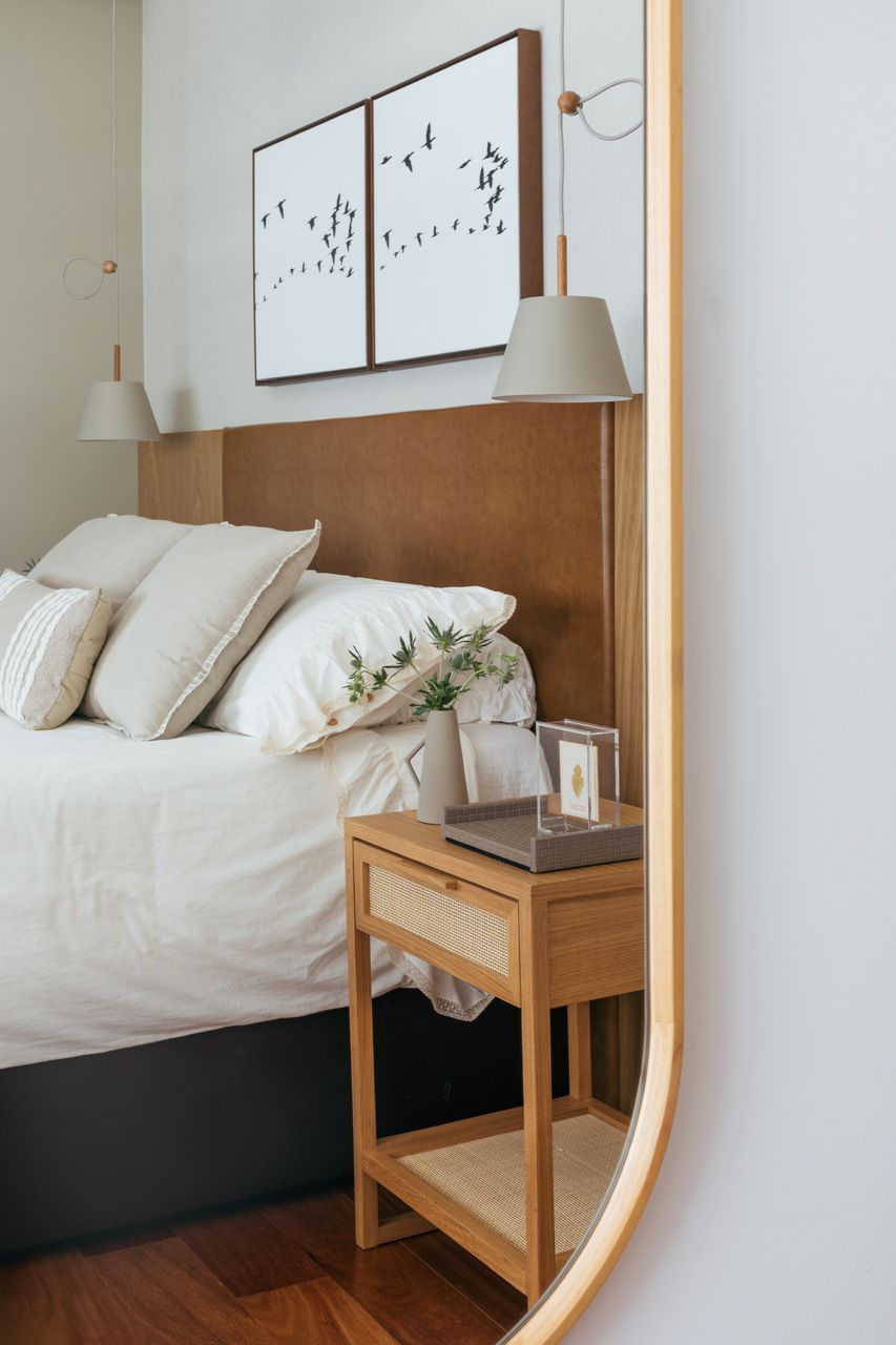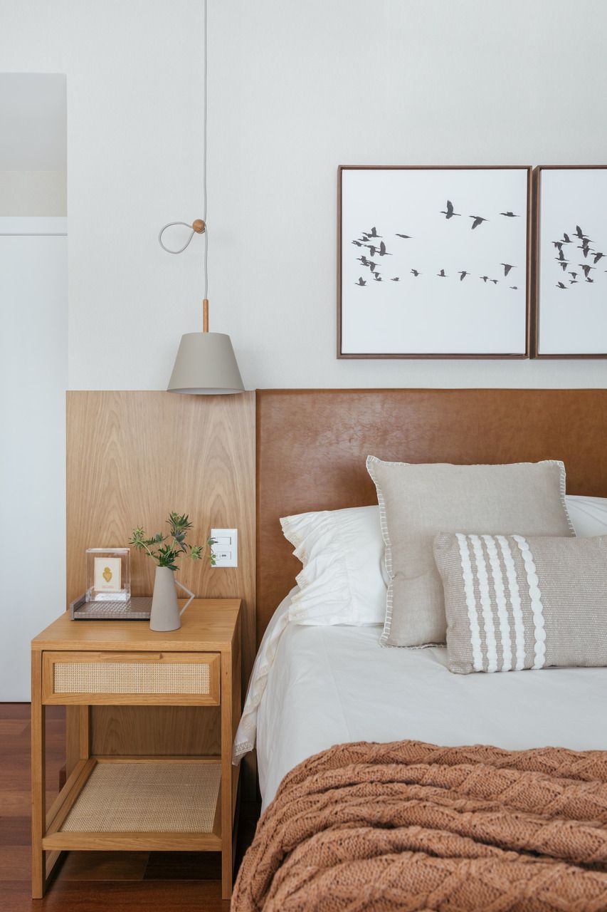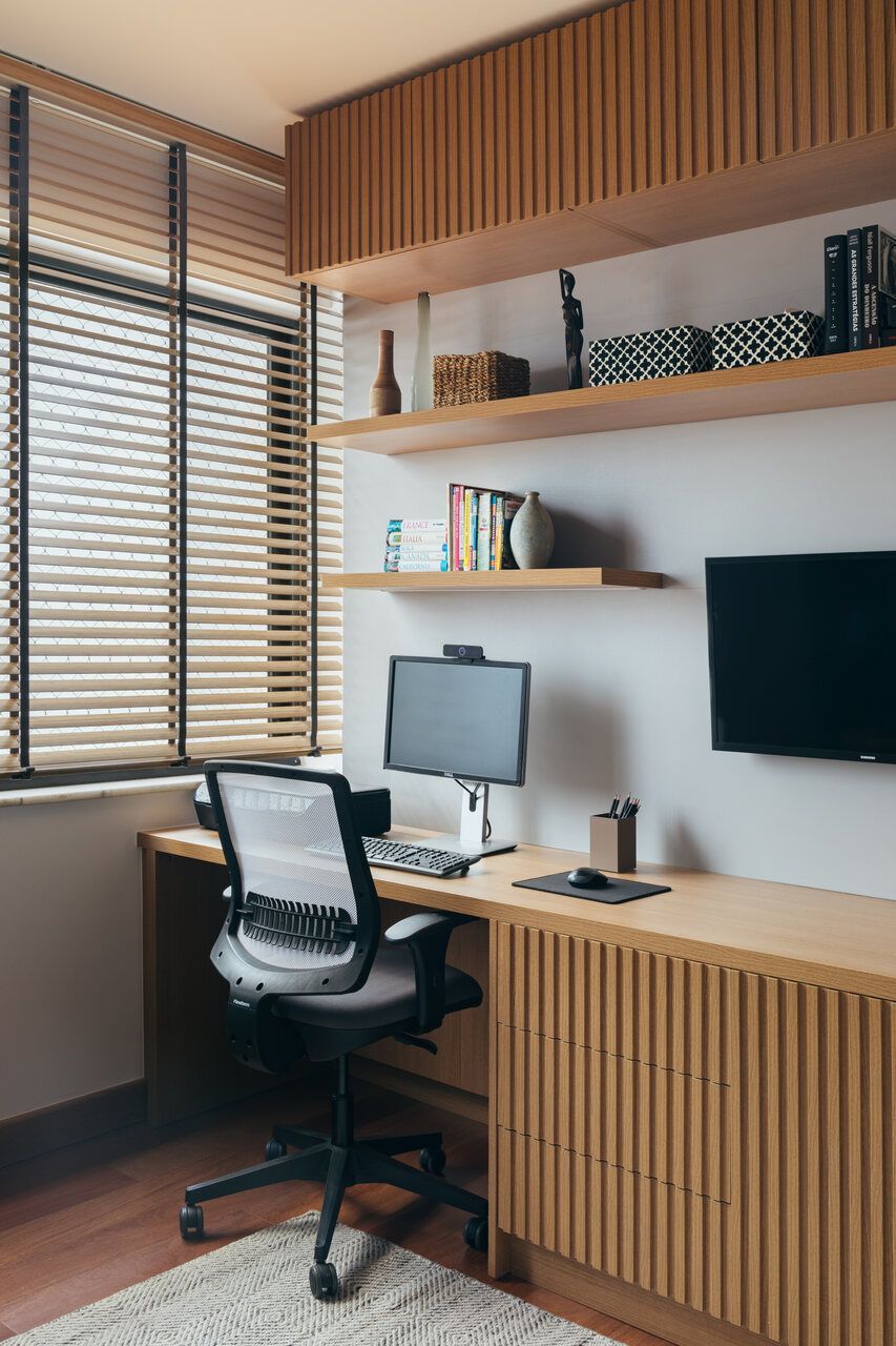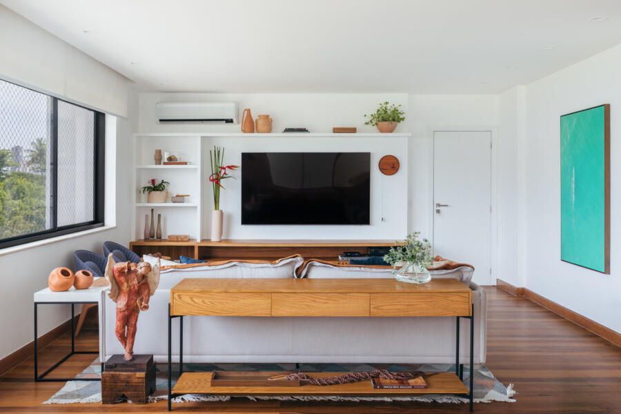 O piso original da área social, em Ipê, foi mantido. Já o dos quartos e corredores, que estava coberto por laminado, foi substituído por um novo revestimento em cumaru, que tem uma tonalidade bem parecida. A marcenaria é um dos grandes destaques do projeto: na área social, ela vem em formato de muxarabi, tanto no móvel feito para a TV como no louceiro. Já nos quartos, ela ganha tons mais suaves que trazem leveza aos ambientes íntimos.