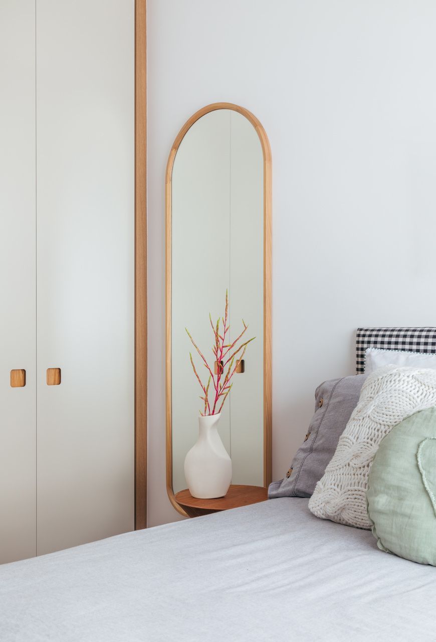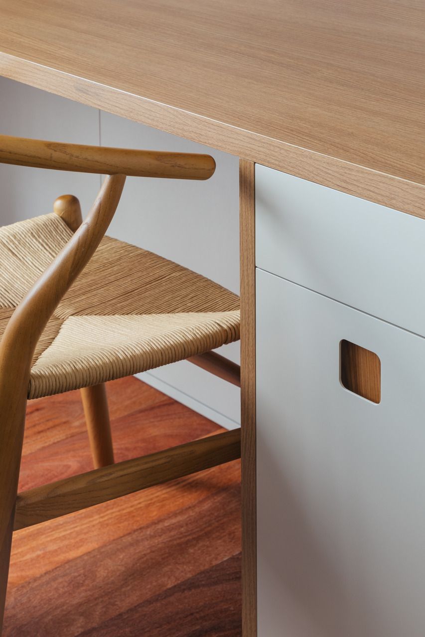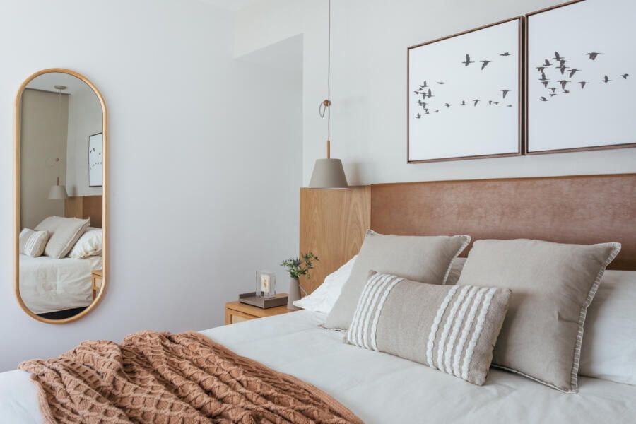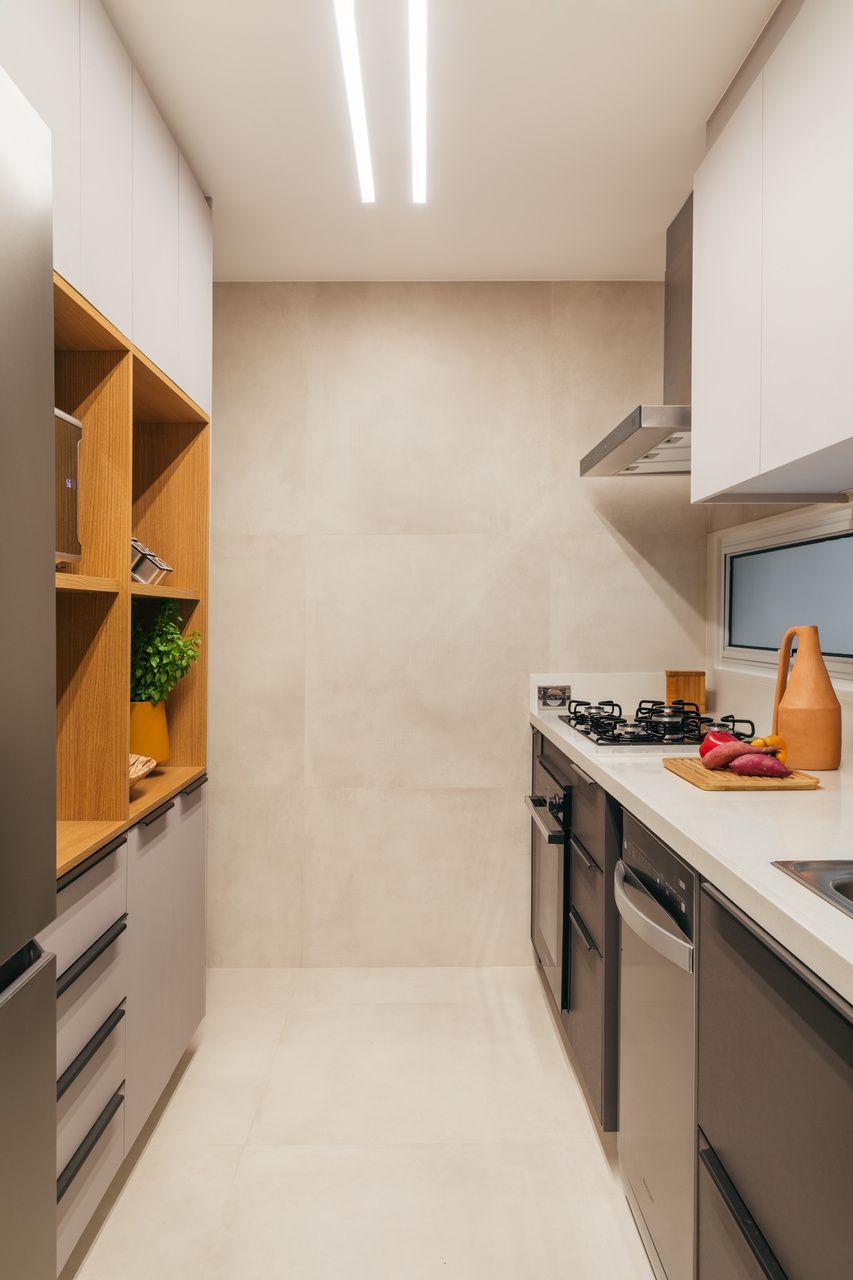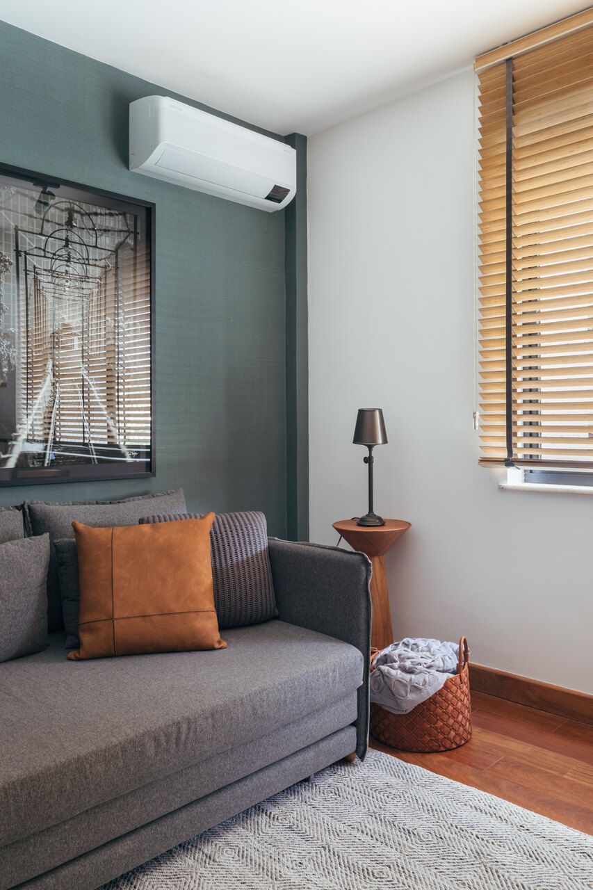 O piso original da área social, em Ipê, foi mantido. Já o dos quartos e corredores, que estava coberto por laminado, foi substituído por um novo revestimento em cumaru, que tem uma tonalidade bem parecida. A marcenaria é um dos grandes destaques do projeto: na área social, ela vem em formato de muxarabi, tanto no móvel feito para a TV como no louceiro. Já nos quartos, ela ganha tons mais suaves que trazem leveza aos ambientes íntimos.
