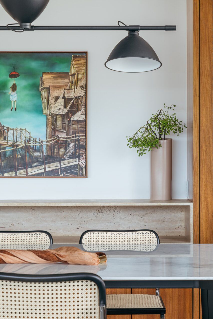 “Na sala, apostei em um mix de metais pretos, madeira e palhinha equilibrando cores e texturas e trazendo mais aconchego.”