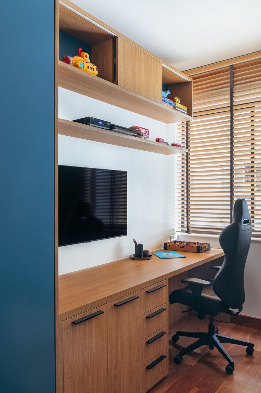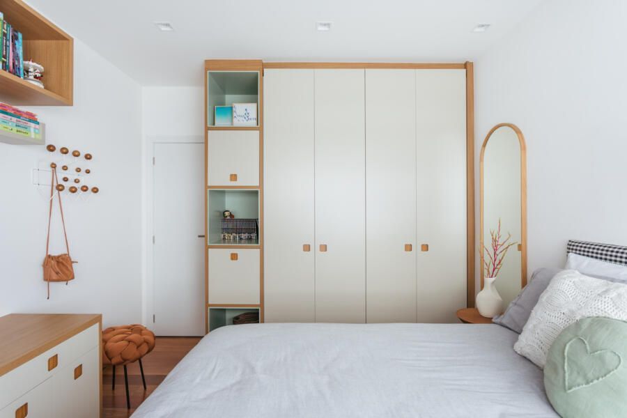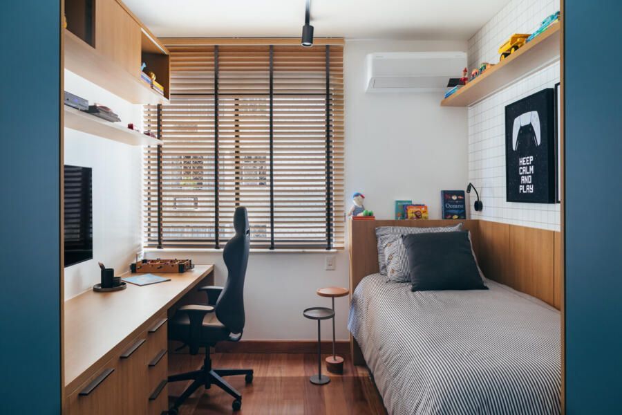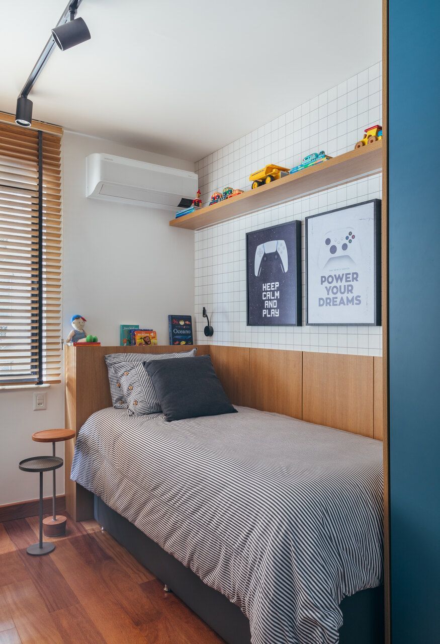 Ao todo, o apartamento possui quatro quartos. O do casal ganhou closet com portas de vidro que integram as áreas de dormir e vestir. Bem feminino, o quarto da filha tem cabeceira em vichy e quadrinhos coordenados, feitos sob medida, enquanto o do filho segue o tema gamer. Por último, o quarto de hóspedes funciona também como home-office e rouparia.