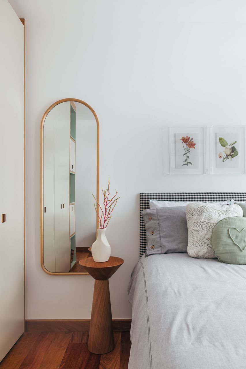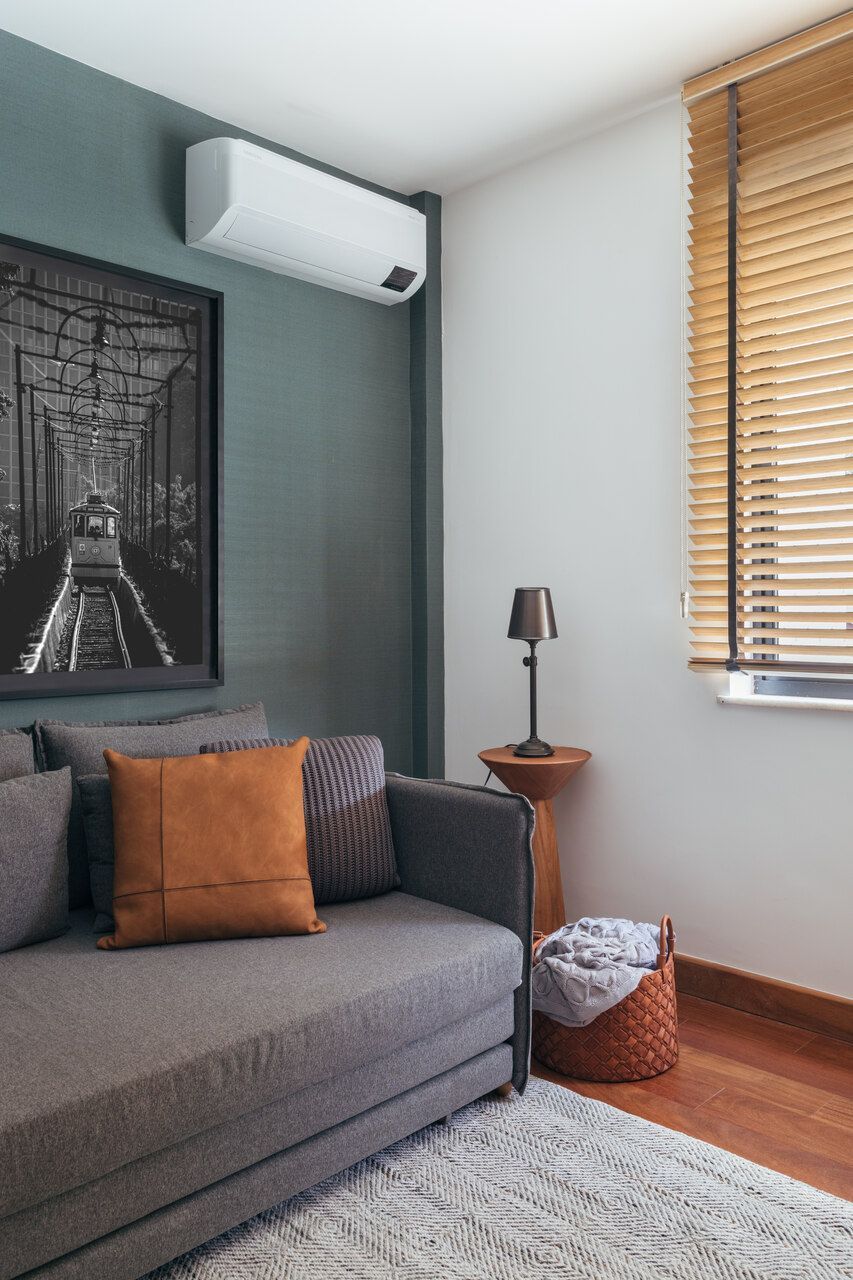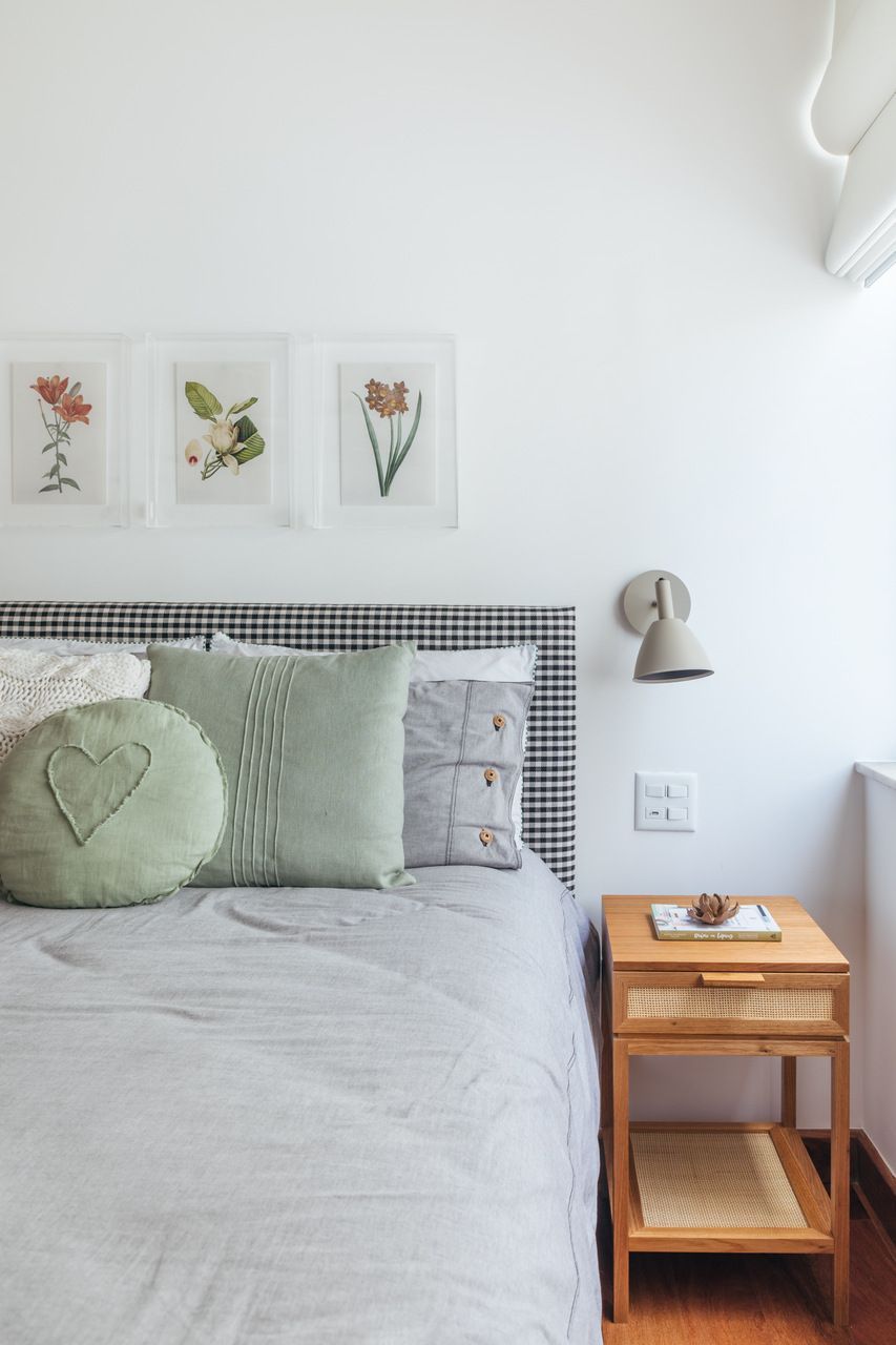 Ao todo, o apartamento possui quatro quartos. O do casal ganhou closet com portas de vidro que integram as áreas de dormir e vestir. Bem feminino, o quarto da filha tem cabeceira em vichy e quadrinhos coordenados, feitos sob medida, enquanto o do filho segue o tema gamer. Por último, o quarto de hóspedes funciona também como home-office e rouparia.
