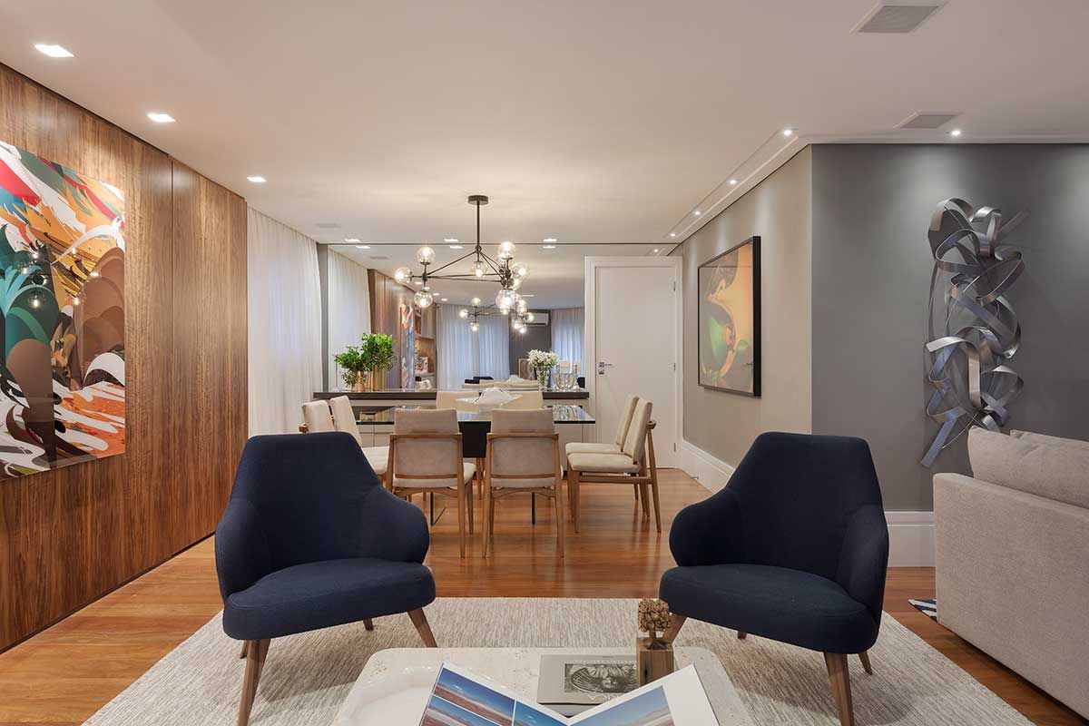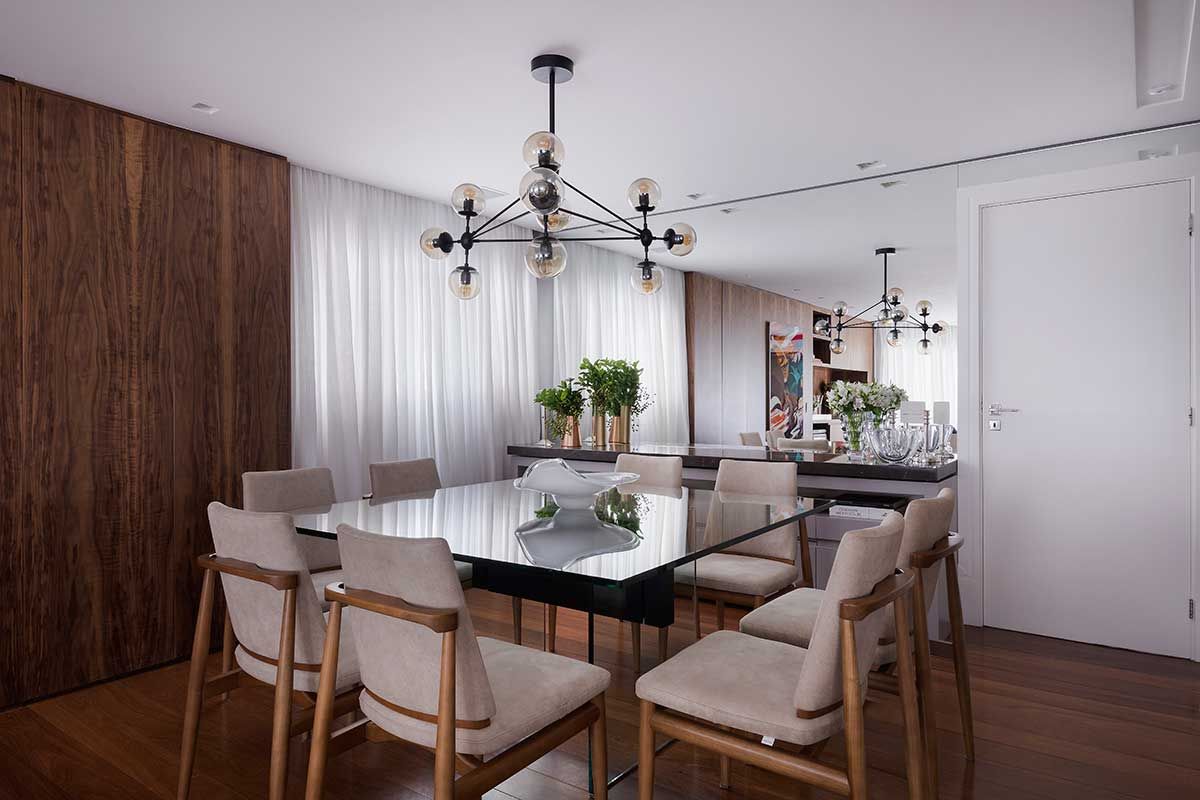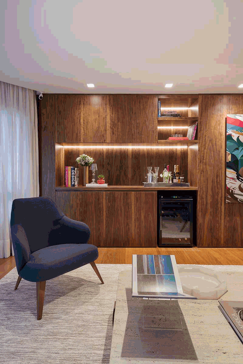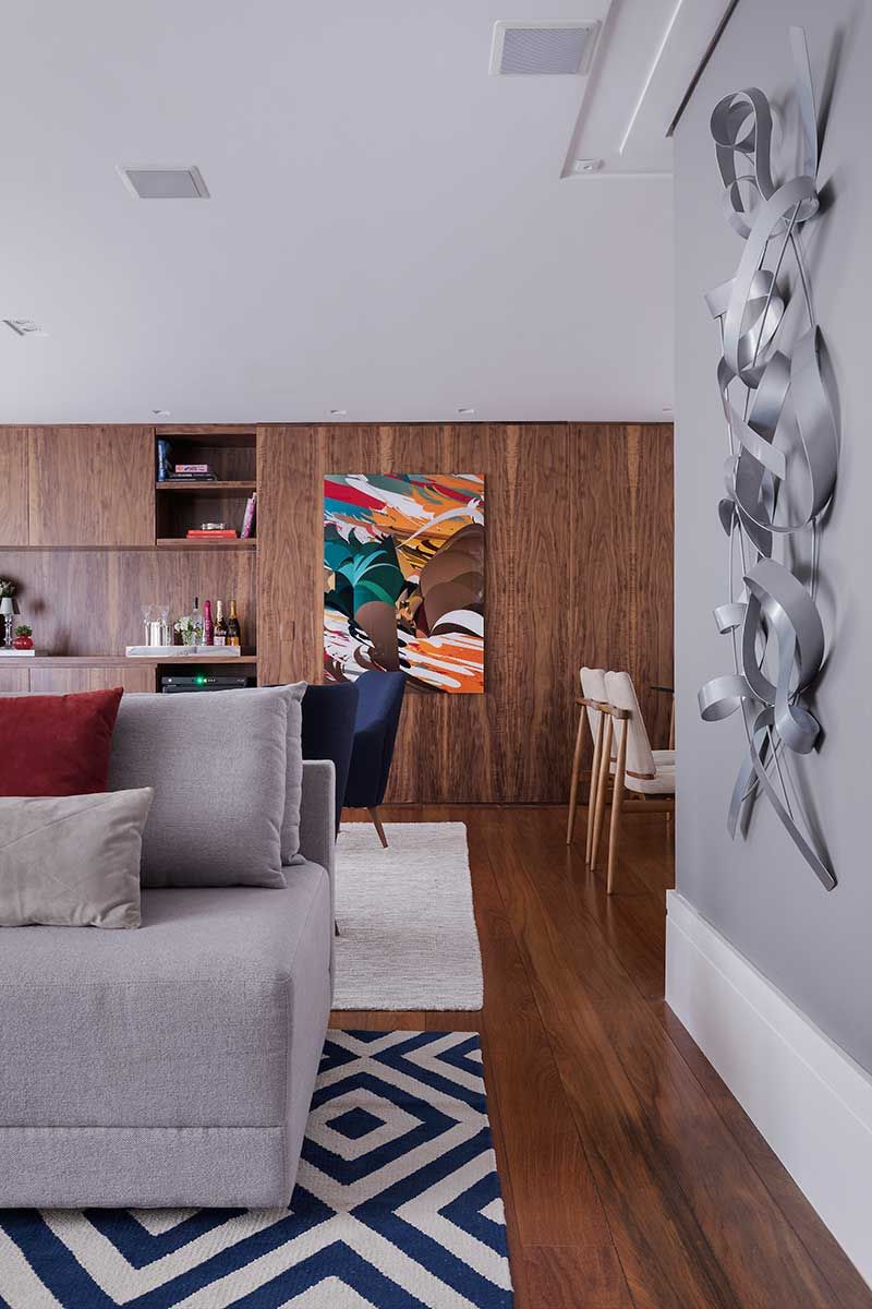 Os painéis em marcenaria ajudaram muito na ideia de uma integração leve e bem resolvida. Nesses painéis, tem um bar aparente, que atende tanto o lounge quanto o jantar, e um cristaleira que fica “embutida” e faceada no painel.