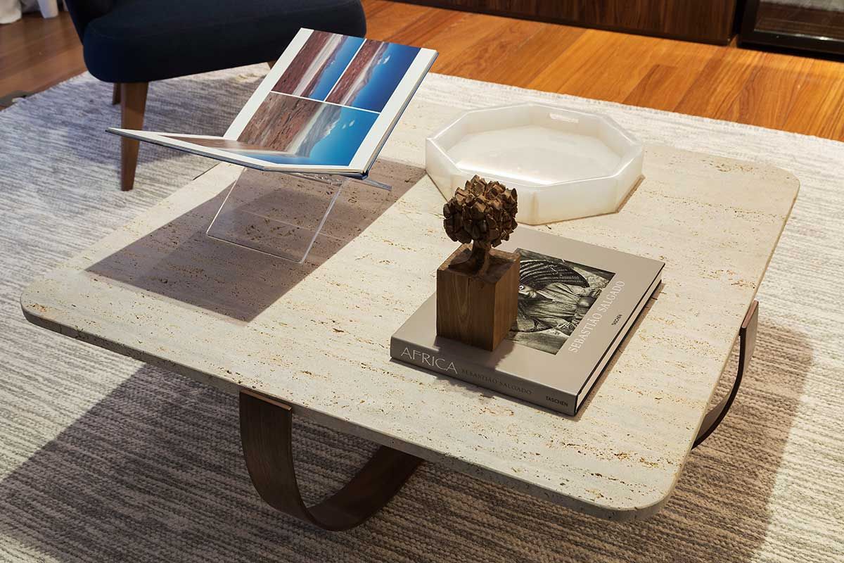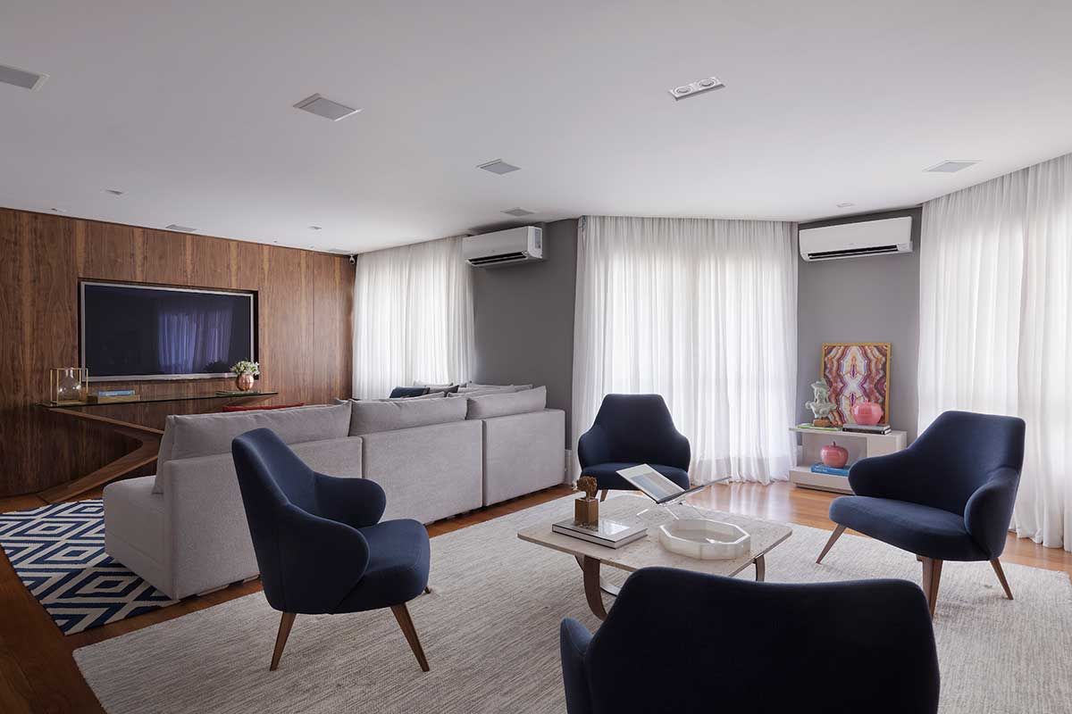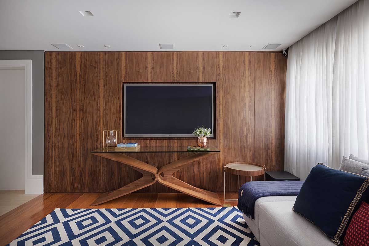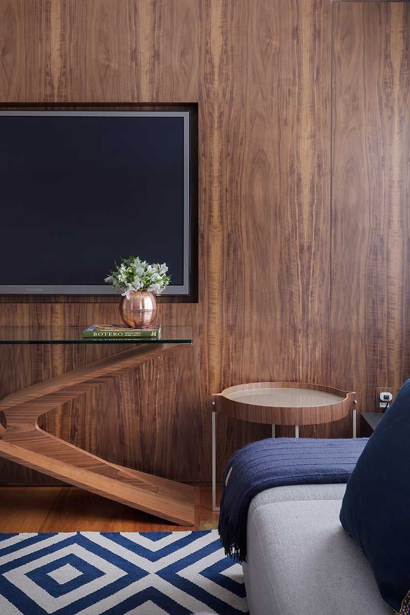 Os painéis em marcenaria ajudaram muito na ideia de uma integração leve e bem resolvida. Nesses painéis, tem um bar aparente, que atende tanto o lounge quanto o jantar, e um cristaleira que fica “embutida” e faceada no painel.