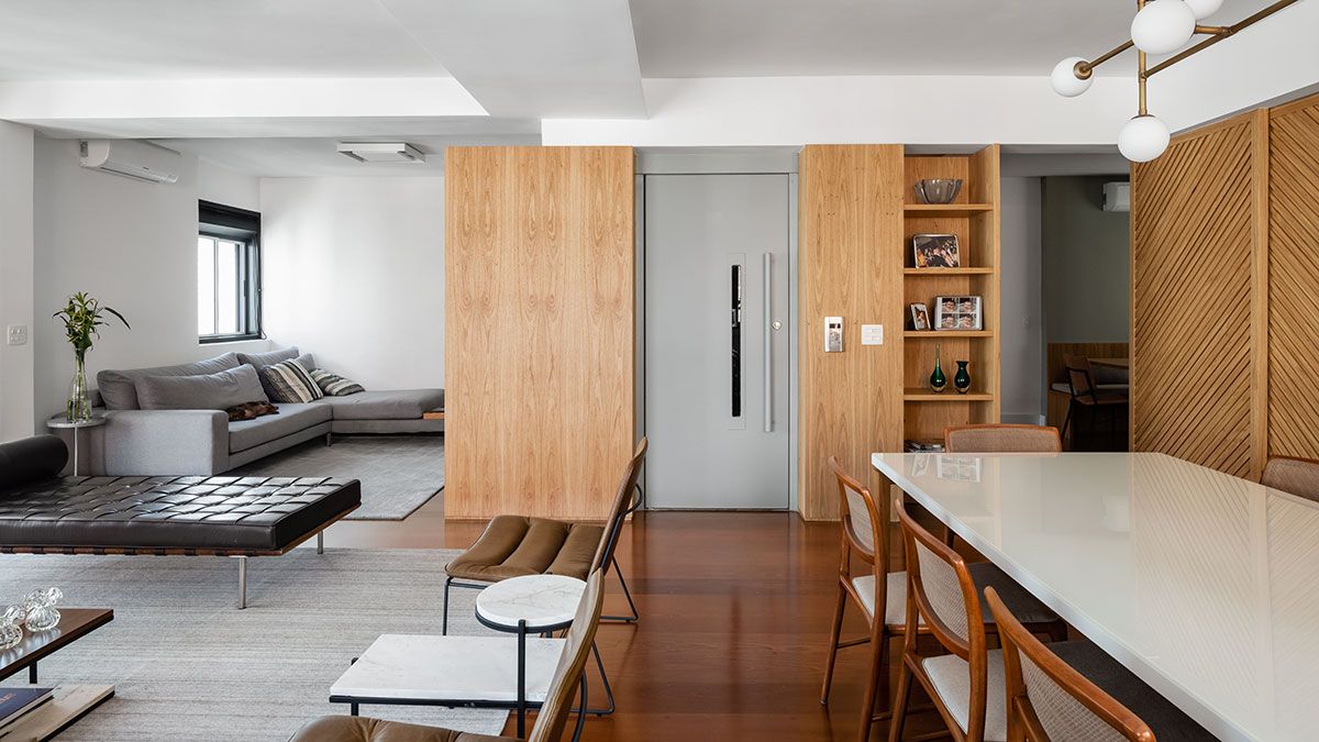O principal desafio do escritório foi conseguir unificar a área de convívio e tentar tirar a impressão de ambientes segmentados que o apartamento tinha. Para isso, tiraram partido da caixa do elevador e a transformaram em um elemento funcional e principal do estar. Ao seu redor foi criada uma marcenaria que vai alterando o uso em cada lado: ora é estante para livros, ora armários e ora rack para o home theater.