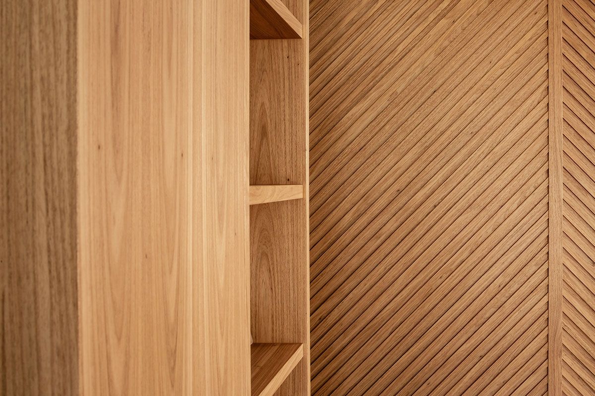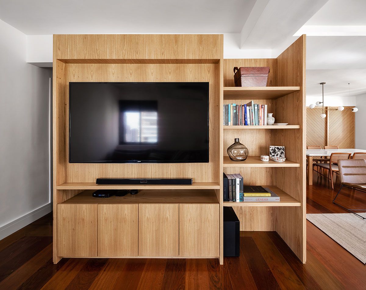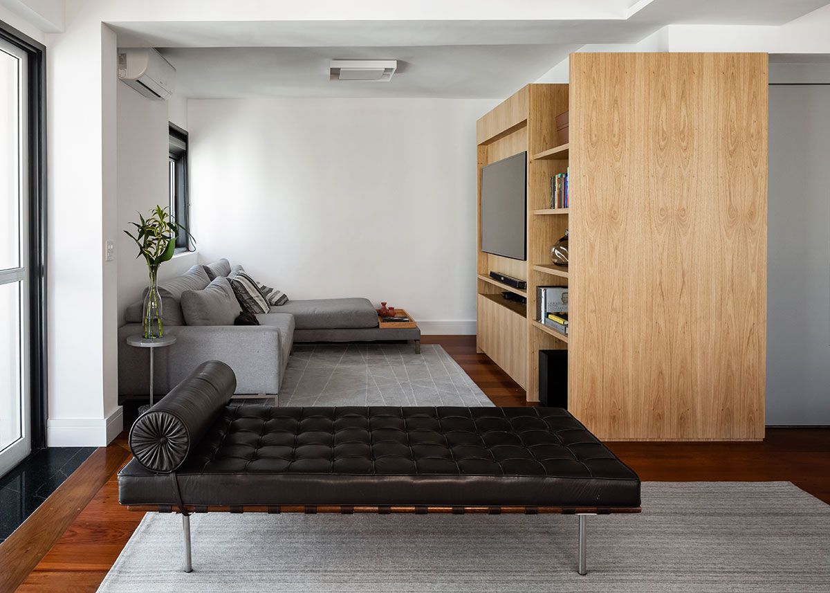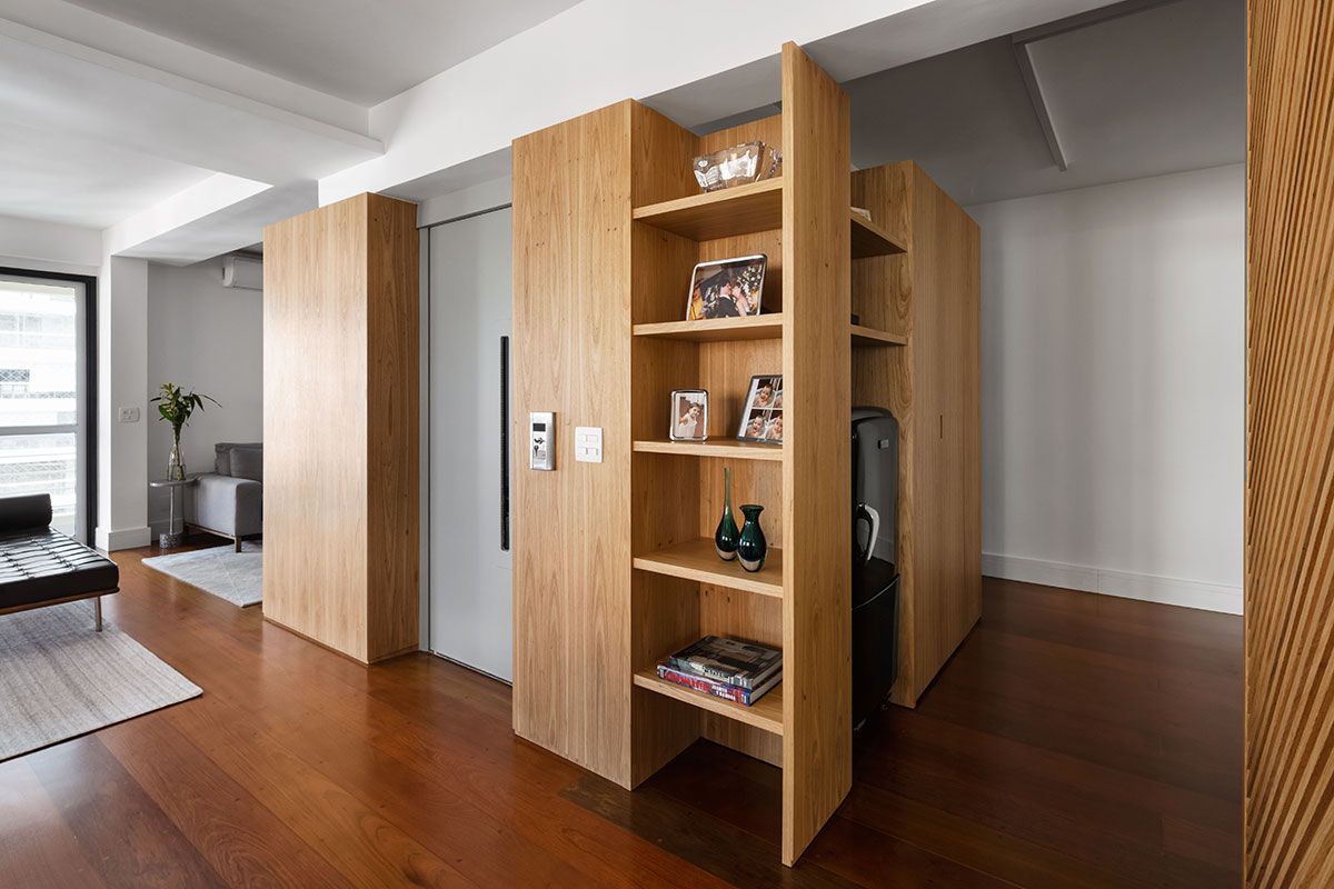 O principal desafio do escritório foi conseguir unificar a área de convívio e tentar tirar a impressão de ambientes segmentados que o apartamento tinha. Para isso, tiraram partido da caixa do elevador e a transformaram em um elemento funcional e principal do estar. Ao seu redor foi criada uma marcenaria que vai alterando o uso em cada lado: ora é estante para livros, ora armários e ora rack para o home theater.