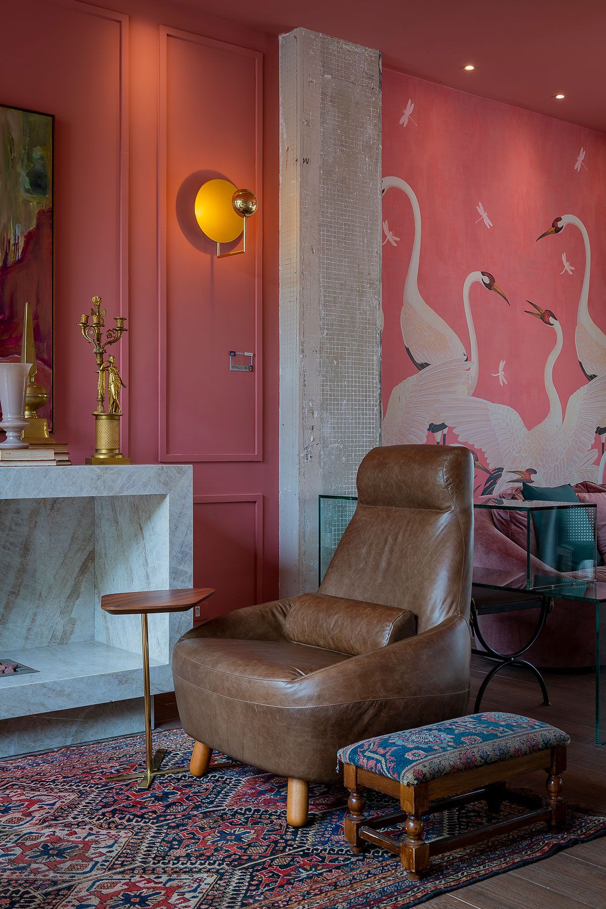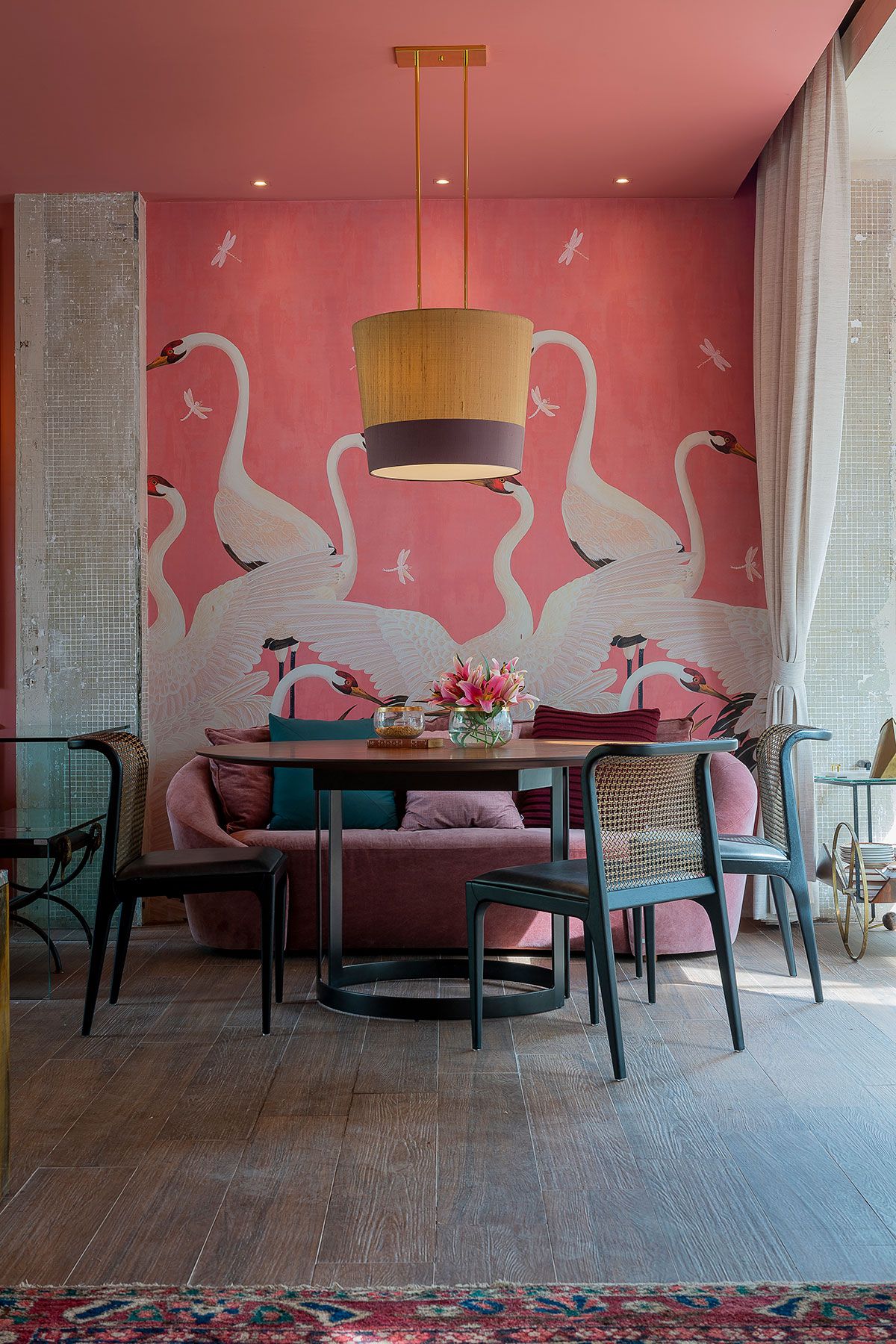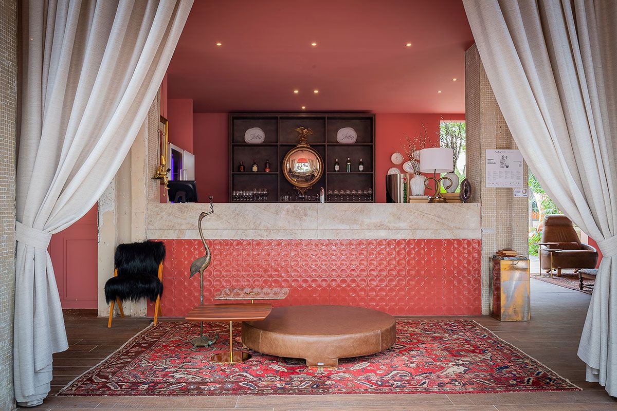 No ambiente interno, o rose veneziano foi à tonalidade escolhida tanto para as paredes quanto o teto. O layout é organizado simetricamente por dois sofás curvos em veludo de algodão, mesas de jacarandá e cadeiras em ébano e palhinha em arranjo circular com uma iluminação por pendentes de shantung de seda. Ao centro, o puff de couro matelassado junto às mesinhas de apoio em mármore convida para um aperitivo.